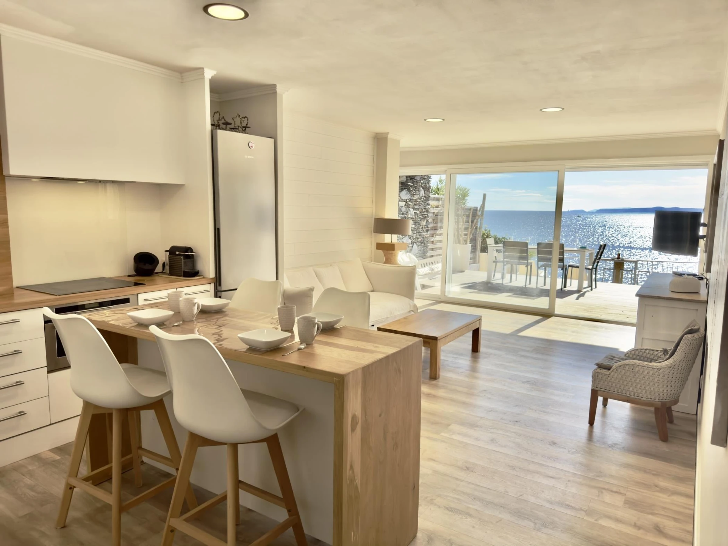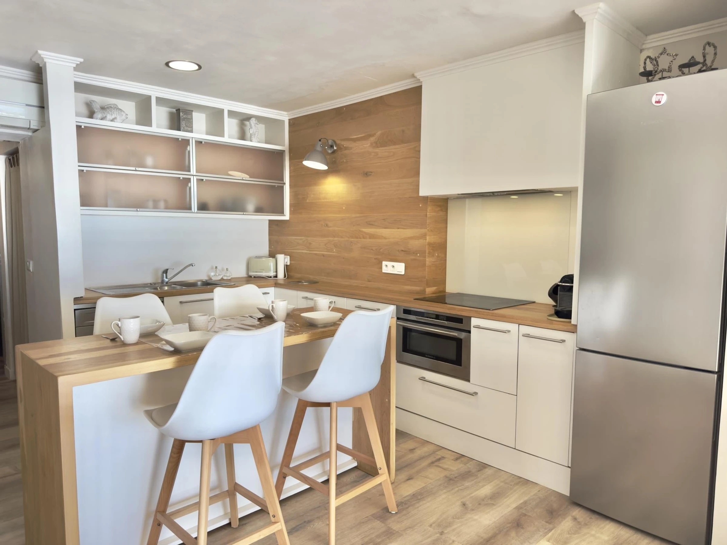 * Voll ausgestattete offene Küche mit Backofen, Mikrowelle, Geschirrspüler, Waschmaschine, Nespresso-Kaffeemaschine, Wasserkocher und allen notwendigen Utensilien