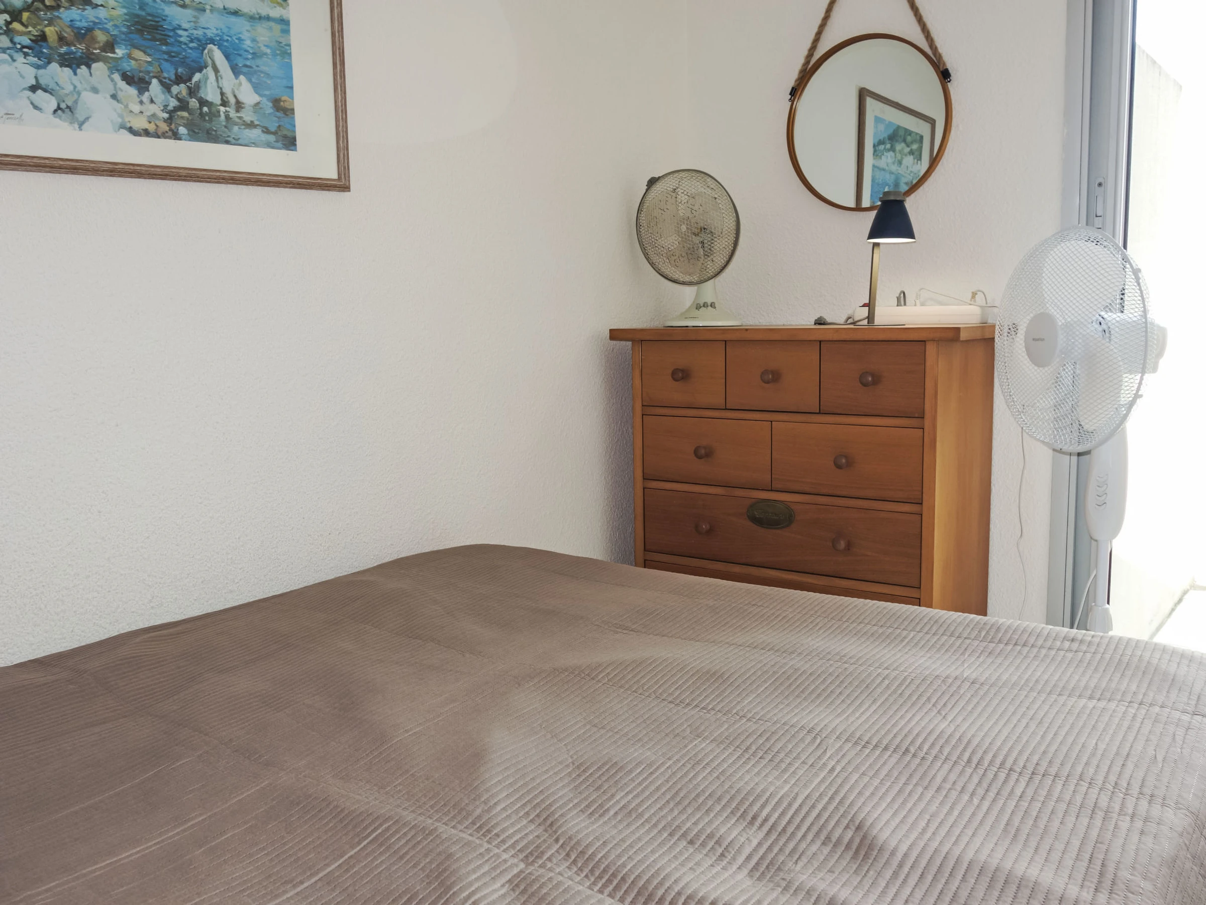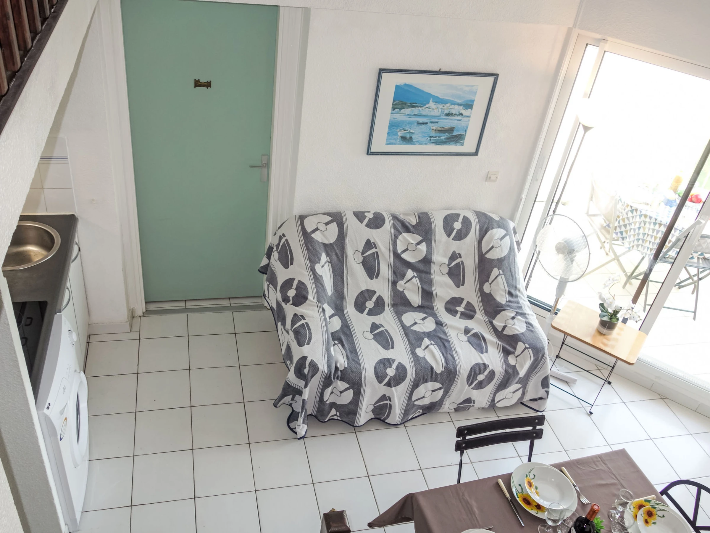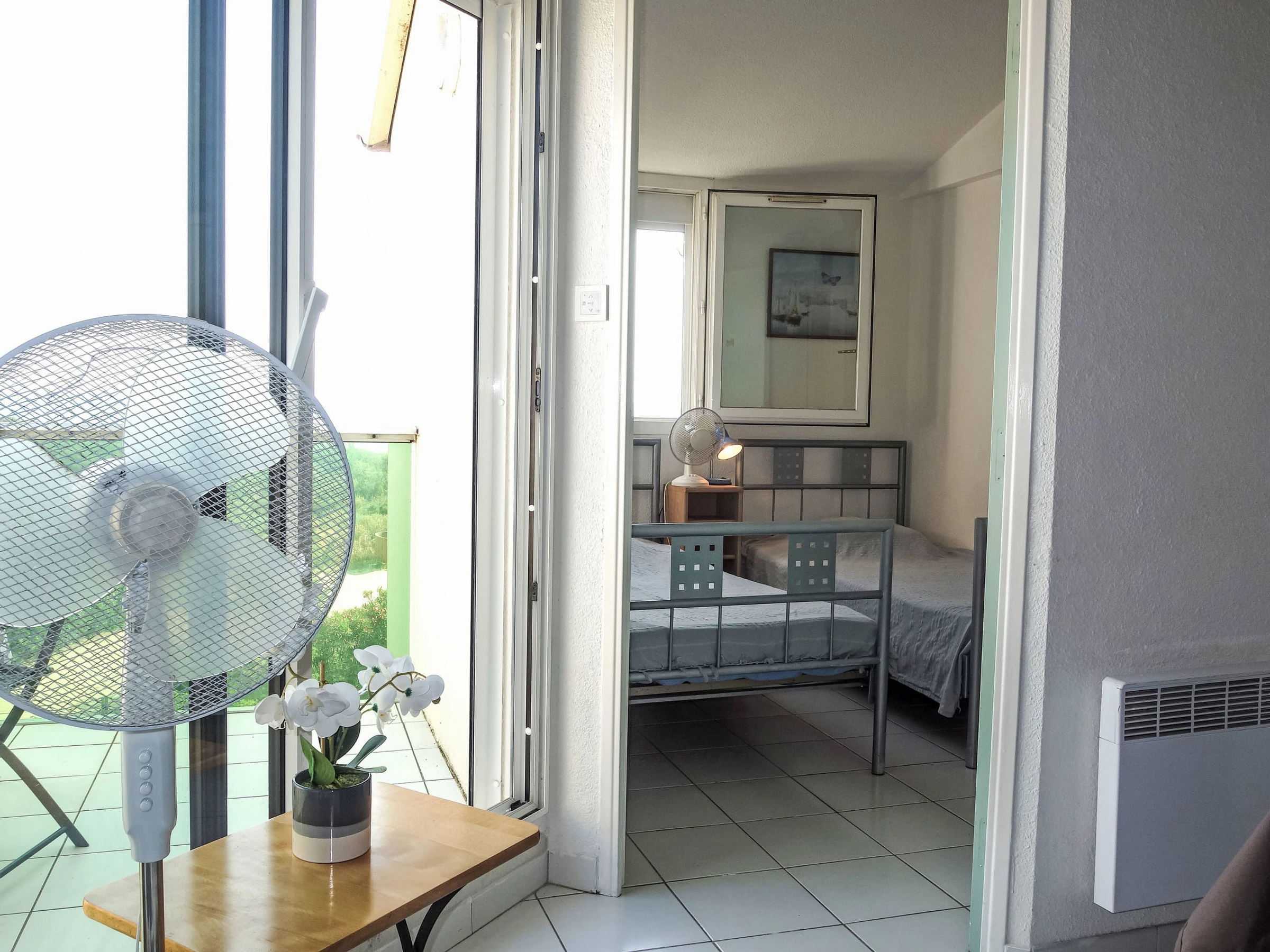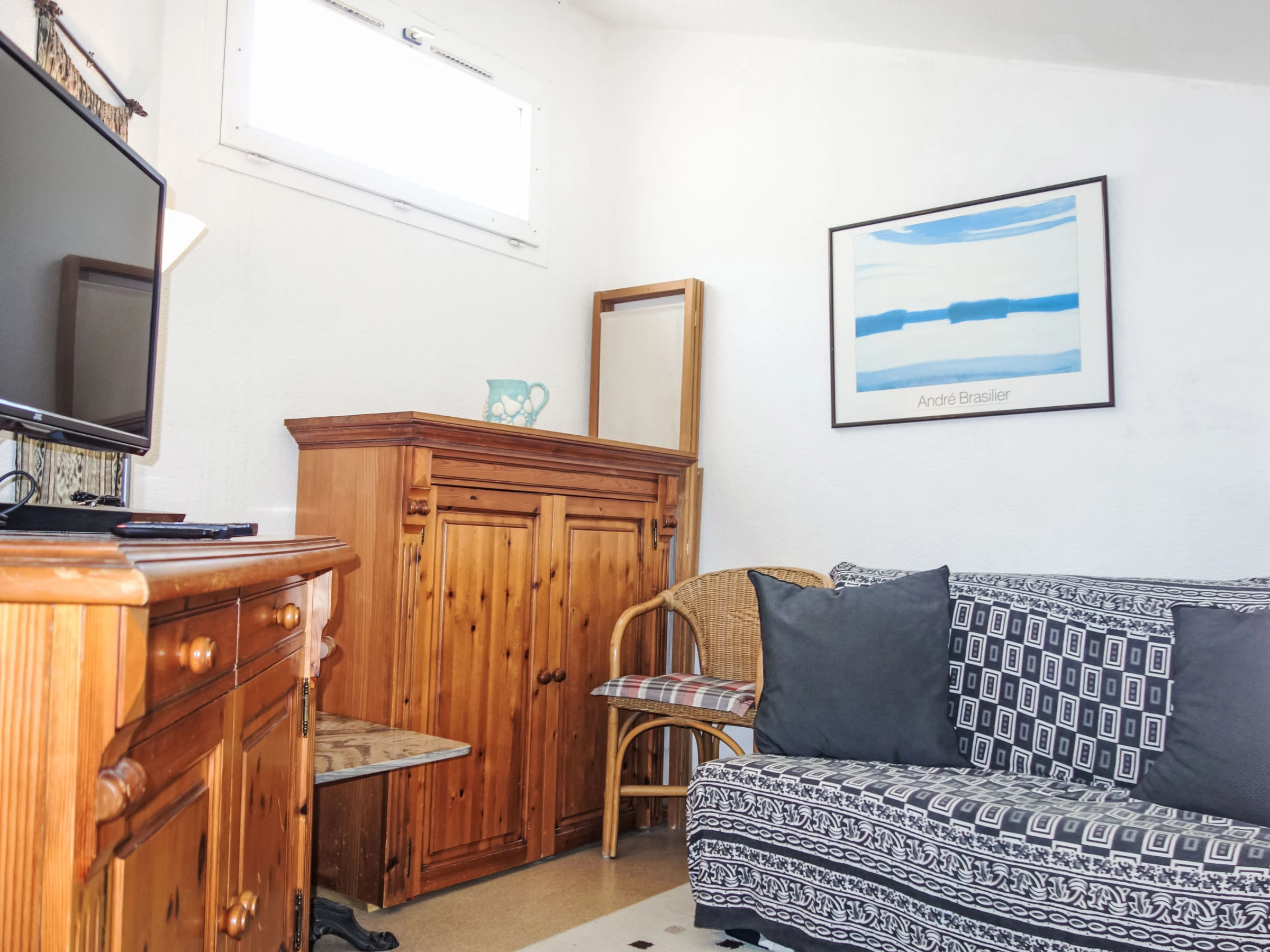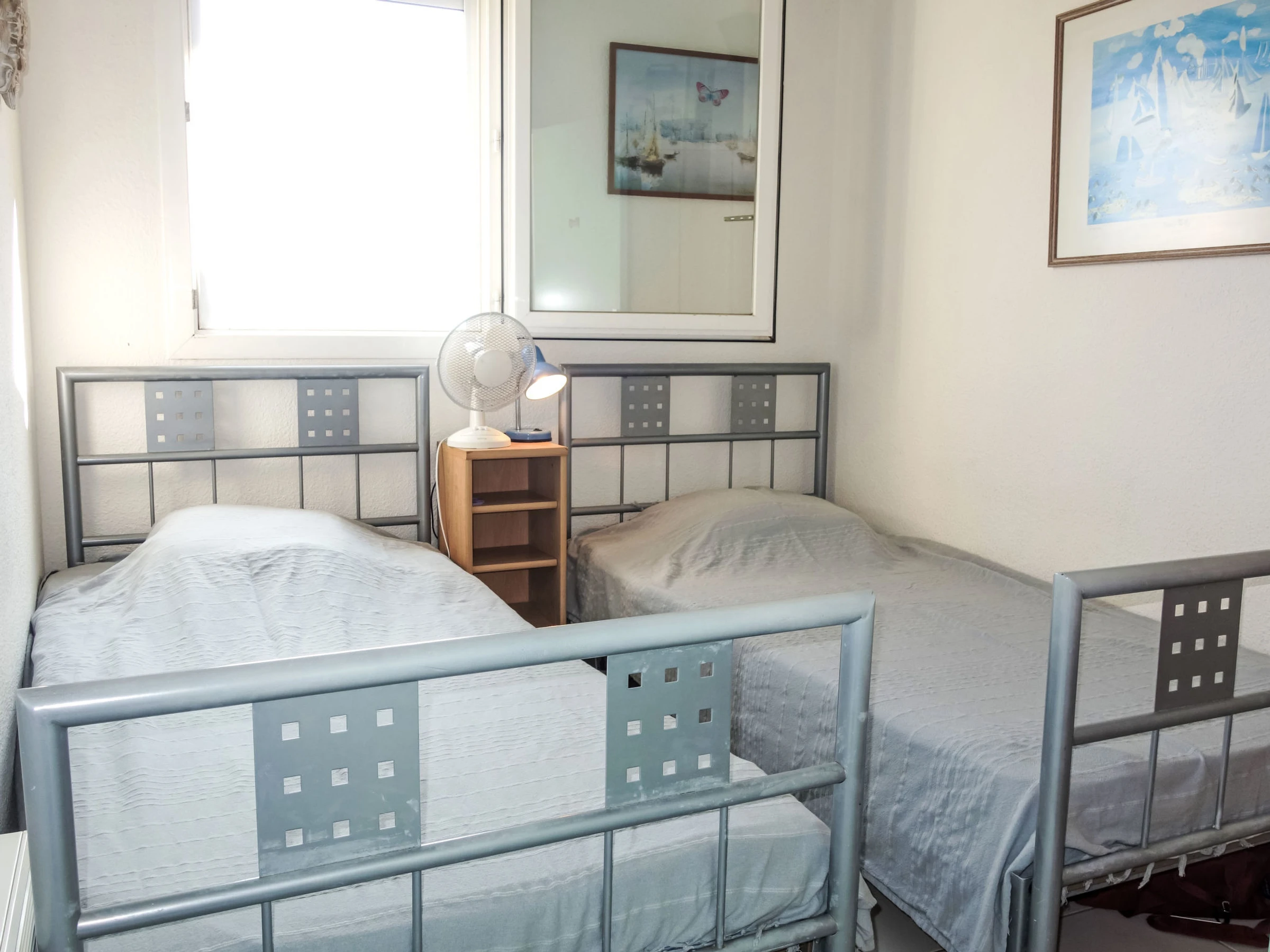 3-Zimmer-Wohnung 41 m2 auf 2 Stockwerken im 3. Stock. Wohn-/Esszimmer. Ausgang zur Terrasse. 1 Zimmer mit 1 franz. Bett (140 cm, Länge 190 cm). 1 Zimmer mit 2 Betten (90 cm, Länge 190 cm). Kochnische (3 Glaskeramikplatten, Toaster, Wasserkocher, Tiefkühler, elektrische Kaffeemaschine, Kombinationsmikrowelle). Dusche, sep. WC. E-Heizung. Obergeschoss: Galerie mit TV (Flachbildschirm). Terrasse 7 m2, Ostlage. Terrassenmöbel. Schöne Sicht auf das Meer. Zur Verfügung: Waschmaschine. Internet (WLAN, gratis). Parkplatz. Bitte beachten: Rauchmelder. Inserat einer Privatperson nach Artikel 155, IV, CGI.