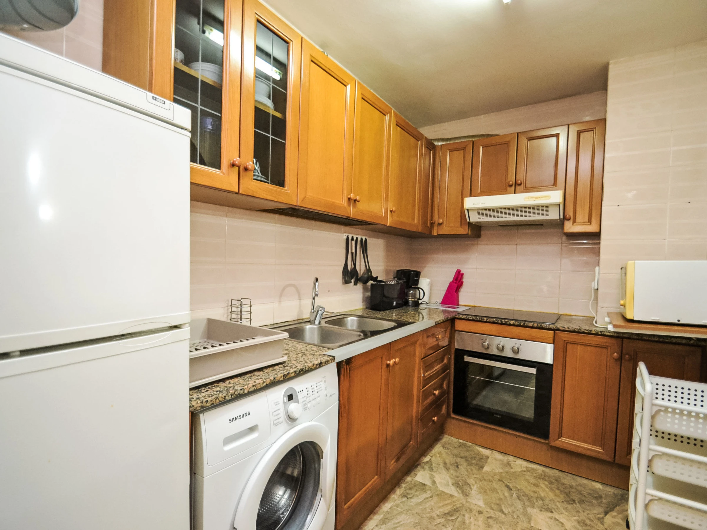 "Cala Dorada I", 2-Zimmer-Wohnung 40 m2 im 1. Stock. Zweckmässig eingerichtet: Wohn-/Esszimmer mit 1 Diwanbett (122 cm, Länge 200 cm), Digital-TV. Ausgang zur Terrasse mit Esstisch. 1 Zimmer mit 1 franz. Bett (150 cm, Länge 190 cm), Digital-TV. Offene Küche (Backofen, 3 Glaskeramikplatten, Toaster, Wasserkocher, Mikrowelle, elektrische Kaffeemaschine, Kapseln für die Kaffeemaschine (L'or) extra) mit Boiler (50 Liter). Bad/WC. Klimaanlage. Heizung nicht in allen Räumen. Terrasse. Terrassenmöbel, Liegestühle (2). Seitliche Fernsicht auf das Meer. Zur Verfügung: Waschmaschine, Bügeleisen, Haartrockner. Internet (WLAN, gratis). [hidden] // Reg. Nr.: ESFCTU00004302400042545300000000000000[hidden]-328