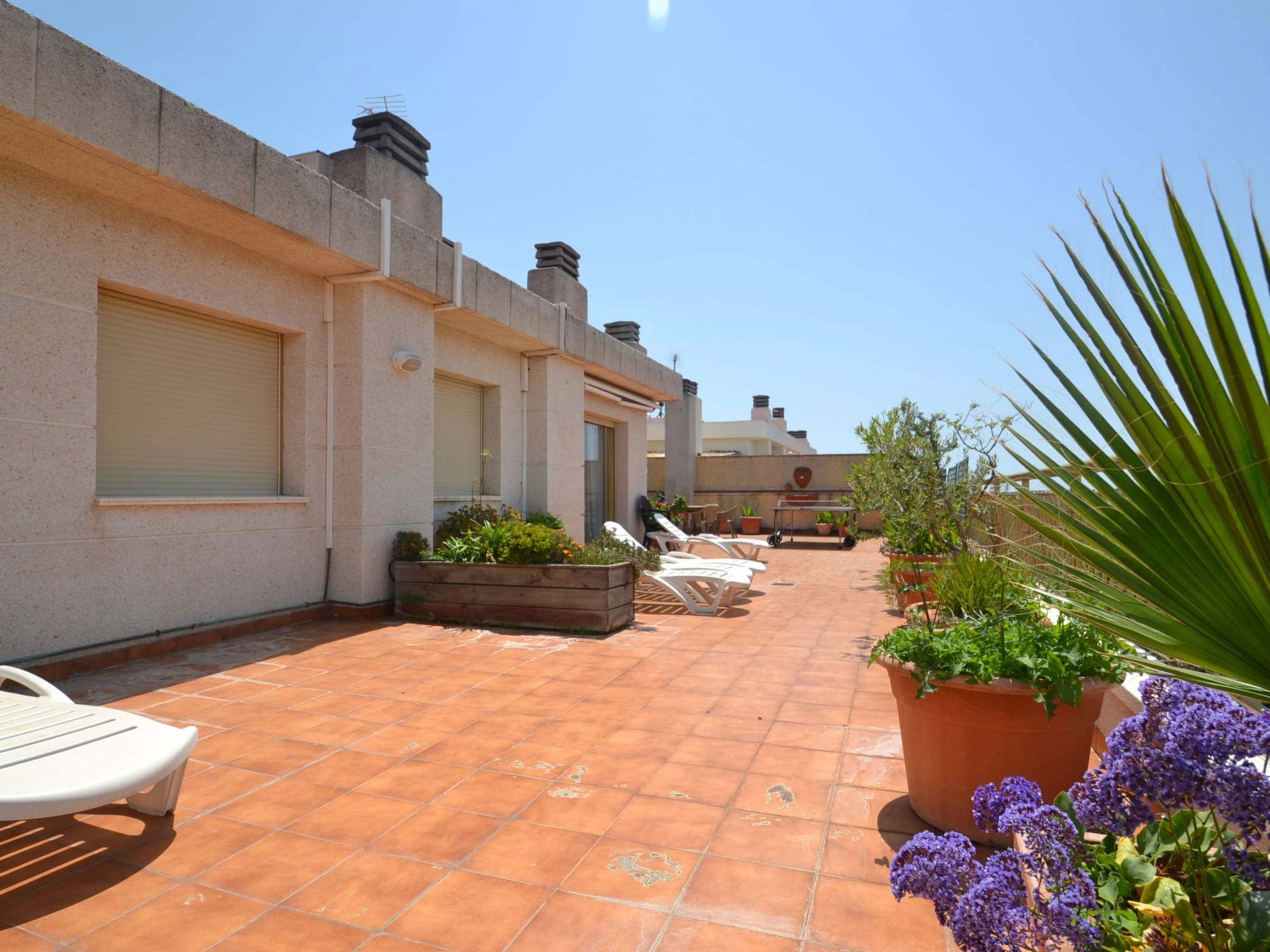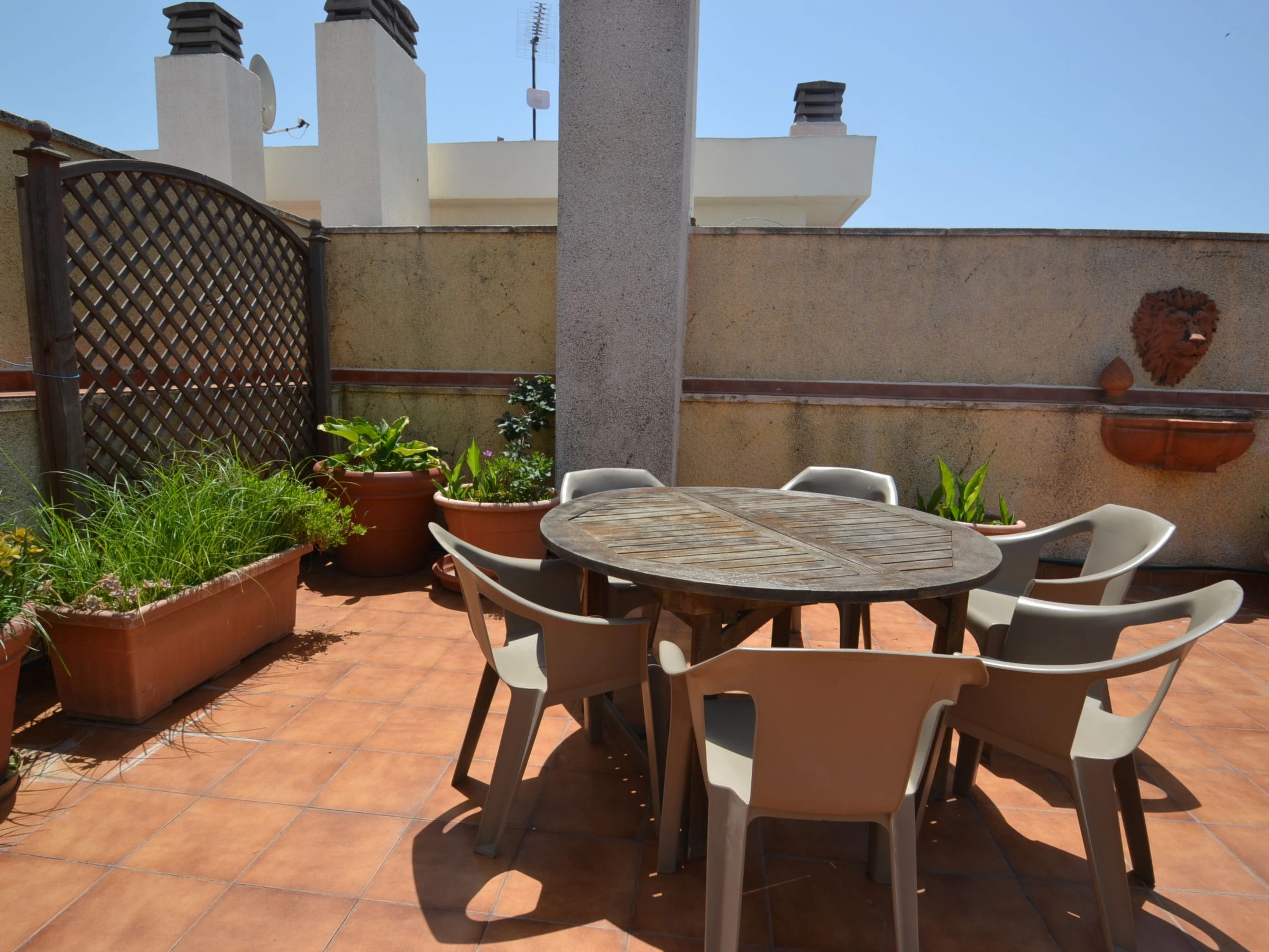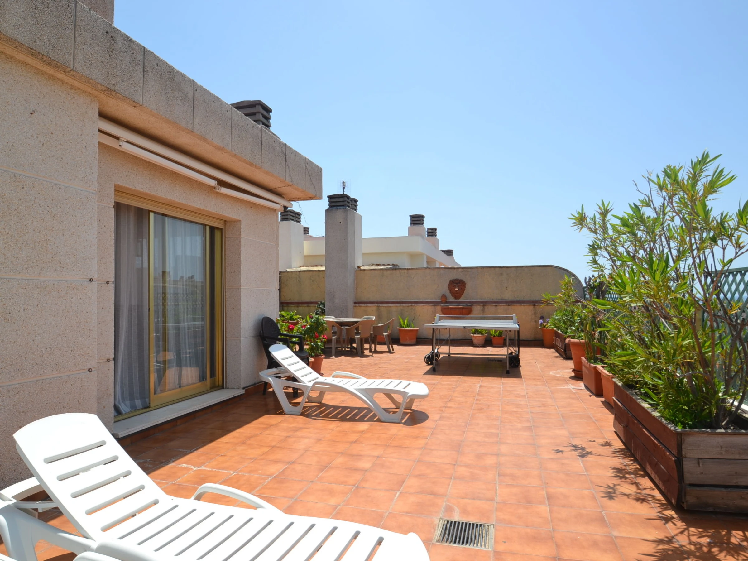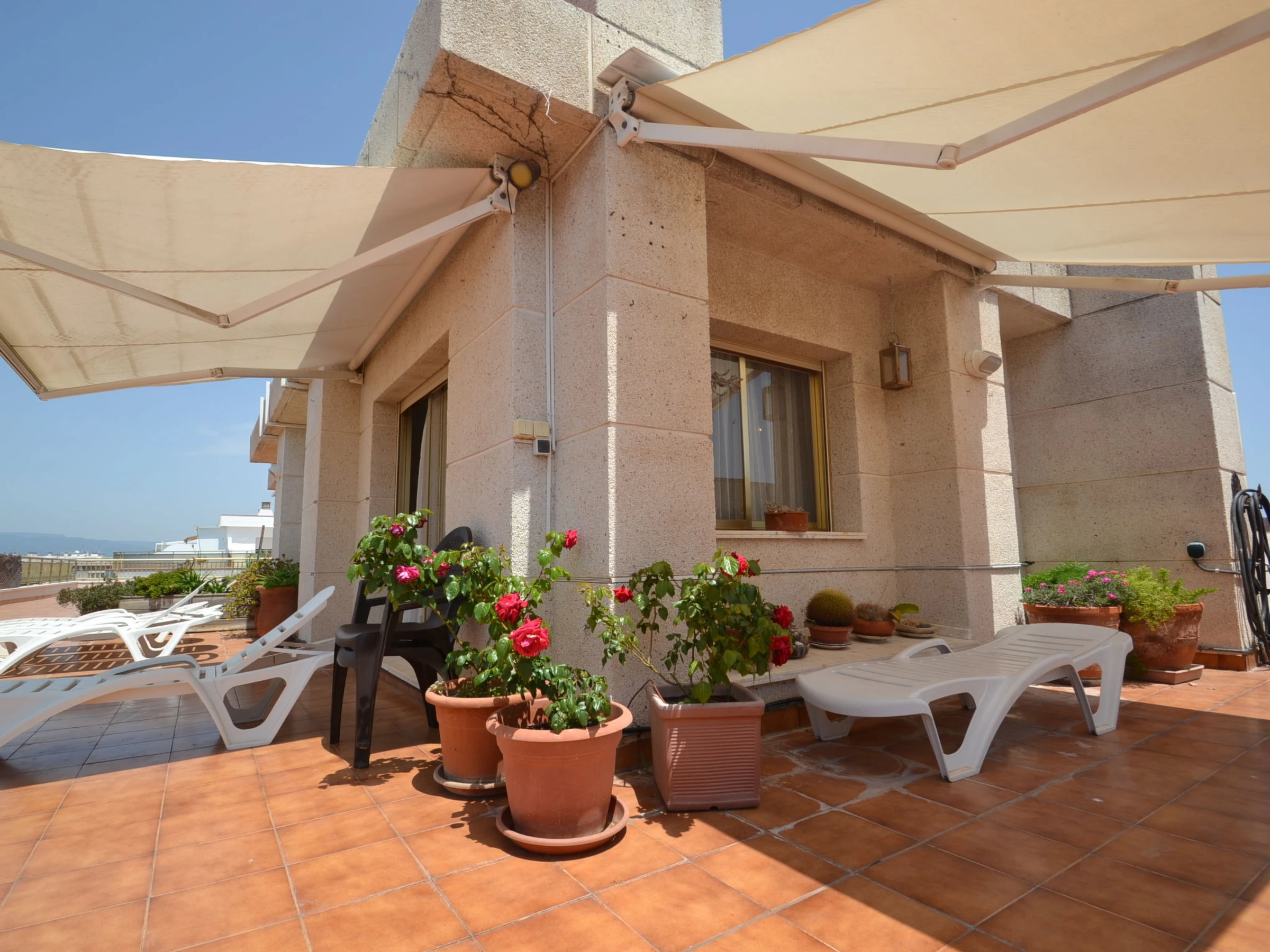 "Indasol", 4-Zimmer-Attikawohnung 80 m2. Objekt geeignet für 6 Erwachsene. Zweckmässig und komfortabel eingerichtet: Wohn-/Esszimmer mit 1 Doppeldiwanbett, Sat-TV und Digital-TV. Ausgang zur Terrasse. 1 Zimmer mit 1 franz. Bett (135 cm, Länge 190 cm), Klimaanlage und Ventilator. Ausgang zur Terrasse. 2 Zimmer, jedes Zimmer mit 2 Betten (90 cm, Länge 190 cm), Klimaanlage und Ventilator. Küche (4 Kochplatten, Backofen, Toaster, Wasserkocher, Mikrowelle, elektrische Kaffeemaschine). Ausgang zur Terrasse. Dusche/WC, sep. WC. Heizung nicht in allen Räumen. Grosse Terrasse 200 m2. Terrassenmöbel, Gartengrill, Liegestühle. Sicht auf die Stadt. Zur Verfügung: Waschmaschine, Bügeleisen, Haartrockner. Internet (WLAN, gratis). Bitte beachten: Nichtraucher-Unterkunft. [hidden] // Reg. Nr.: ESFCTU00004302400044917600000000000000000[hidden]5