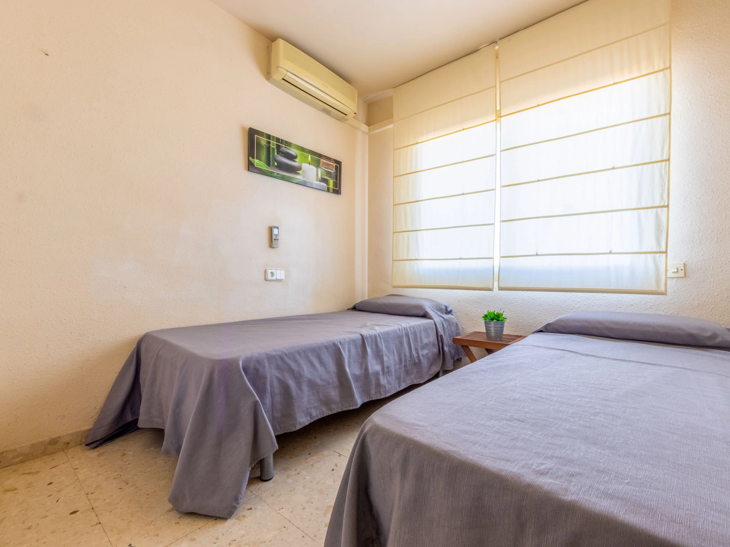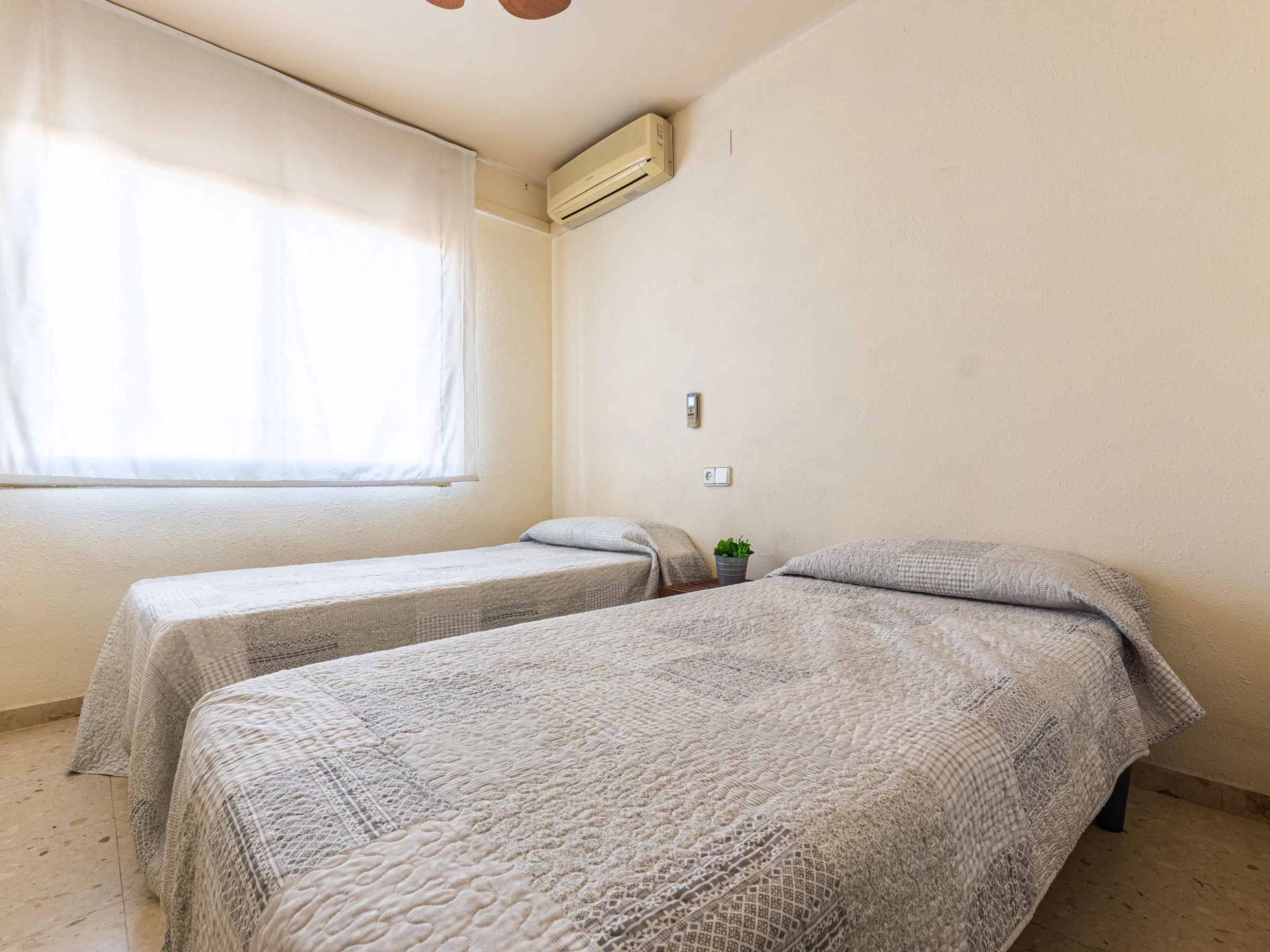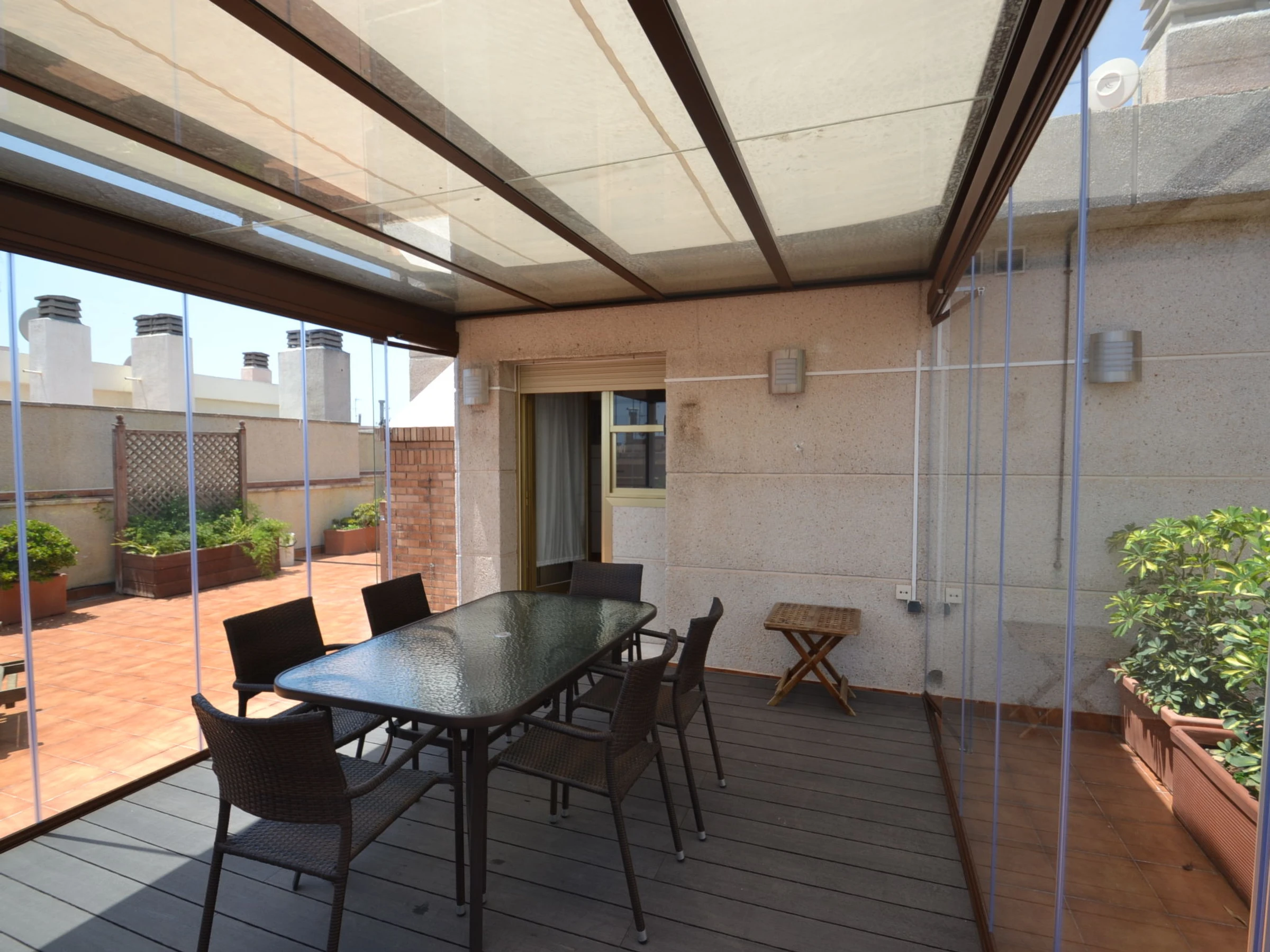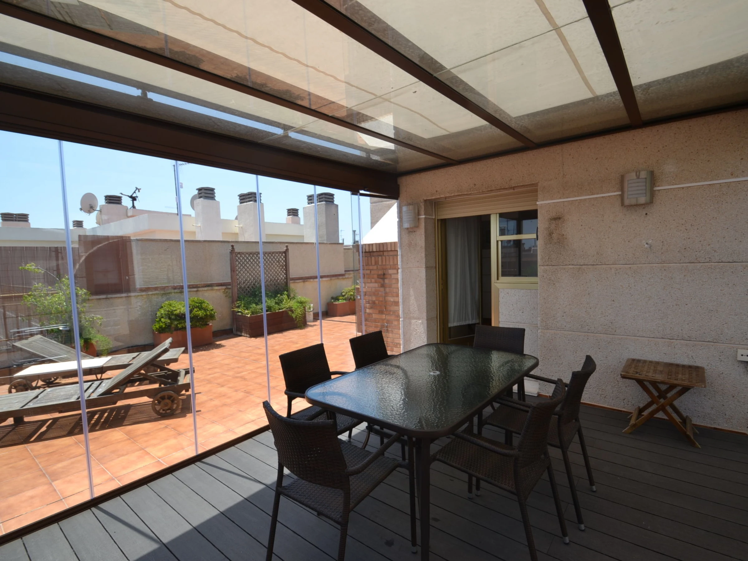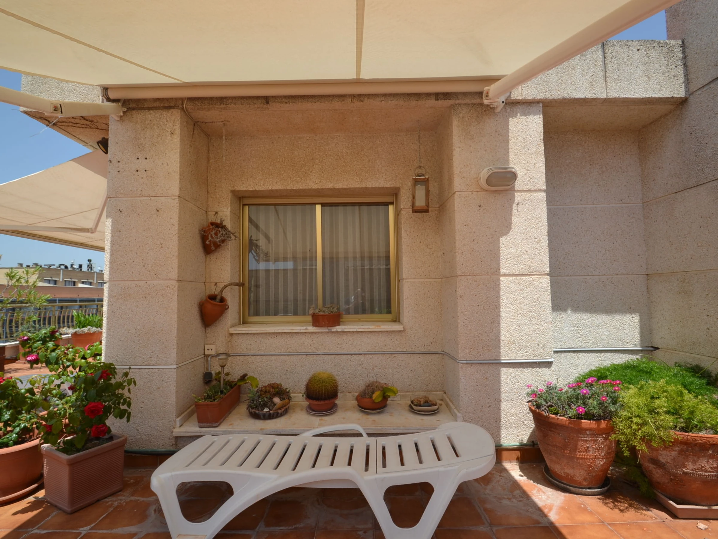 "Indasol", 4-Zimmer-Attikawohnung 80 m2. Objekt geeignet für 6 Erwachsene. Zweckmässig und komfortabel eingerichtet: Wohn-/Esszimmer mit 1 Doppeldiwanbett, Sat-TV und Digital-TV. Ausgang zur Terrasse. 1 Zimmer mit 1 franz. Bett (135 cm, Länge 190 cm), Klimaanlage und Ventilator. Ausgang zur Terrasse. 2 Zimmer, jedes Zimmer mit 2 Betten (90 cm, Länge 190 cm), Klimaanlage und Ventilator. Küche (4 Kochplatten, Backofen, Toaster, Wasserkocher, Mikrowelle, elektrische Kaffeemaschine). Ausgang zur Terrasse. Dusche/WC, sep. WC. Heizung nicht in allen Räumen. Grosse Terrasse 200 m2. Terrassenmöbel, Gartengrill, Liegestühle. Sicht auf die Stadt. Zur Verfügung: Waschmaschine, Bügeleisen, Haartrockner. Internet (WLAN, gratis). Bitte beachten: Nichtraucher-Unterkunft. [hidden] // Reg. Nr.: ESFCTU00004302400044917600000000000000000[hidden]5