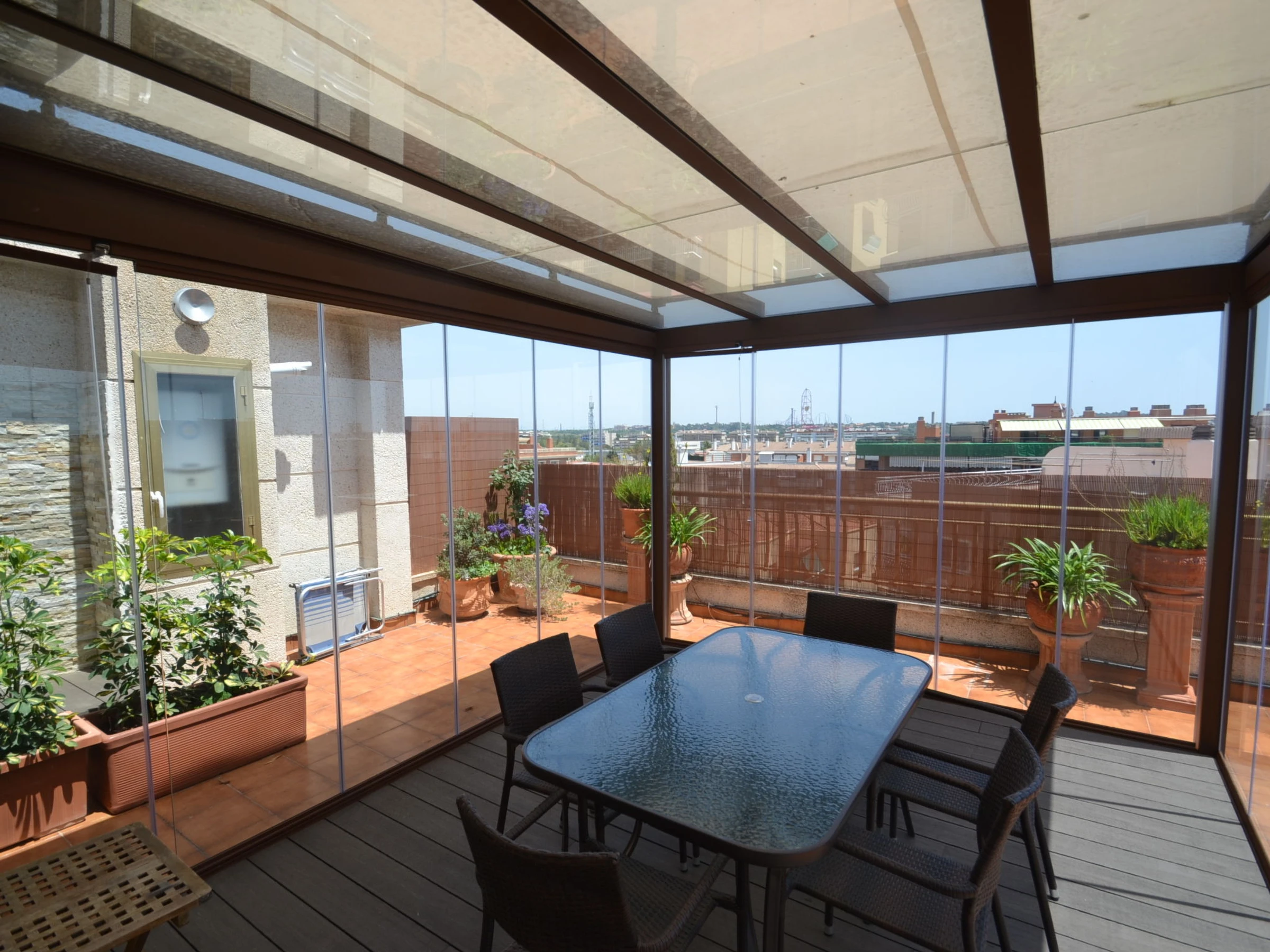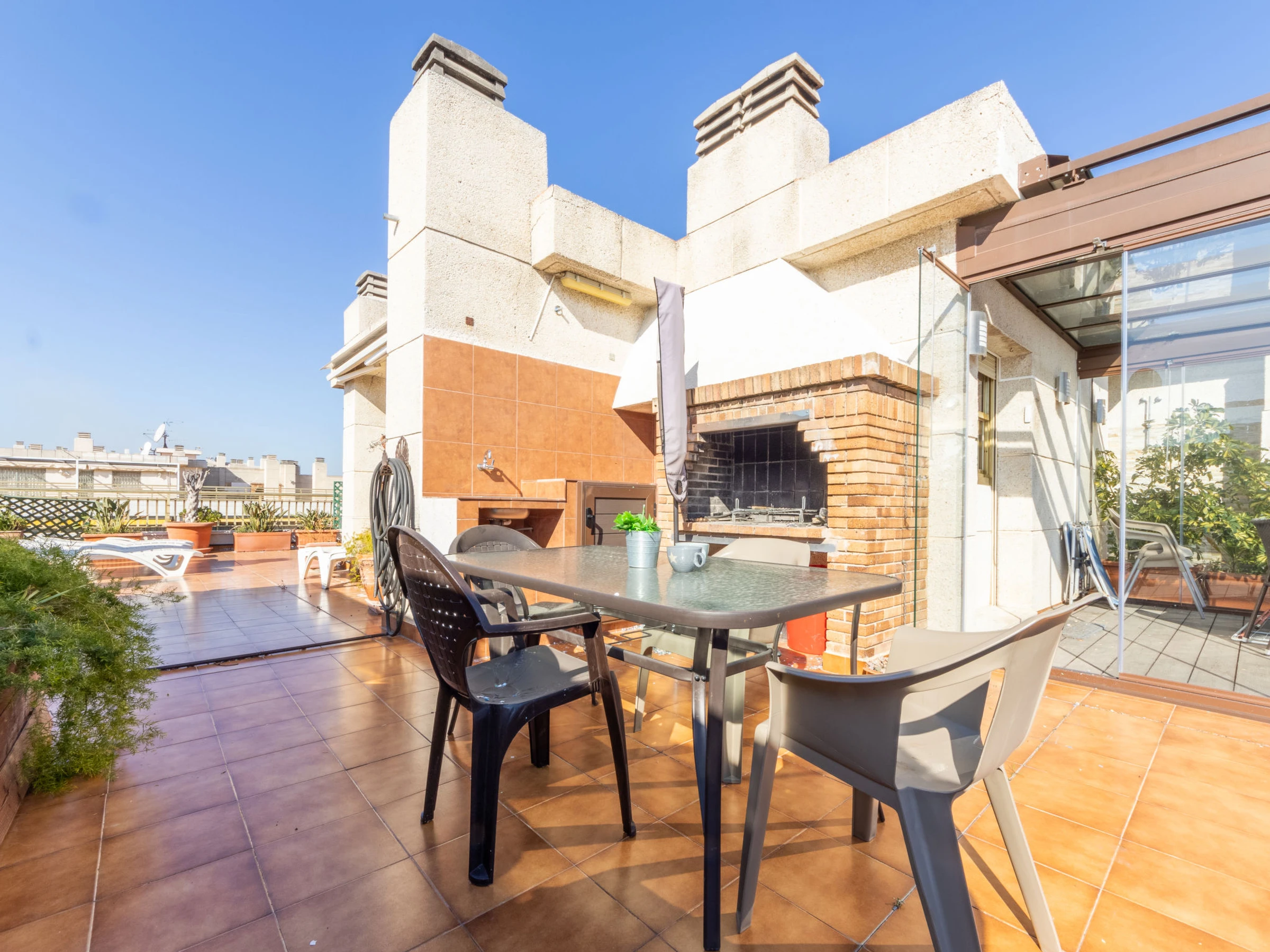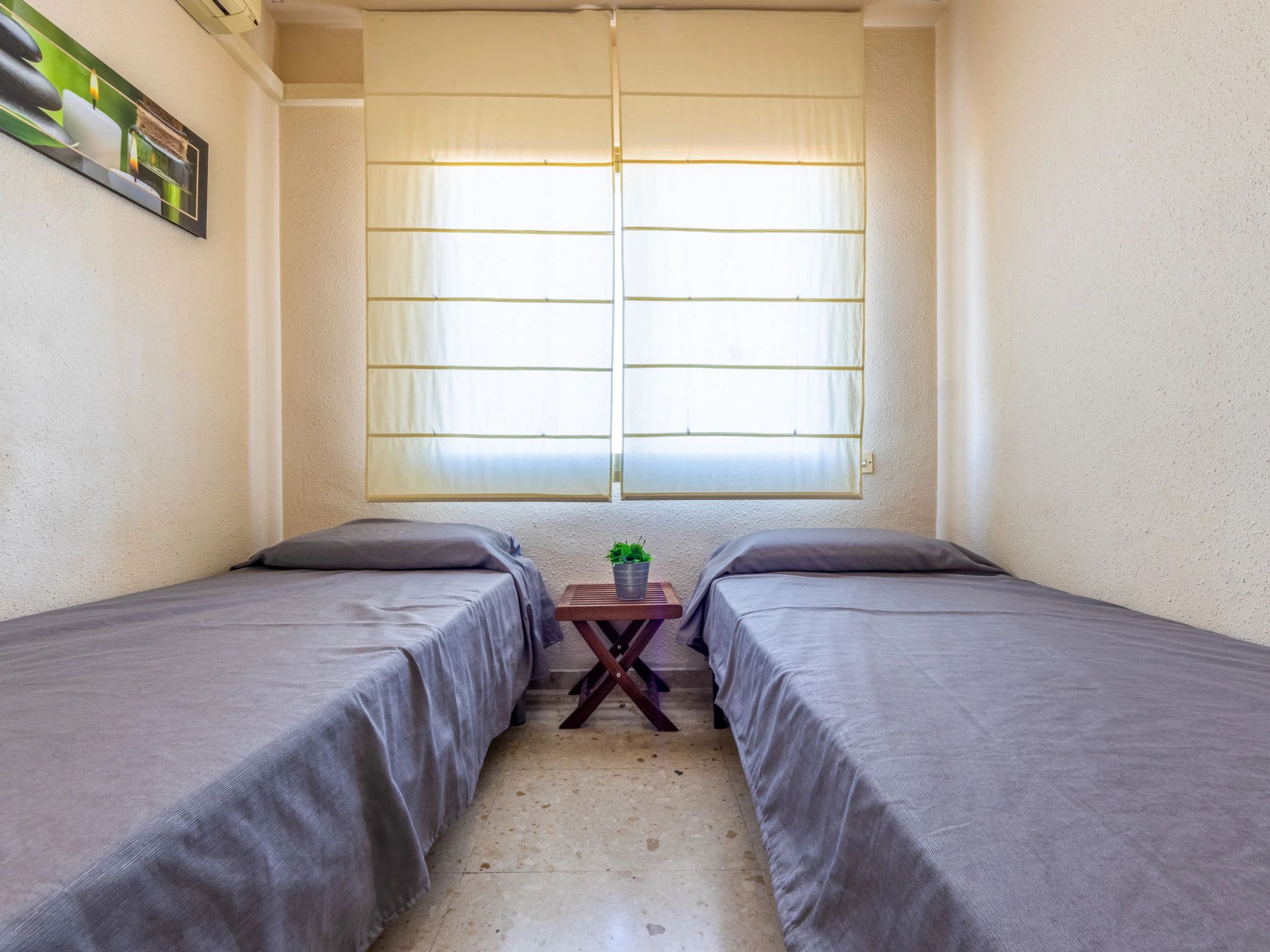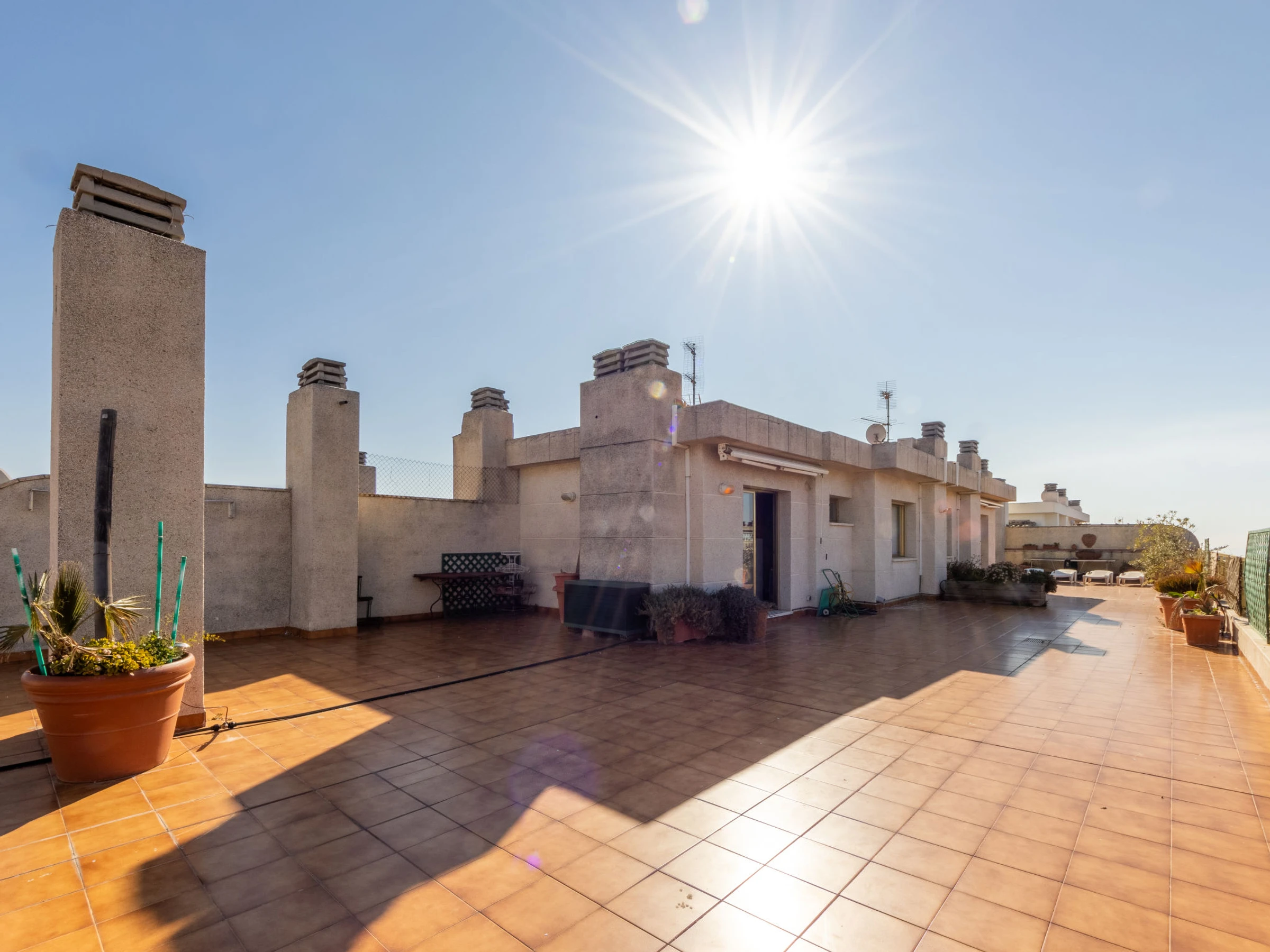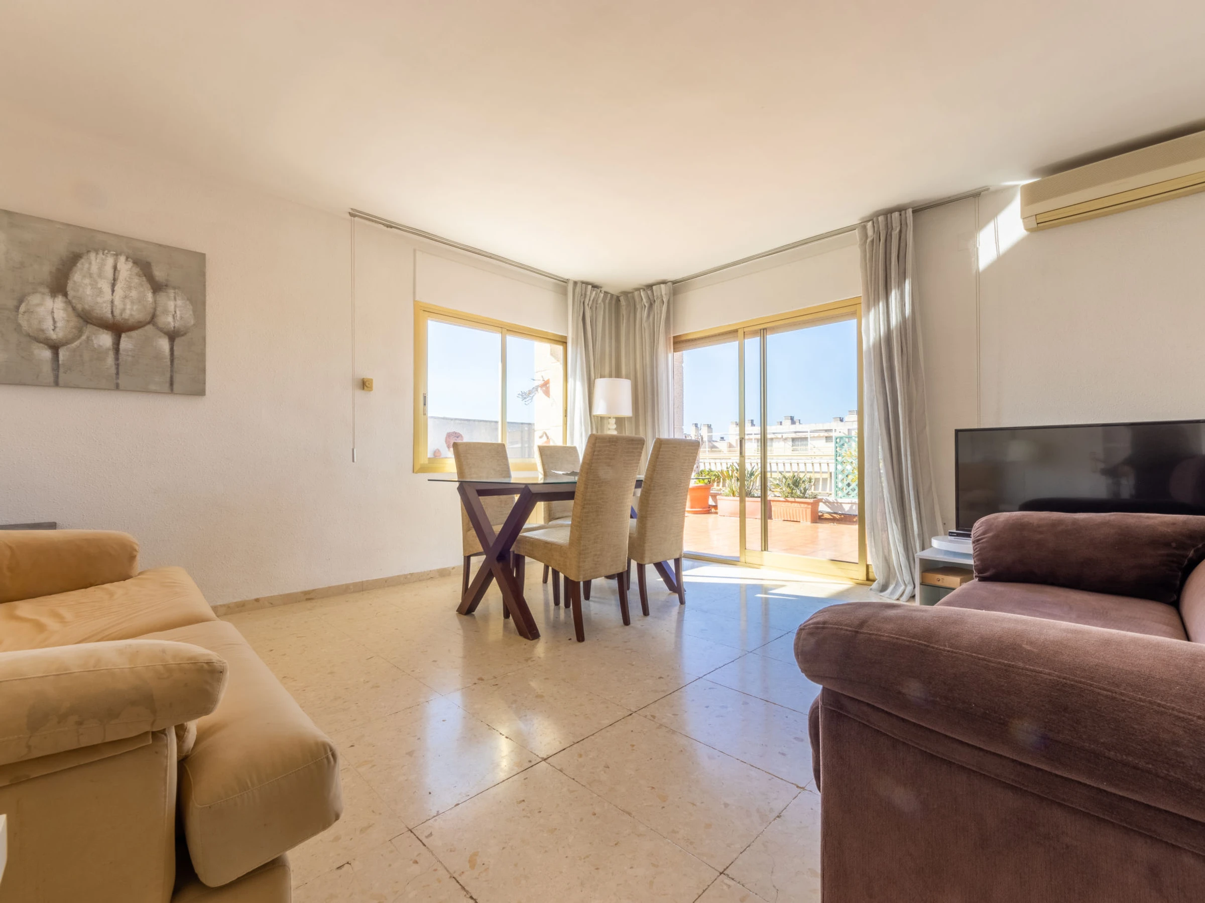 "Indasol", 4-Zimmer-Attikawohnung 80 m2. Objekt geeignet für 6 Erwachsene. Zweckmässig und komfortabel eingerichtet: Wohn-/Esszimmer mit 1 Doppeldiwanbett, Sat-TV und Digital-TV. Ausgang zur Terrasse. 1 Zimmer mit 1 franz. Bett (135 cm, Länge 190 cm), Klimaanlage und Ventilator. Ausgang zur Terrasse. 2 Zimmer, jedes Zimmer mit 2 Betten (90 cm, Länge 190 cm), Klimaanlage und Ventilator. Küche (4 Kochplatten, Backofen, Toaster, Wasserkocher, Mikrowelle, elektrische Kaffeemaschine). Ausgang zur Terrasse. Dusche/WC, sep. WC. Heizung nicht in allen Räumen. Grosse Terrasse 200 m2. Terrassenmöbel, Gartengrill, Liegestühle. Sicht auf die Stadt. Zur Verfügung: Waschmaschine, Bügeleisen, Haartrockner. Internet (WLAN, gratis). Bitte beachten: Nichtraucher-Unterkunft. [hidden] // Reg. Nr.: ESFCTU00004302400044917600000000000000000[hidden]5
