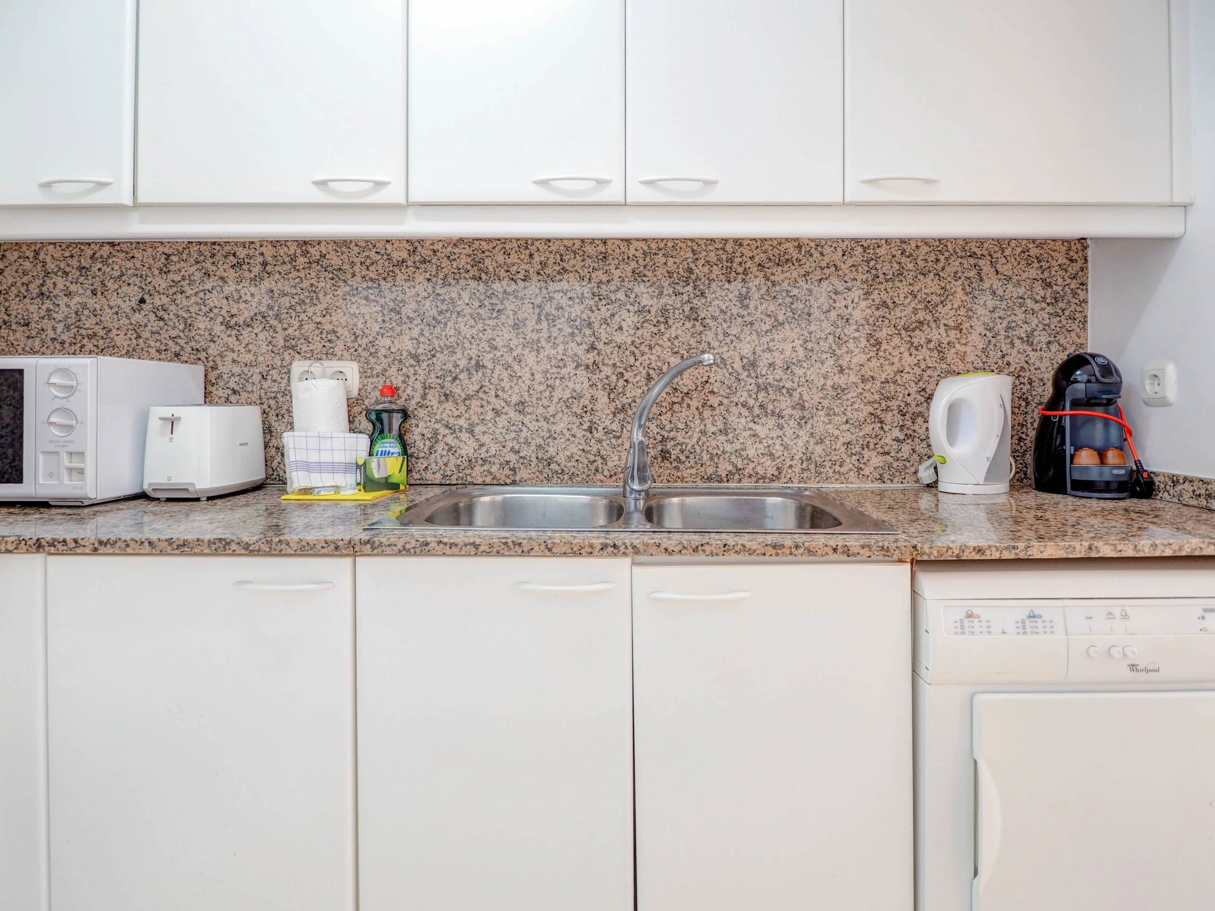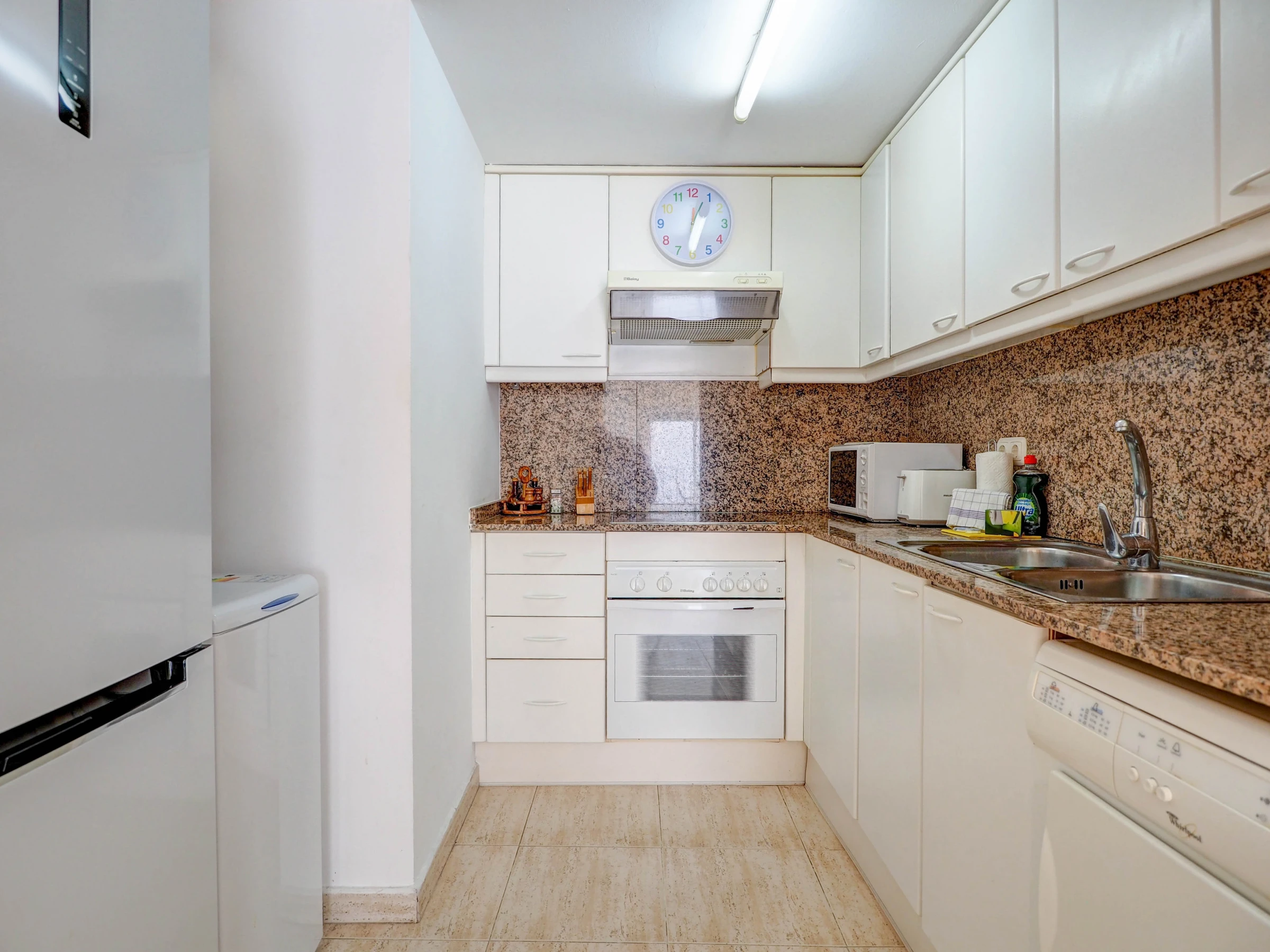 Dieses küche, ist ausgestattet in kühlschrank, mikrowelle, backofen, gefrierschrank, geschirr/besteck, kochutensilien, kaffeemaschine, toaster und wasserkocher.