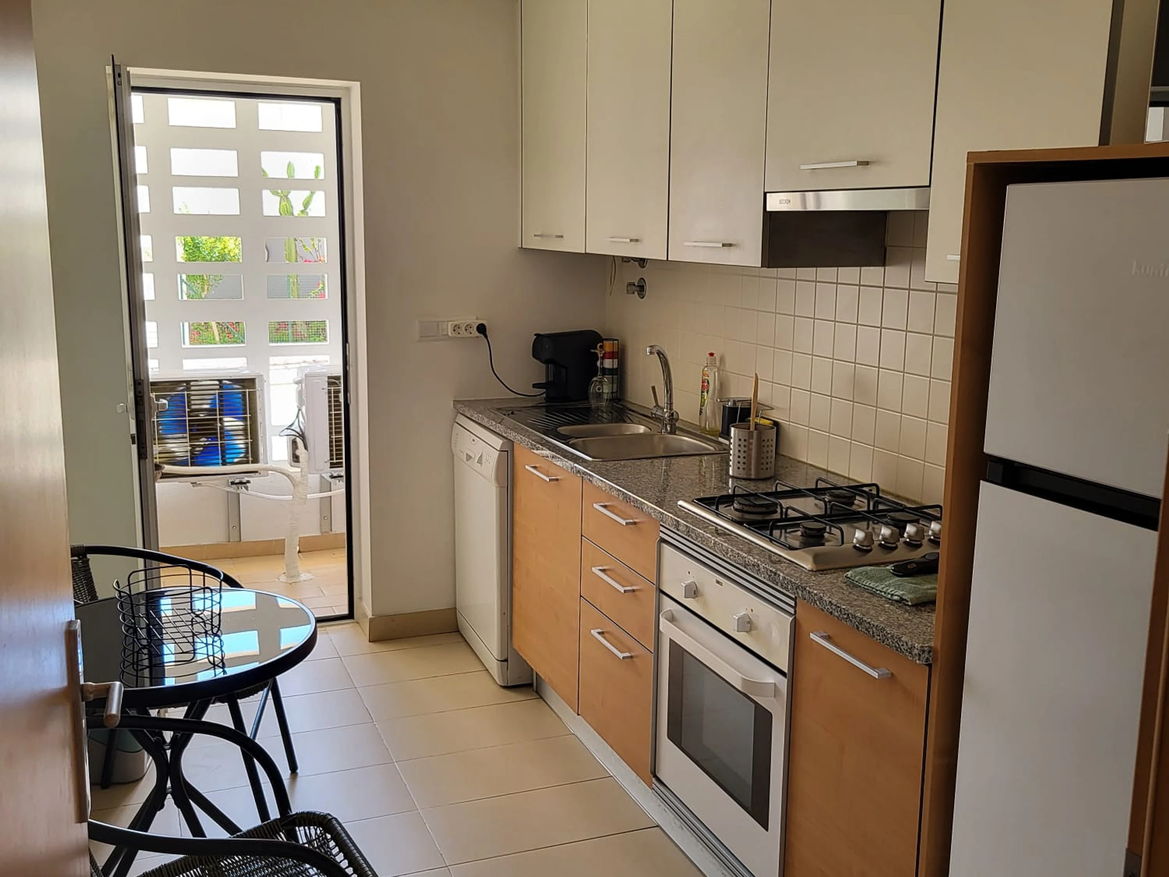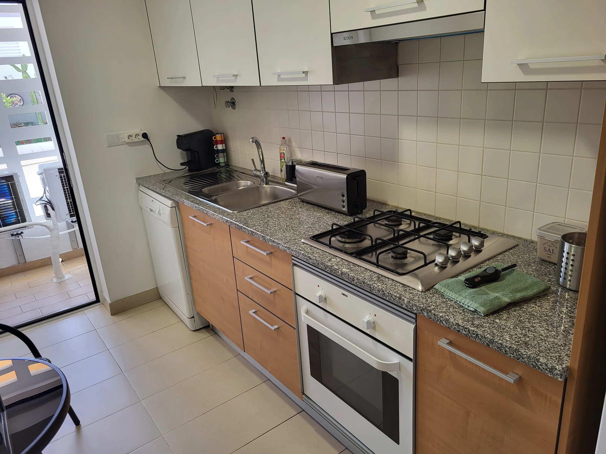 Die Separate Küche mit Gas-Kochfeld ist ausgestattet in einen Kühlschrank, eine Mikrowelle, ein Backofen, Gefrierschrank, eine Spülmaschine, Geschirr/Besteck, Kochutensilien, eine Kaffeemaschine und einen Toaster.