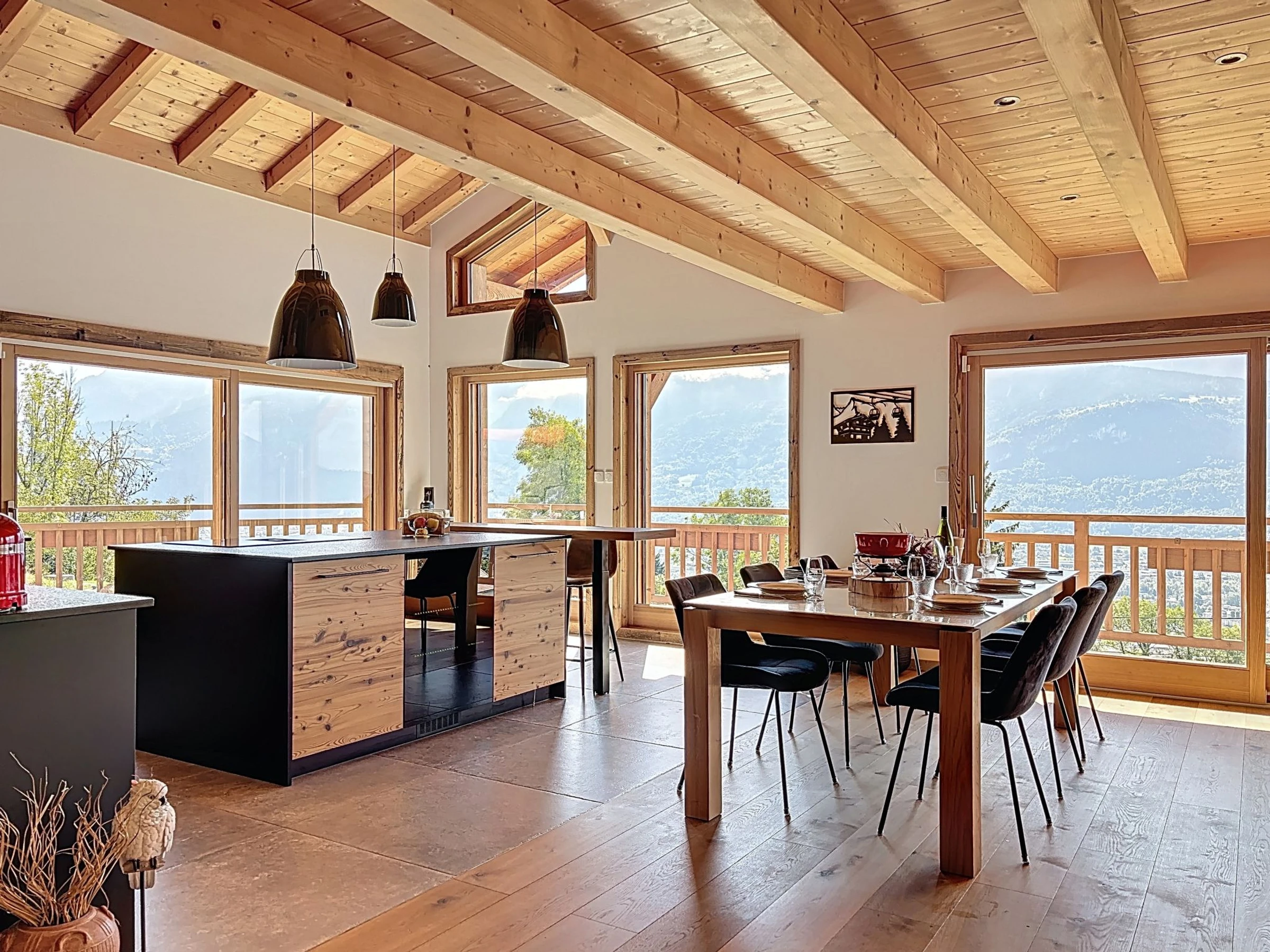 5-Zimmer-Chalet 180 m2 auf 2 Stockwerken. Luxuriös und geschmackvoll eingerichtet: Wohn-/Esszimmer mit offenem Kamin, TV, Heimkino und elektrischem Rollladen. Ausgang zur Terrasse, Richtung Südwesten. 1 Zimmer mit 1 Doppelbett (160 cm, Länge 200 cm), Dusche. Ausgang zum Garten. Grosse, offene Küche (Geschirrspüler, 4 Induktionskochplatten, Toaster, Wasserkocher, elektrische Kaffeemaschine, Kapseln für die Kaffeemaschine (Nespresso) extra, Racletteofen, Kochinsel, Kombinationsmikrowelle, Fondue Set (Käse)) mit Esstisch. Sep. WC. Bodenheizung, Boiler. Unteres Geschoss: grosser Eingang. Obergeschoss: Galerie. 1 Zimmer mit 1 Doppelbett (160 cm, Länge 200 cm). 1 Zimmer mit 1 Doppelbett (160 cm, Länge 200 cm). Bad/Dusche, sep. WC. Grosse Terrasse 10 m2, Südwestlage. Terrassenmöbel, Gartengrill. Sehr schöne Panoramasicht auf die Berge und das Tal. Zur Verfügung: Waschmaschine, Wäschetrockner, Safe, Bügeleisen, Kinderhochstuhl, Babybett, Haartrockner. Internet (WLAN, gratis). Garage (2 Autos). Bitte beachten: Nichtraucher-Unterkunft. Rauchmelder, kein Fahrstuhl. Inserat einer Privatperson nach Artikel 155, IV, CGI.