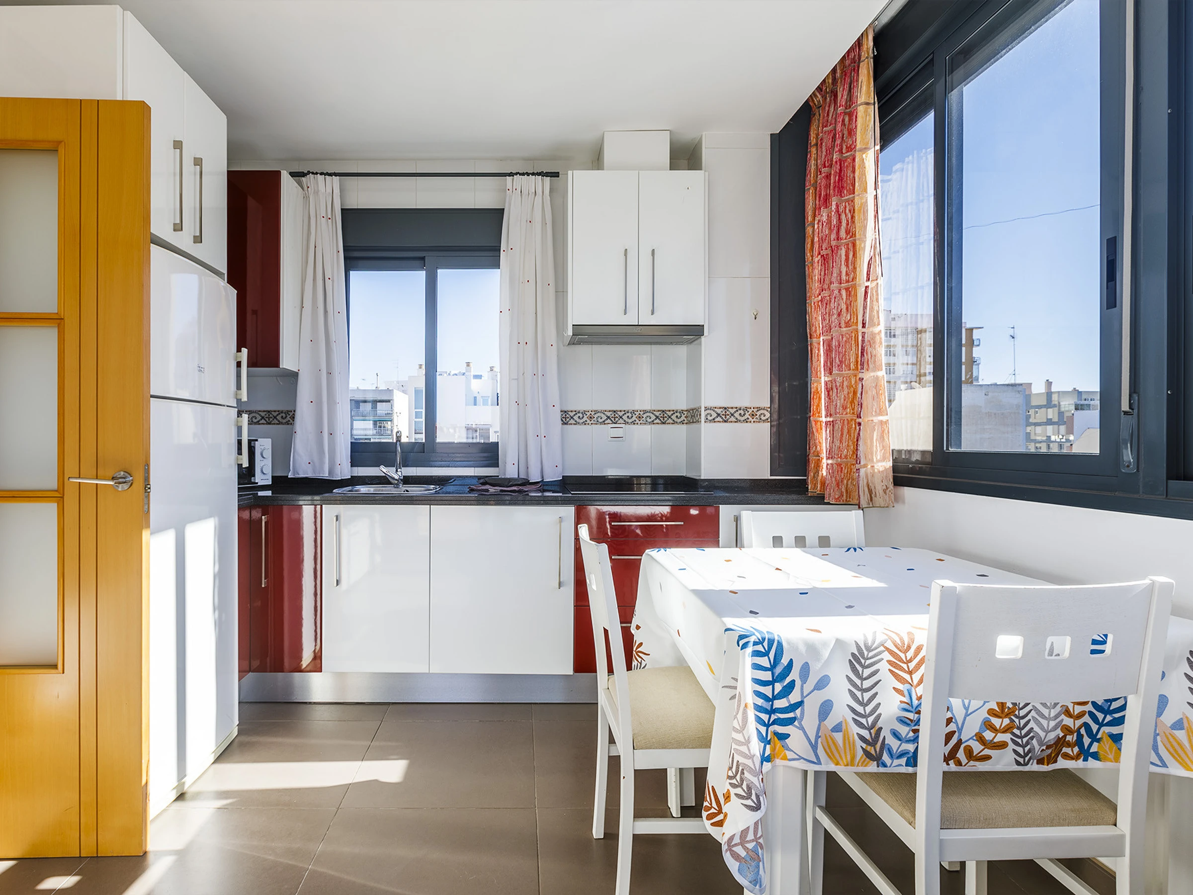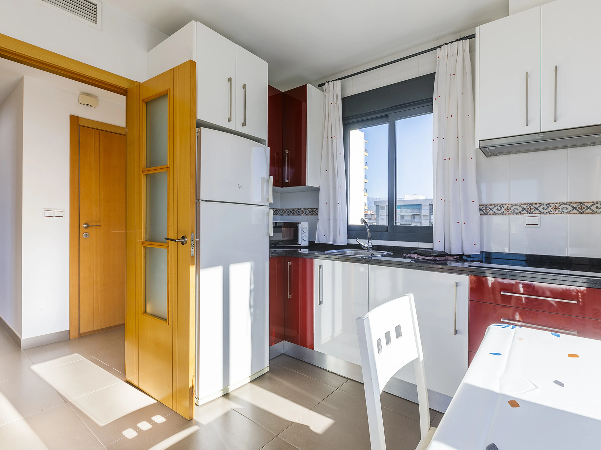 Dieses offene küche, mit ceranfeld, ist ausgestattet in kühlschrank, mikrowelle, gefrierschrank, geschirr/besteck, kochutensilien, kaffeemaschine, toaster und wasserkocher.