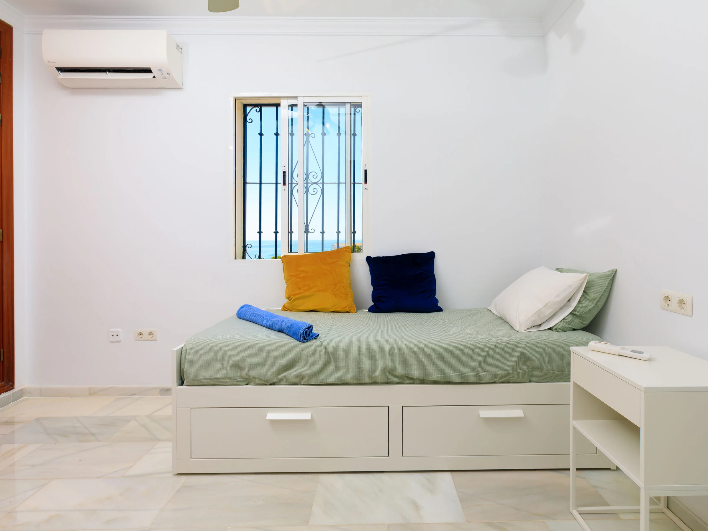 "Mi Emoción", 3-Zimmer-Attikawohnung 80 m2, Westlage. Zweckmässig und komfortabel eingerichtet: Wohn-/Esszimmer mit TV, Klimaanlage, Ventilator und Warmluftheizung. Ausgang zur Terrasse. 1 Zimmer mit 2 Betten (90 cm, Länge 190 cm), Dusche/WC, Klimaanlage, Ventilator und Warmluftheizung. 1 Zimmer mit 1 franz. Bett (150 cm, Länge 190 cm), Bad/WC, Klimaanlage, Ventilator und Warmluftheizung. Ausgang zur Terrasse. Offene Küche (Backofen, Geschirrspüler, 4 Glaskeramikplatten, Toaster, Wasserkocher, Mikrowelle, elektrische Kaffeemaschine). Grosse Terrasse. Terrassenmöbel, Gartengrill. Panoramasicht auf das Meer. Zur Verfügung: Waschmaschine, Bügeleisen, Haartrockner. Internet (Wireless LAN, gratis). Geeignet für Familien. [hidden]