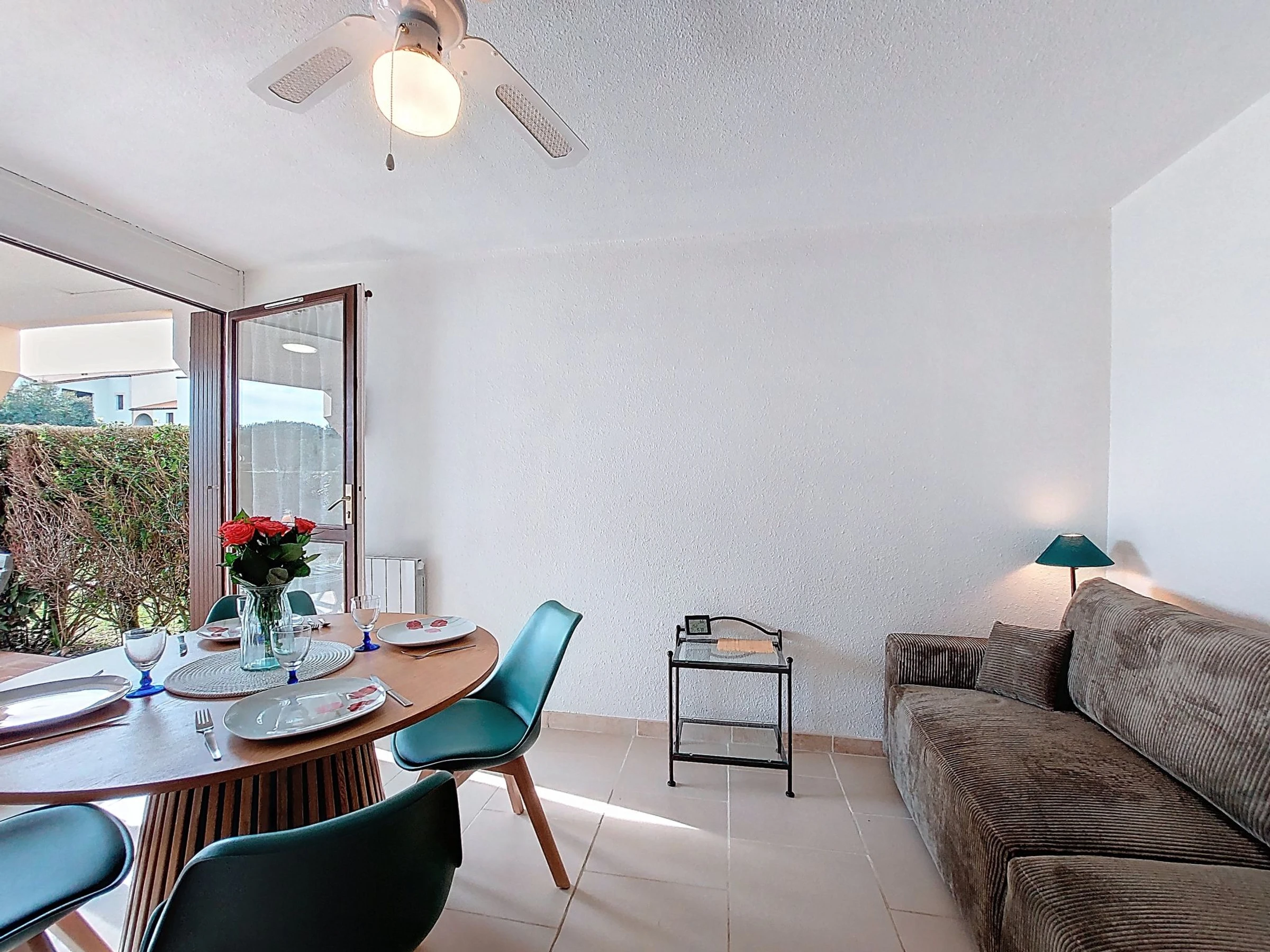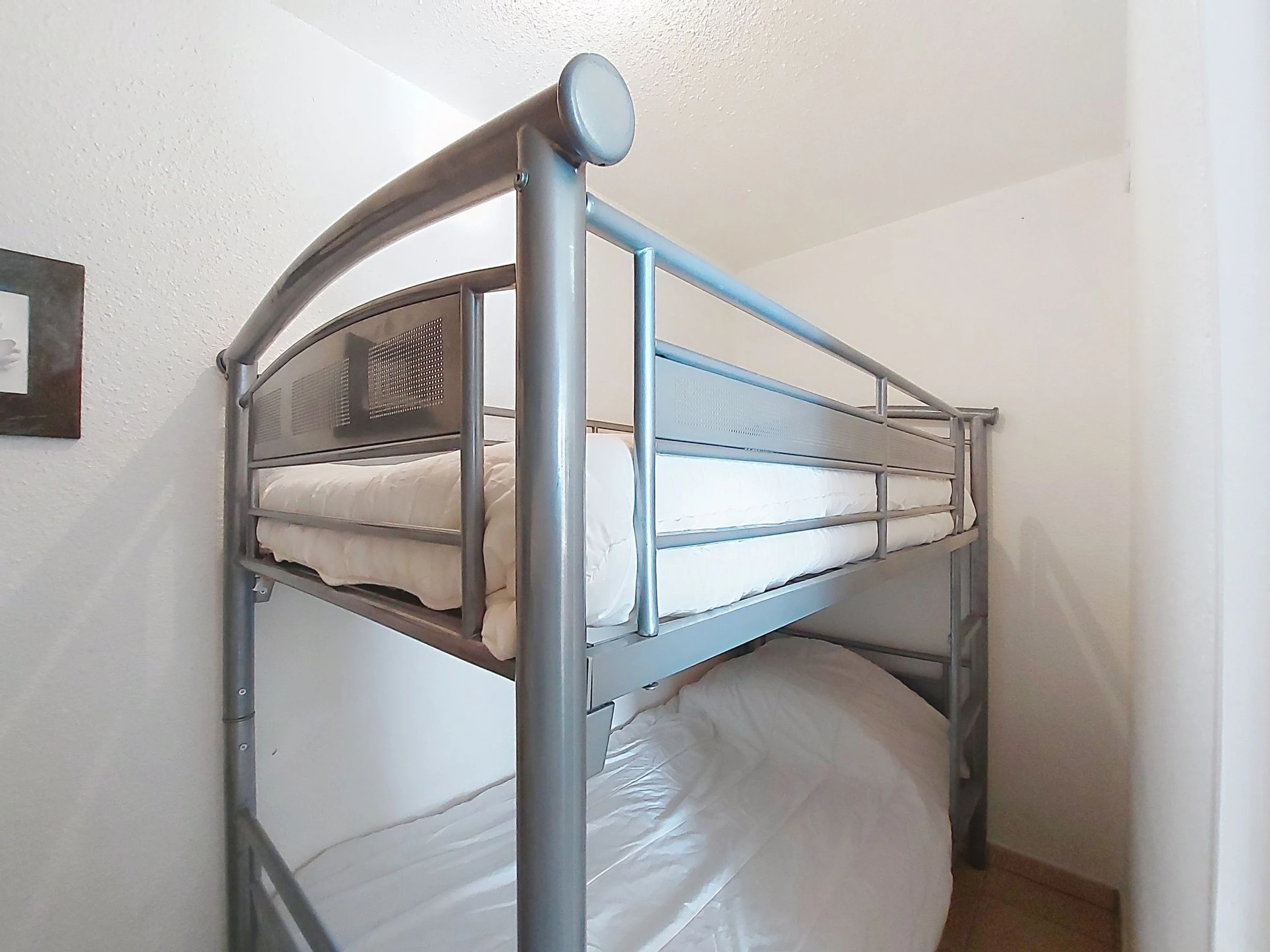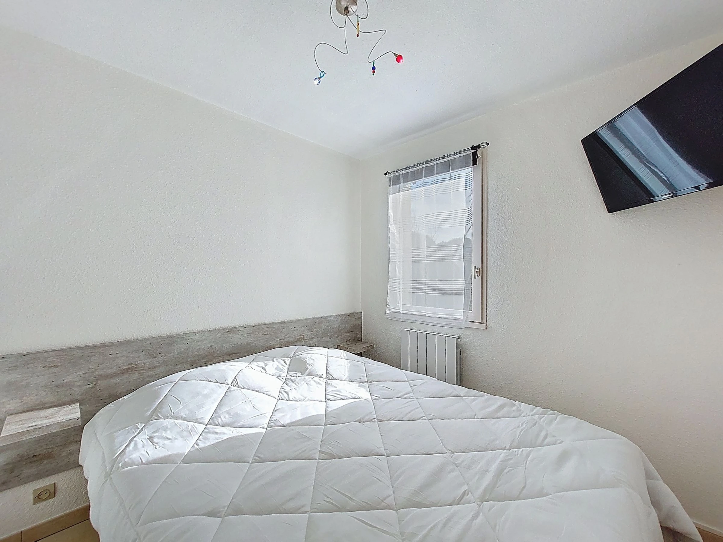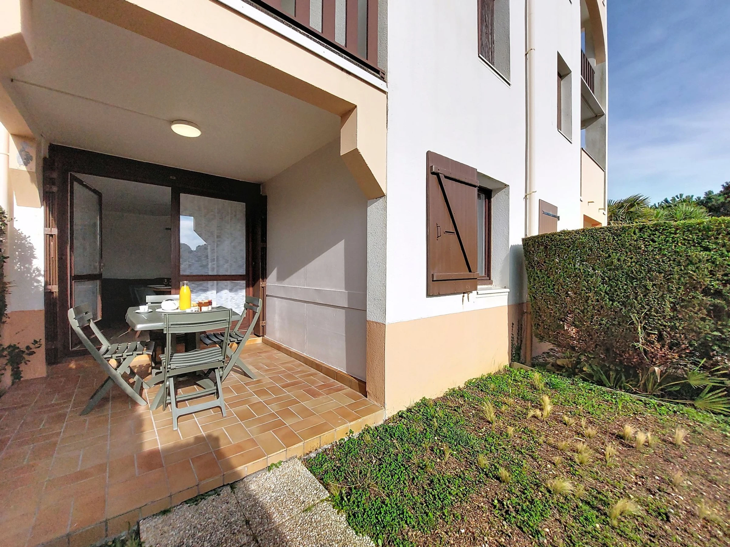 2-Zimmer-Wohnung 37 m2, im Erdgeschoss, Westlage. Wohnzimmer mit TV (Flachbildschirm), E-Heizung. Ausgang zur Terrasse, zum Gartensitzplatz. 1 Zimmer mit 1 franz. Bett (1 x 160 cm, Länge 200 cm), TV (Flachbildschirm). Kabine, ohne Fenster mit 1 x 2 Etagenbetten (90 cm, Länge 190 cm). Kochnische (Backofen, Geschirrspüler, 2 Glaskeramikplatten, Mikrowelle, Tiefkühler, elektrische Kaffeemaschine, Kapseln für die Kaffeemaschine (Senseo) extra). Dusche/WC. E-Heizung. Terrasse 10 m2, Gartensitzplatz 30 m2. Terrassenmöbel. Zur Verfügung: Waschmaschine. Internet (WLAN, extra). Bitte beachten: Maximal 1 kleines Haustier/Hund erlaubt. Rauchmelder. Anstelle eines abgeschlossenen Schlafzimmers befinden sich manche Schlafplätze in einem offenen Bereich (Galerie, Nische etc.). Inserat einer Privatperson nach Artikel 155, IV, CGI.