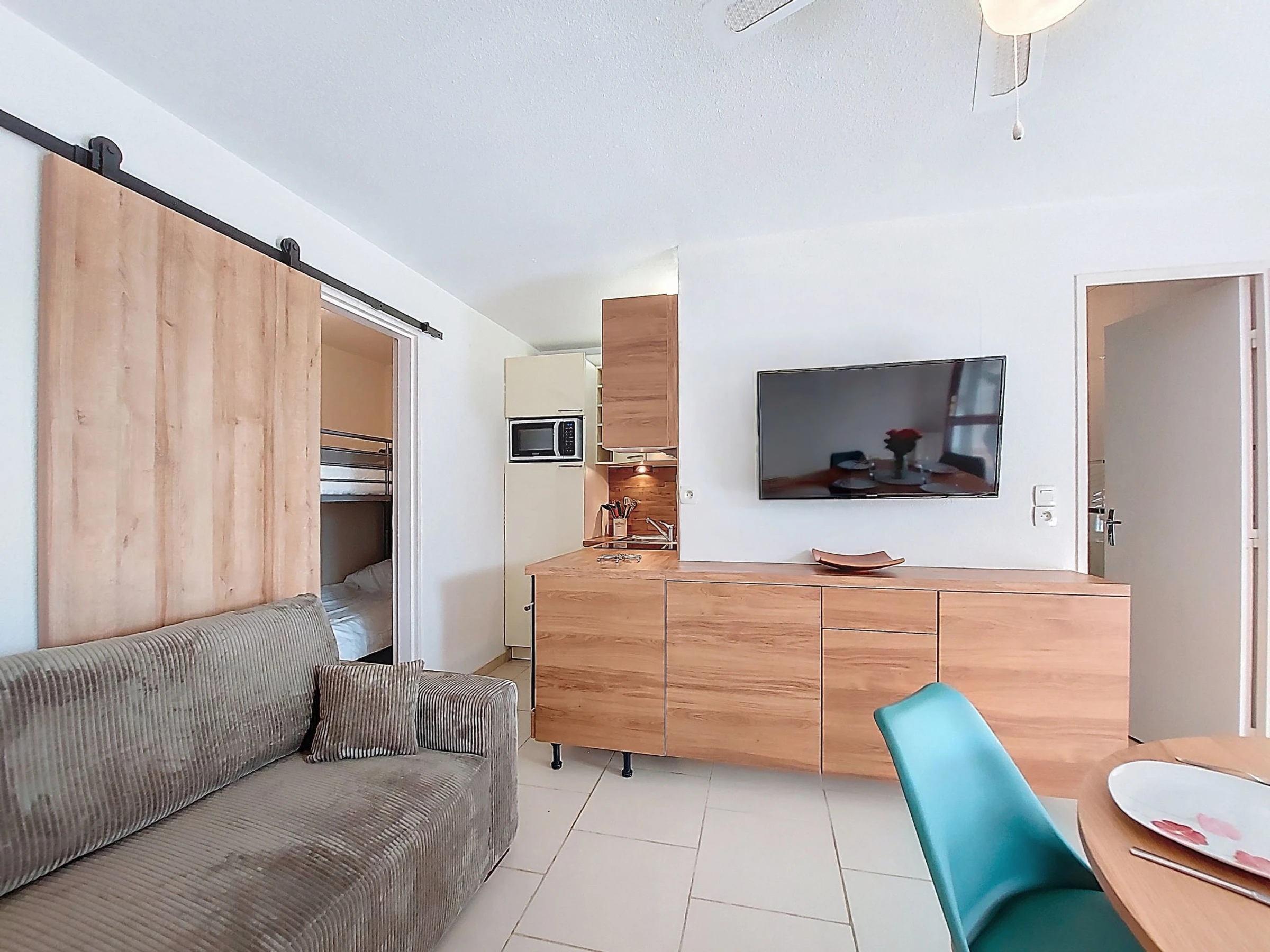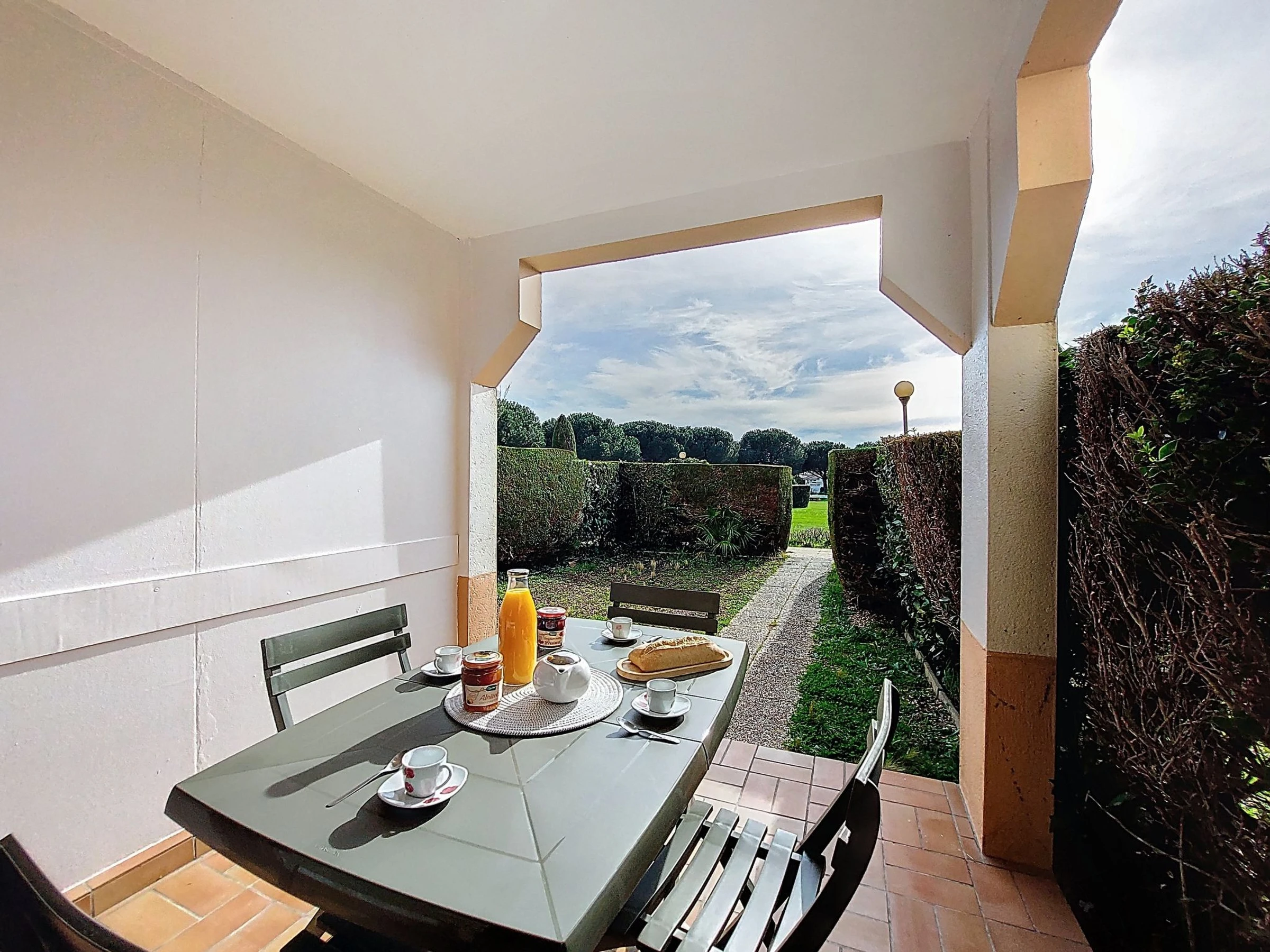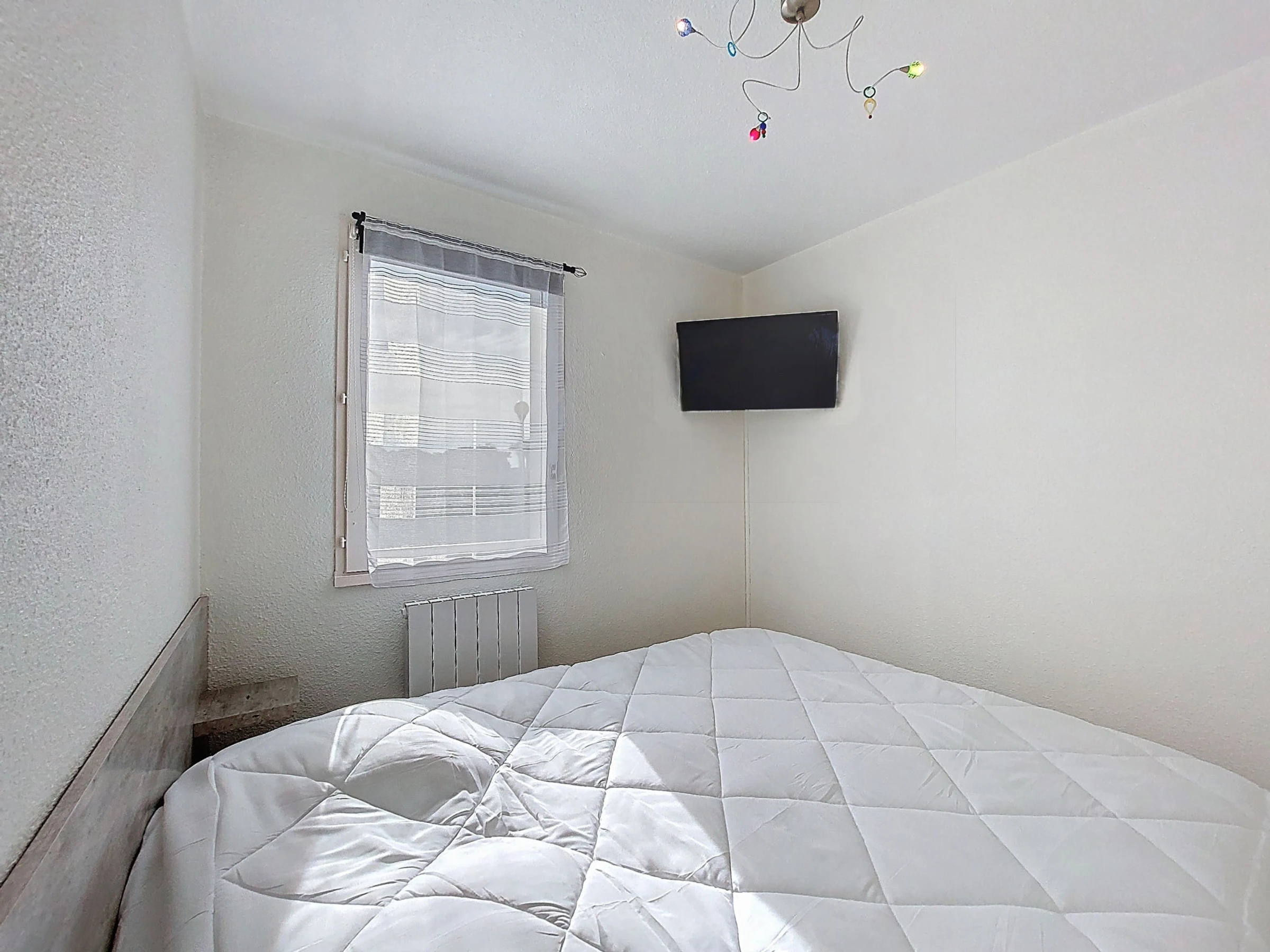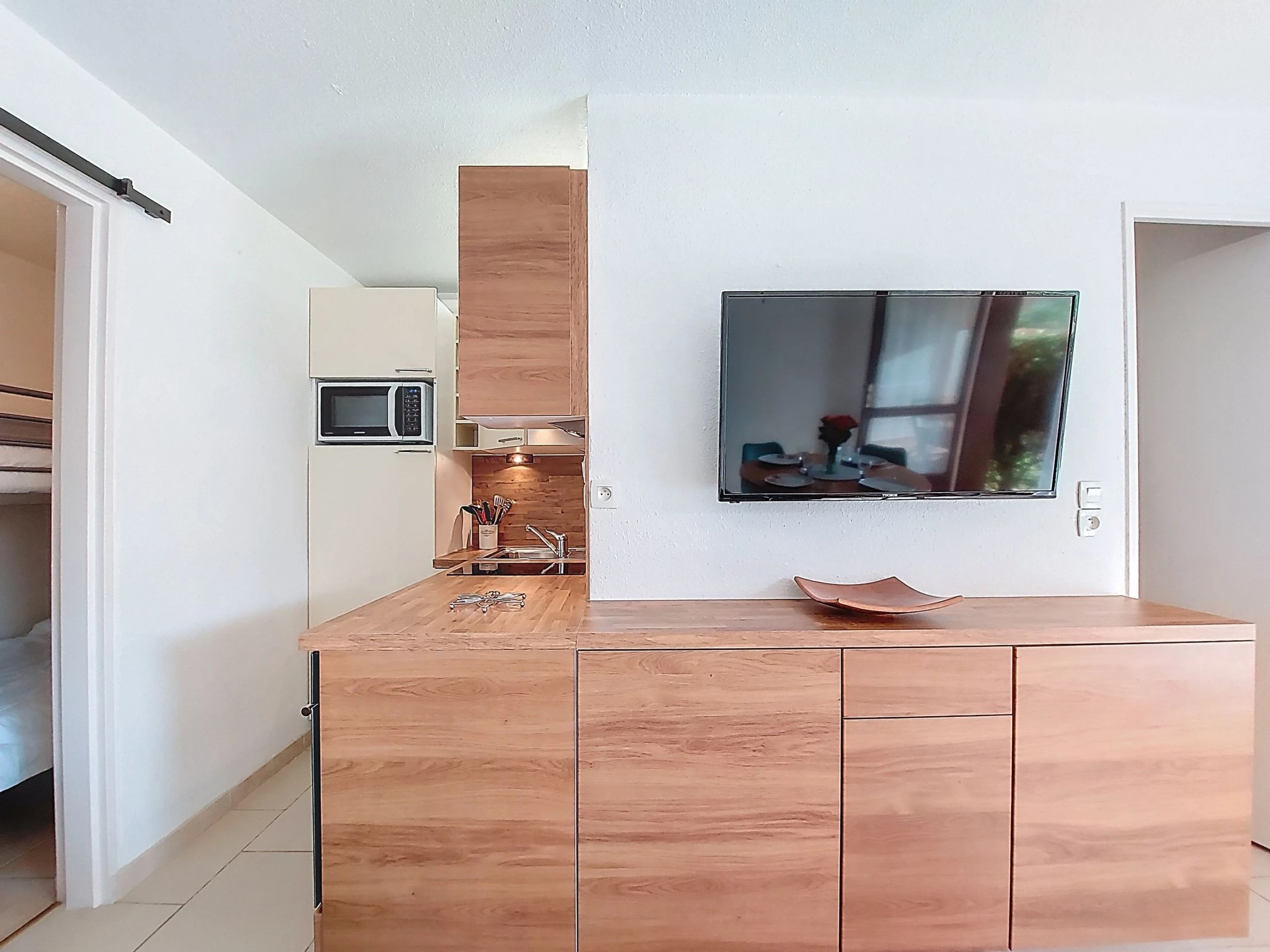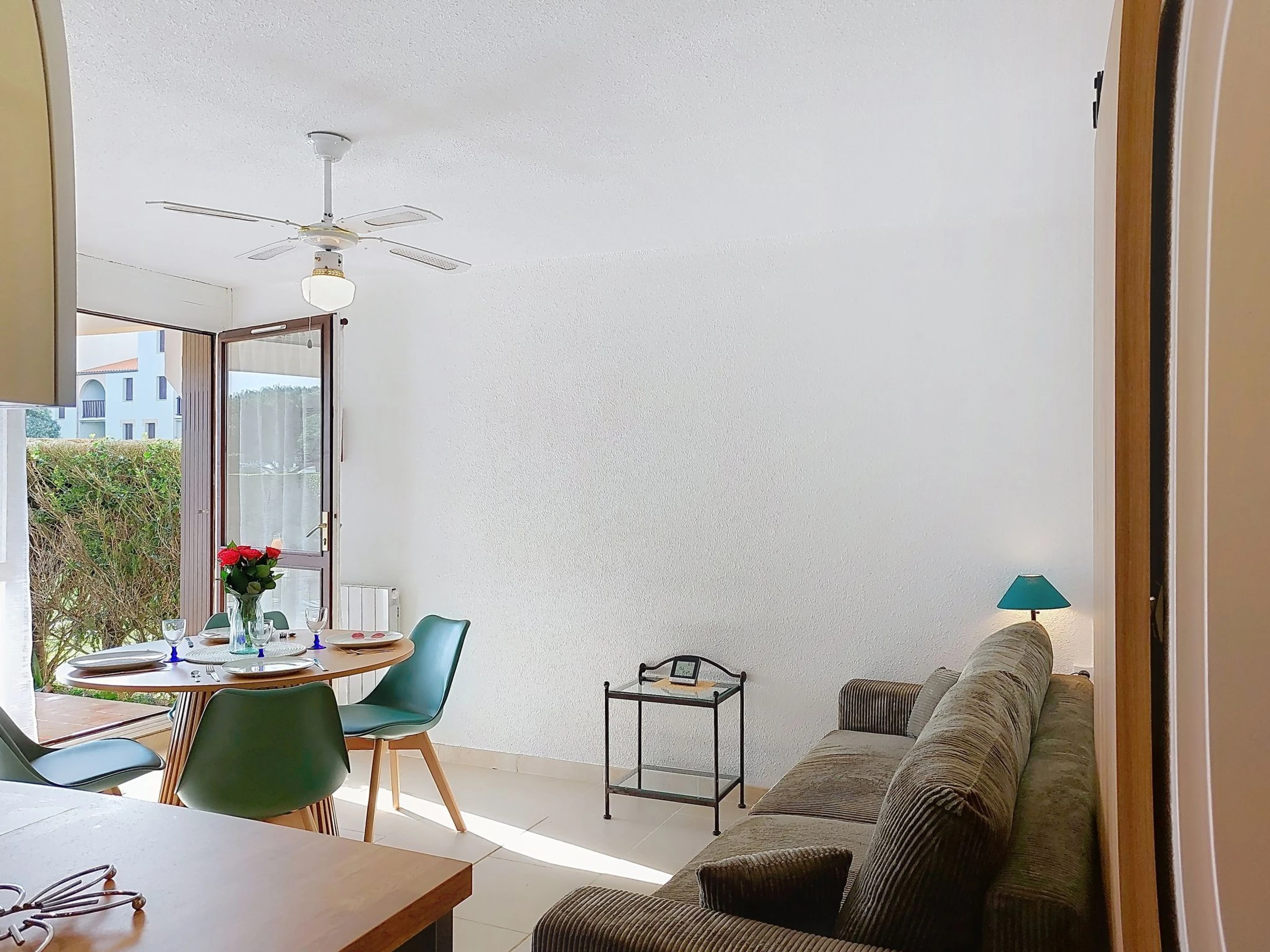 2-Zimmer-Wohnung 37 m2, im Erdgeschoss, Westlage. Wohnzimmer mit TV (Flachbildschirm), E-Heizung. Ausgang zur Terrasse, zum Gartensitzplatz. 1 Zimmer mit 1 franz. Bett (1 x 160 cm, Länge 200 cm), TV (Flachbildschirm). Kabine, ohne Fenster mit 1 x 2 Etagenbetten (90 cm, Länge 190 cm). Kochnische (Backofen, Geschirrspüler, 2 Glaskeramikplatten, Mikrowelle, Tiefkühler, elektrische Kaffeemaschine, Kapseln für die Kaffeemaschine (Senseo) extra). Dusche/WC. E-Heizung. Terrasse 10 m2, Gartensitzplatz 30 m2. Terrassenmöbel. Zur Verfügung: Waschmaschine. Internet (WLAN, extra). Bitte beachten: Maximal 1 kleines Haustier/Hund erlaubt. Rauchmelder. Anstelle eines abgeschlossenen Schlafzimmers befinden sich manche Schlafplätze in einem offenen Bereich (Galerie, Nische etc.). Inserat einer Privatperson nach Artikel 155, IV, CGI.