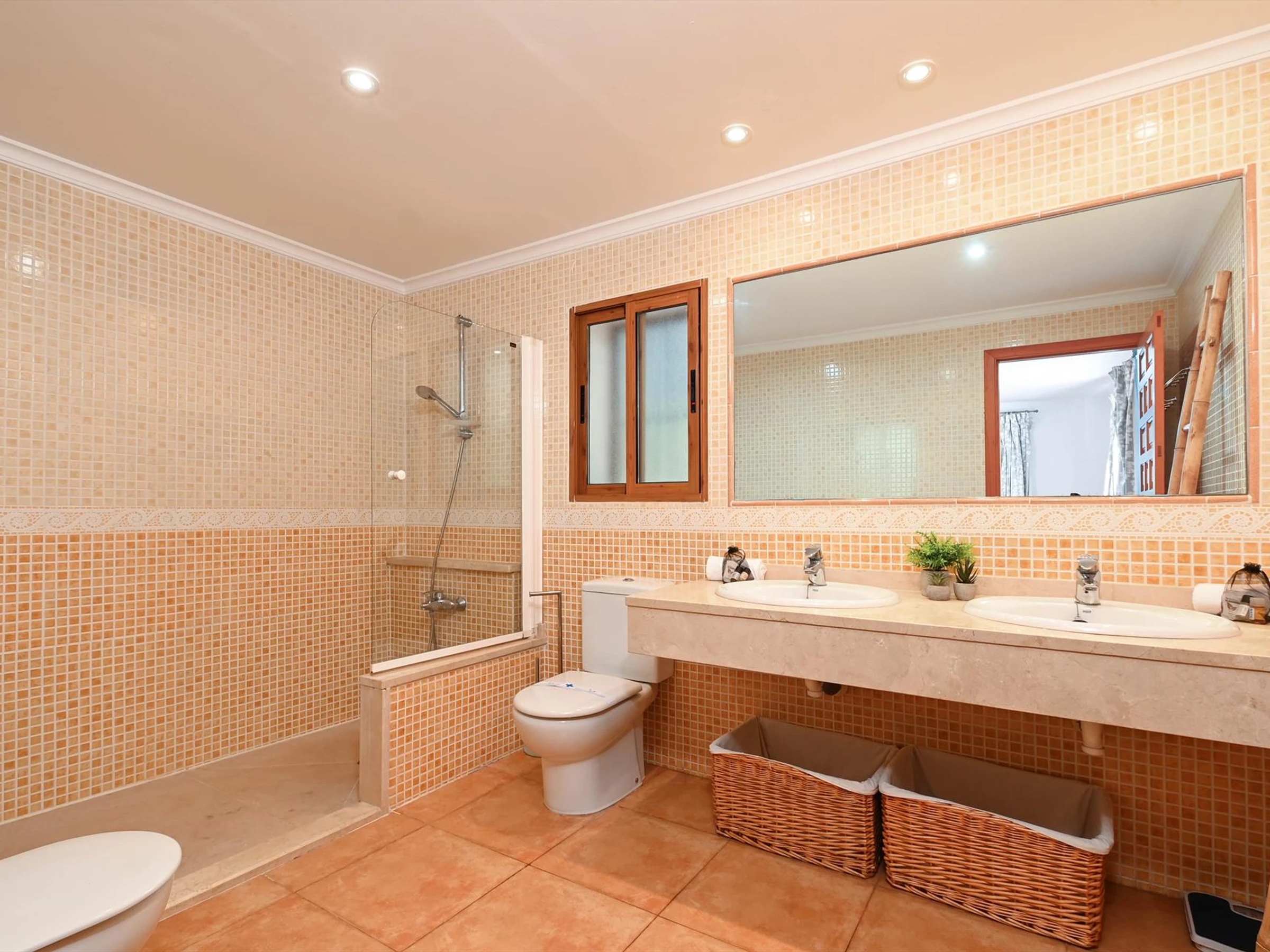 * ensuite Badezimmer mit Doppelwaschbecken, Dusche, Bidet und Toilette