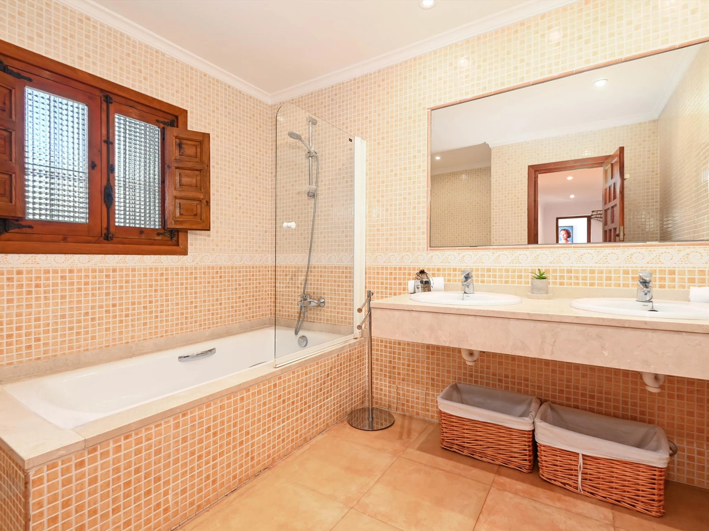 * Badezimmer mit Doppelwaschbecken, Duschbadewanne, Bidet und ToiletteAussen