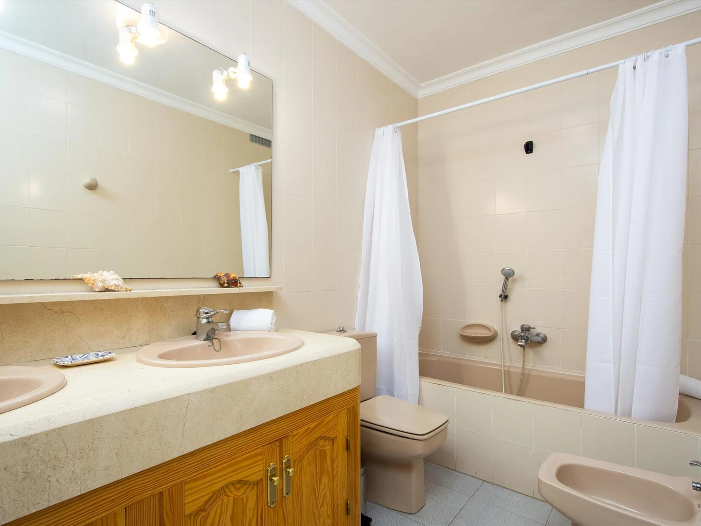 * Badezimmer mit Doppelwaschbecken, Badewanne/Dusche-Kombination, Bidet und WC