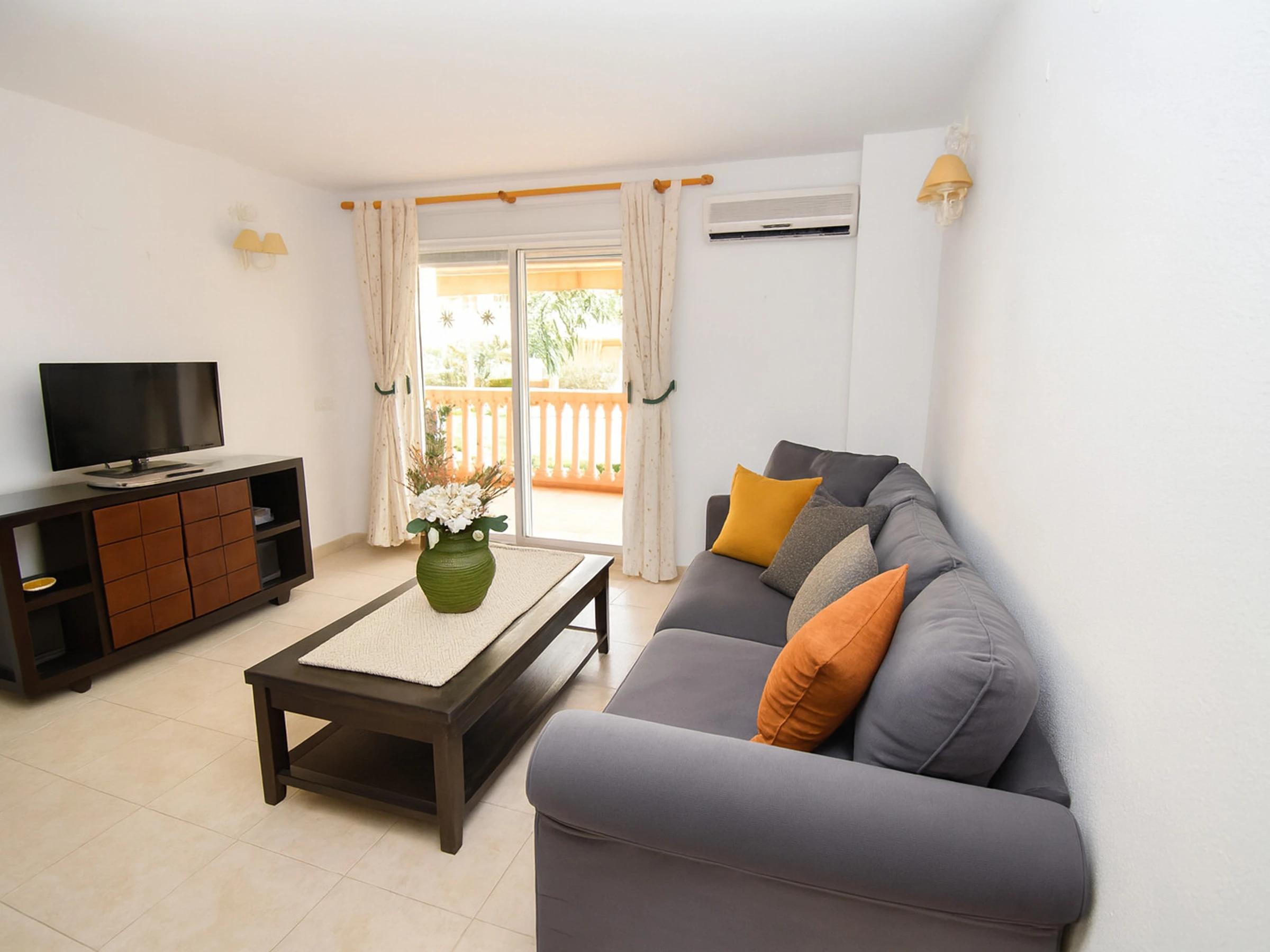 Der Wohn-Essbereich ist geräumig und gemütlich, mit zwei Sofas, Flachbildfernseher, DVD-Player, Esstisch für sechs Personen, Klimaanlage und Schiebetüren mit Jalousien, die direkten Zugang zur privaten Terrasse bieten.