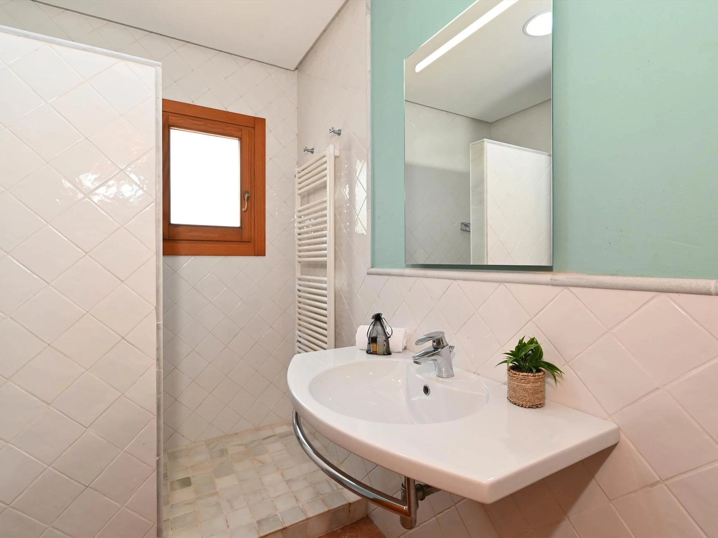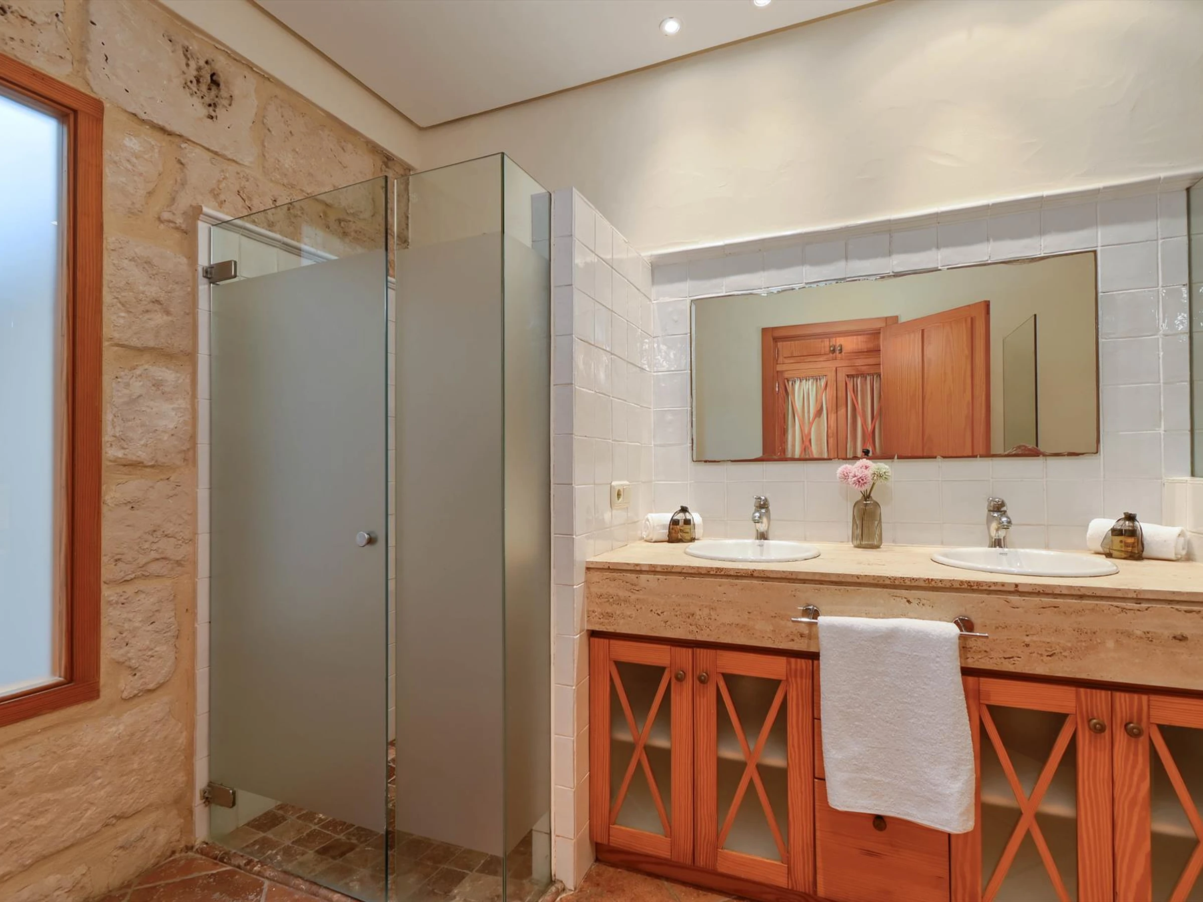 * Badezimmer mit Einzelwaschbecken, Dusche und Toilette Außenbereich der Villa