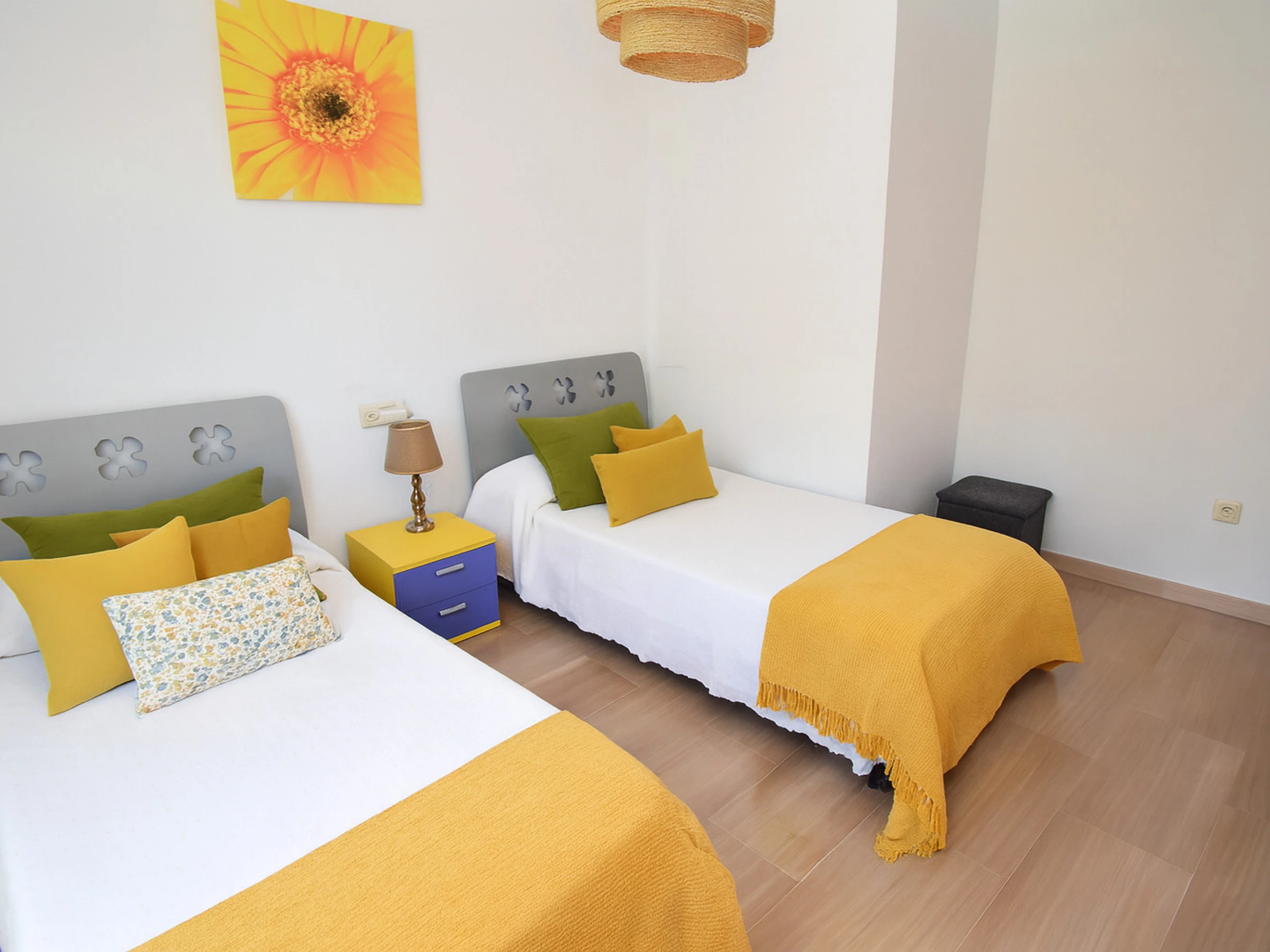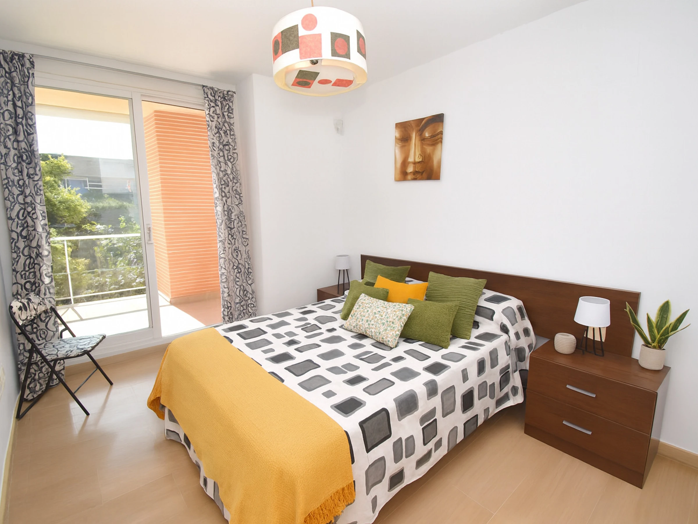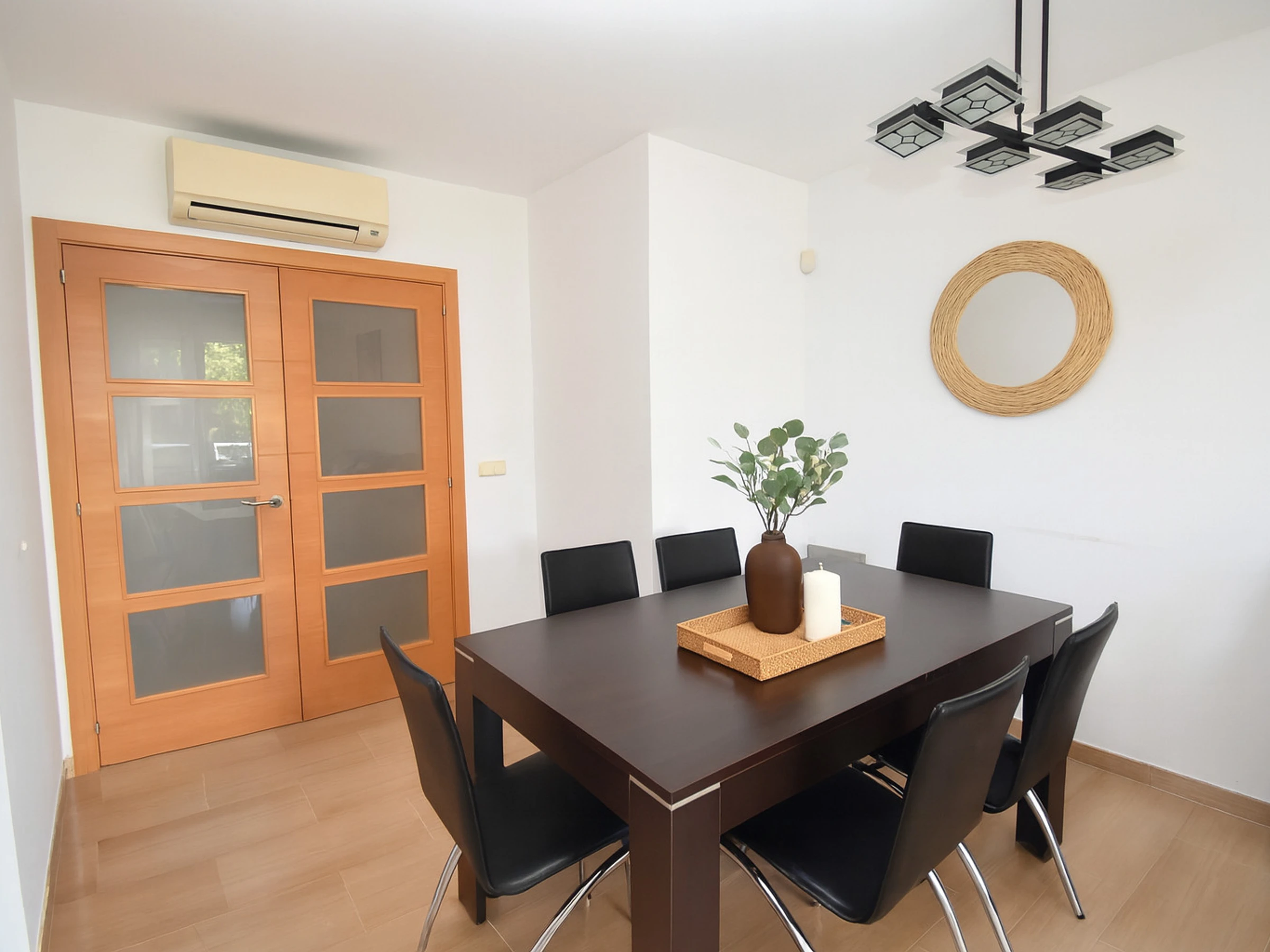 Mit Platz für bis zu 6 Personen verfügt die Ferienwohnung über WLAN-Internet, einen geräumigen Wohn-Essbereich mit großer Couch, Plasma-Fernseher, DVD-Player, Klimaanlage (Kalt/Warm) und Schiebetüren, die Zugang zu einer möblierten überdachten Terrasse bieten, die perfekt ist, um das mediterrane Klima zu genießen.