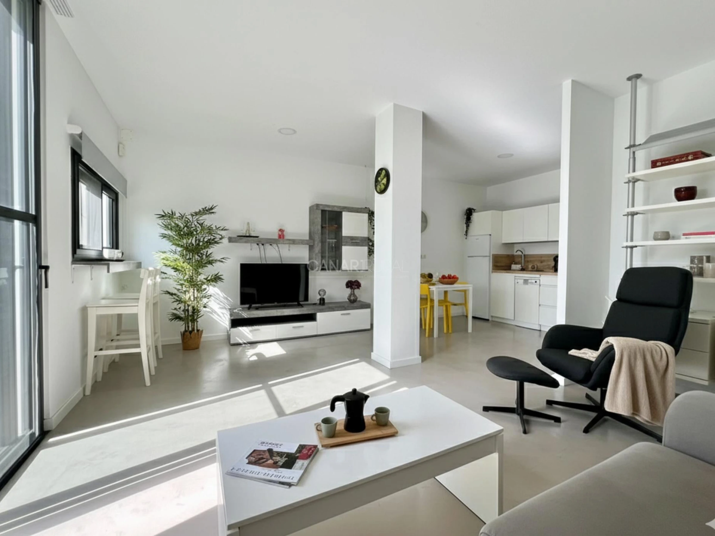 Ecoloft Aldea is a modern one-level accommodation featuring open spaces, large windows and plenty of natural light. Its layout combines functionality and comfort, with a seamless flow between the fully equipped kitchen, lounge area and direct outdoor access, allowing you to enjoy both indoor and outdoor living.