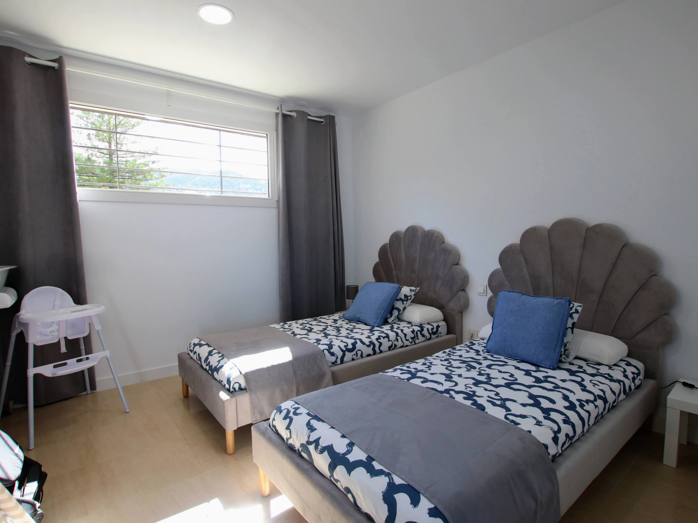 The upper floor of the villa houses two cosy bedrooms. One of them features a double bed and a window with panoramic views, while the other is equipped with two single beds. A second bathroom with a shower tray completes this floor, ensuring that all guests have their space and privacy.