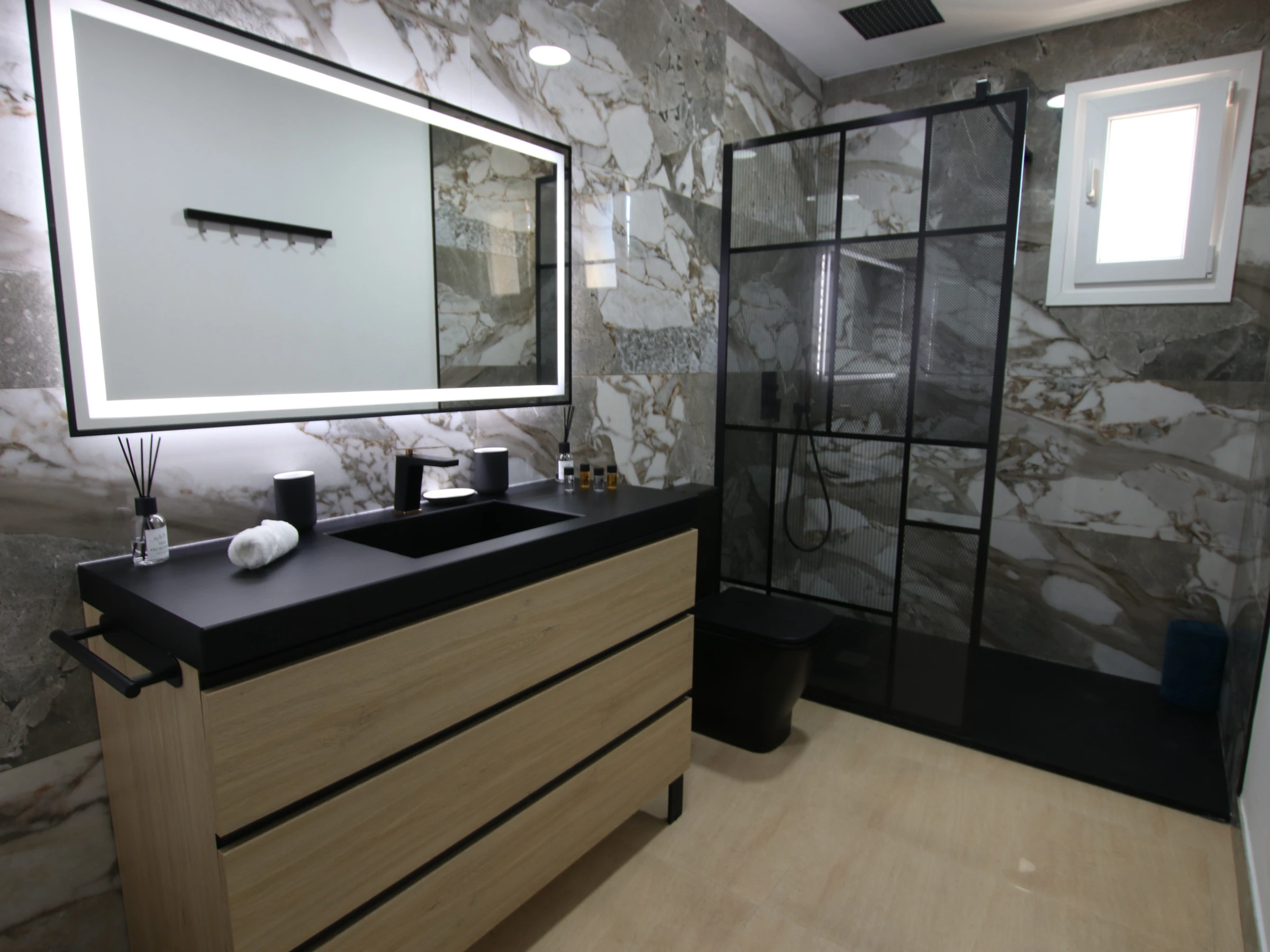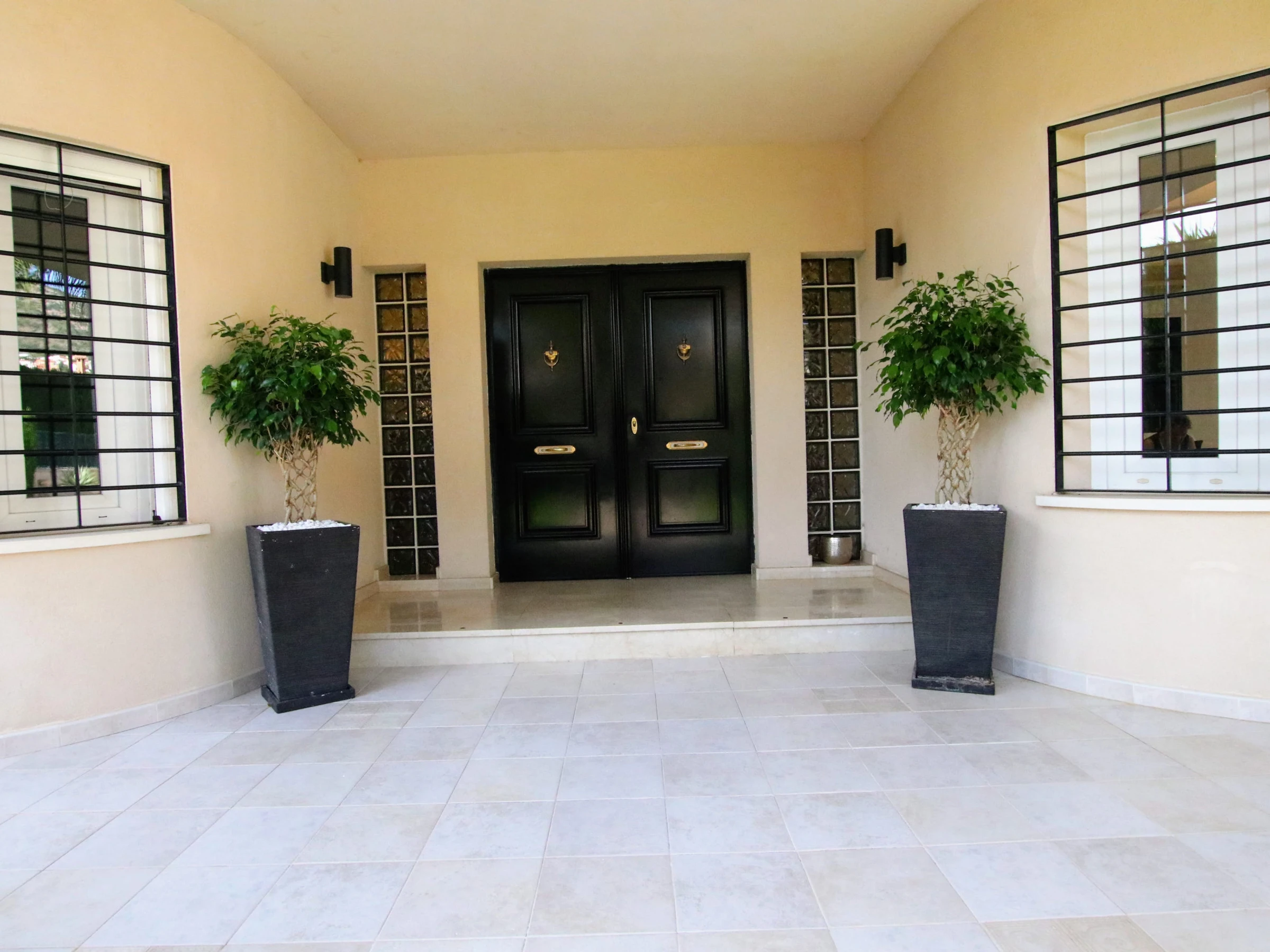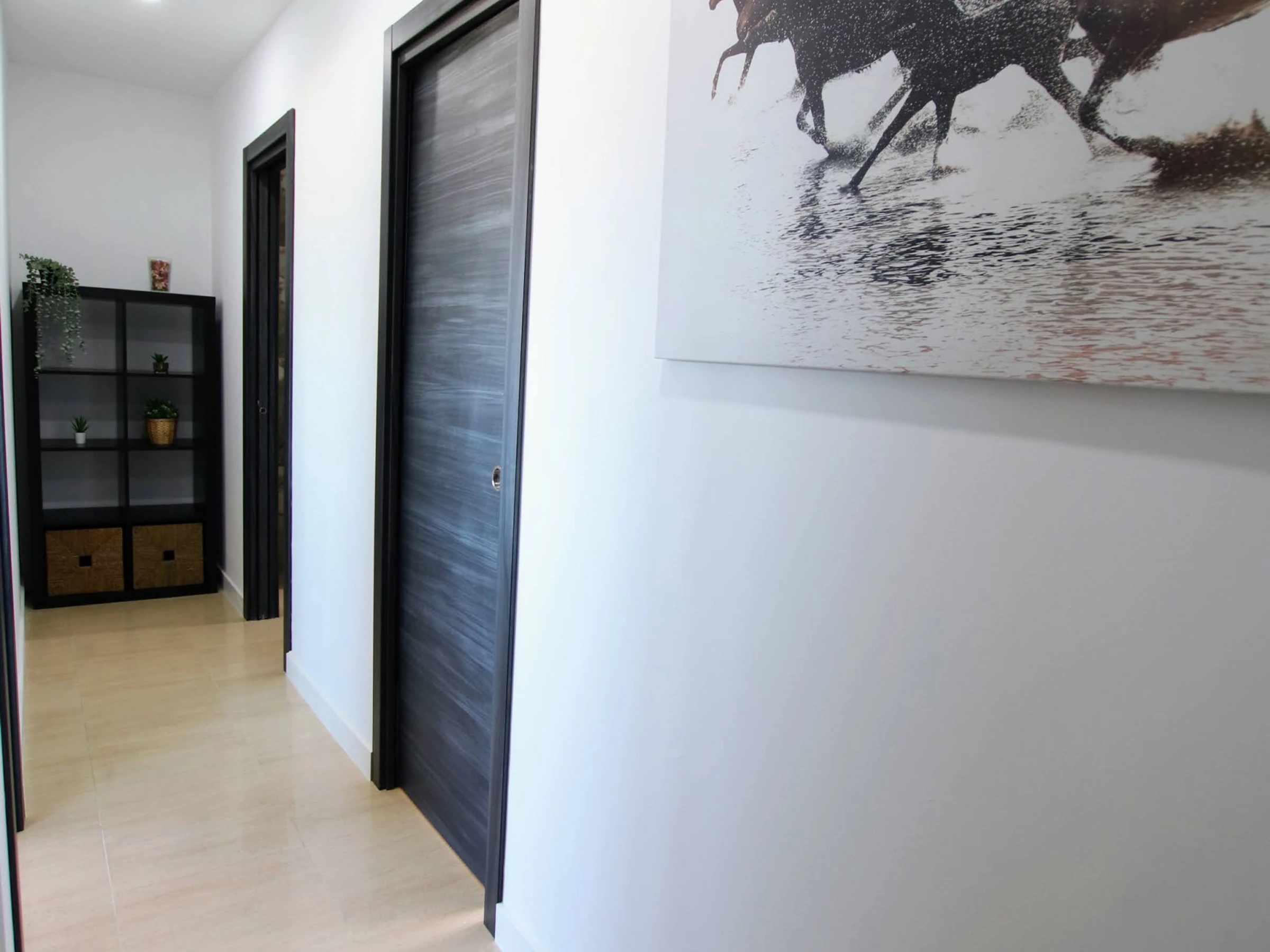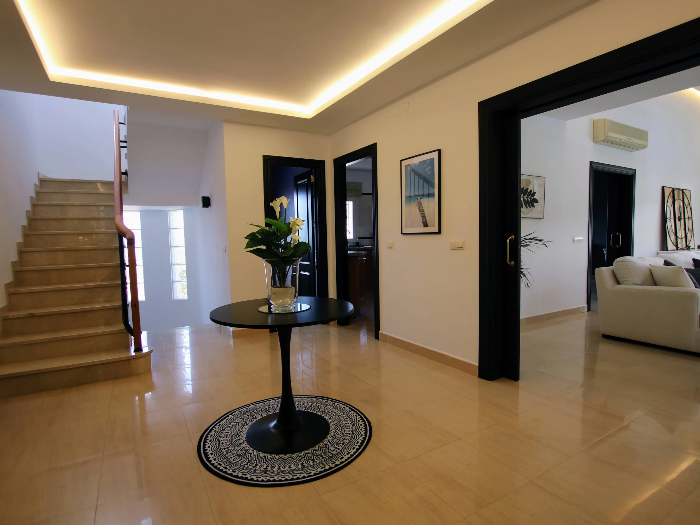 On the ground floor of the villa, you will find two distinct wings. In the left wing, you will discover three elegant and spacious bedrooms, all with double beds. The main bedroom features a king-size bed, a complete en-suite bathroom, and a walk-in wardrobe to satisfy all your storage needs. Additionally, there is a complete bathroom in the hallway for added convenience.