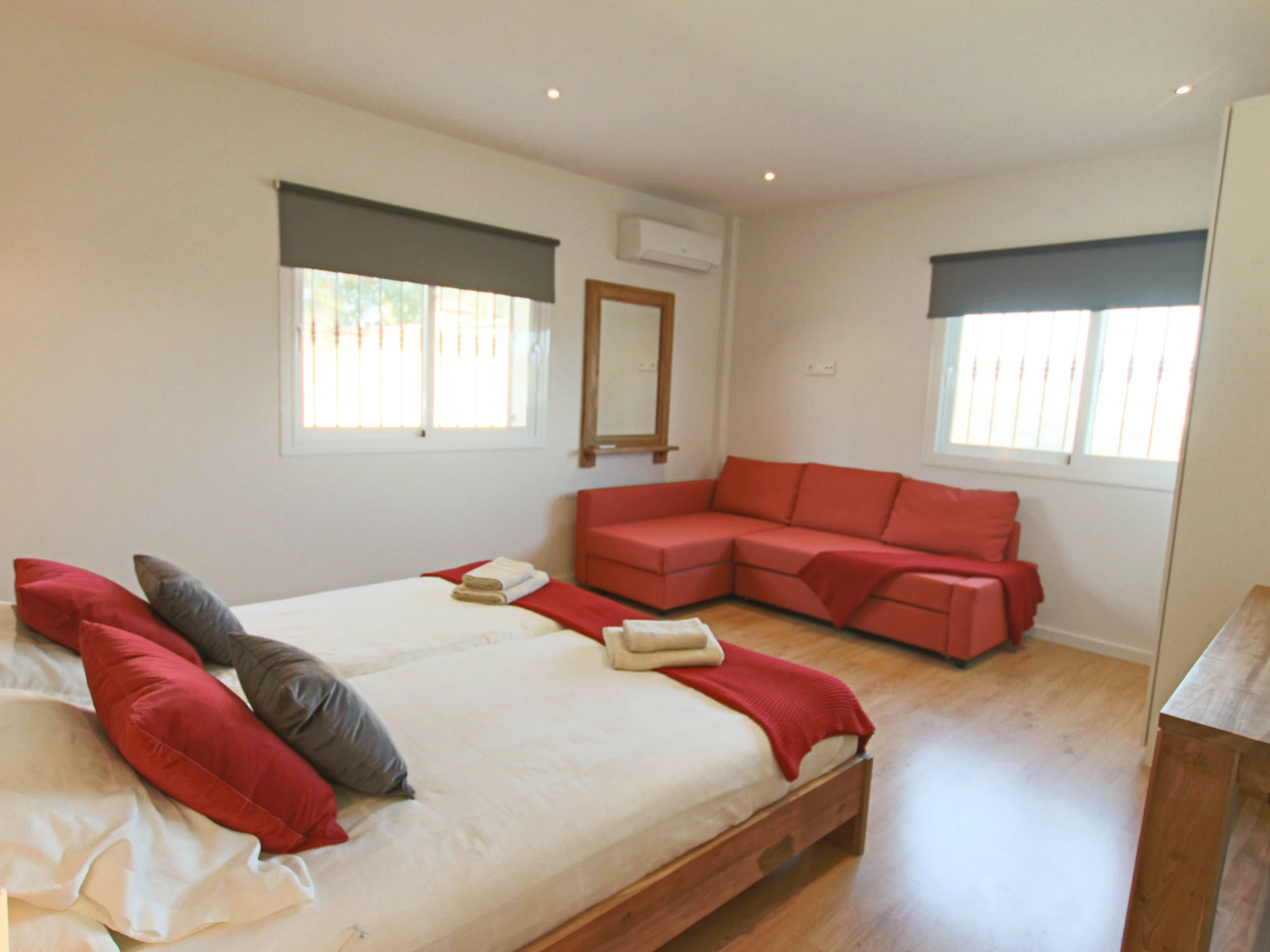 In total there are 10 beds, 3 double beds of 1.80x2.00m and 6 single beds of 0.90x2.00m y 1 sofa bed. A children's chair and a cot are available.