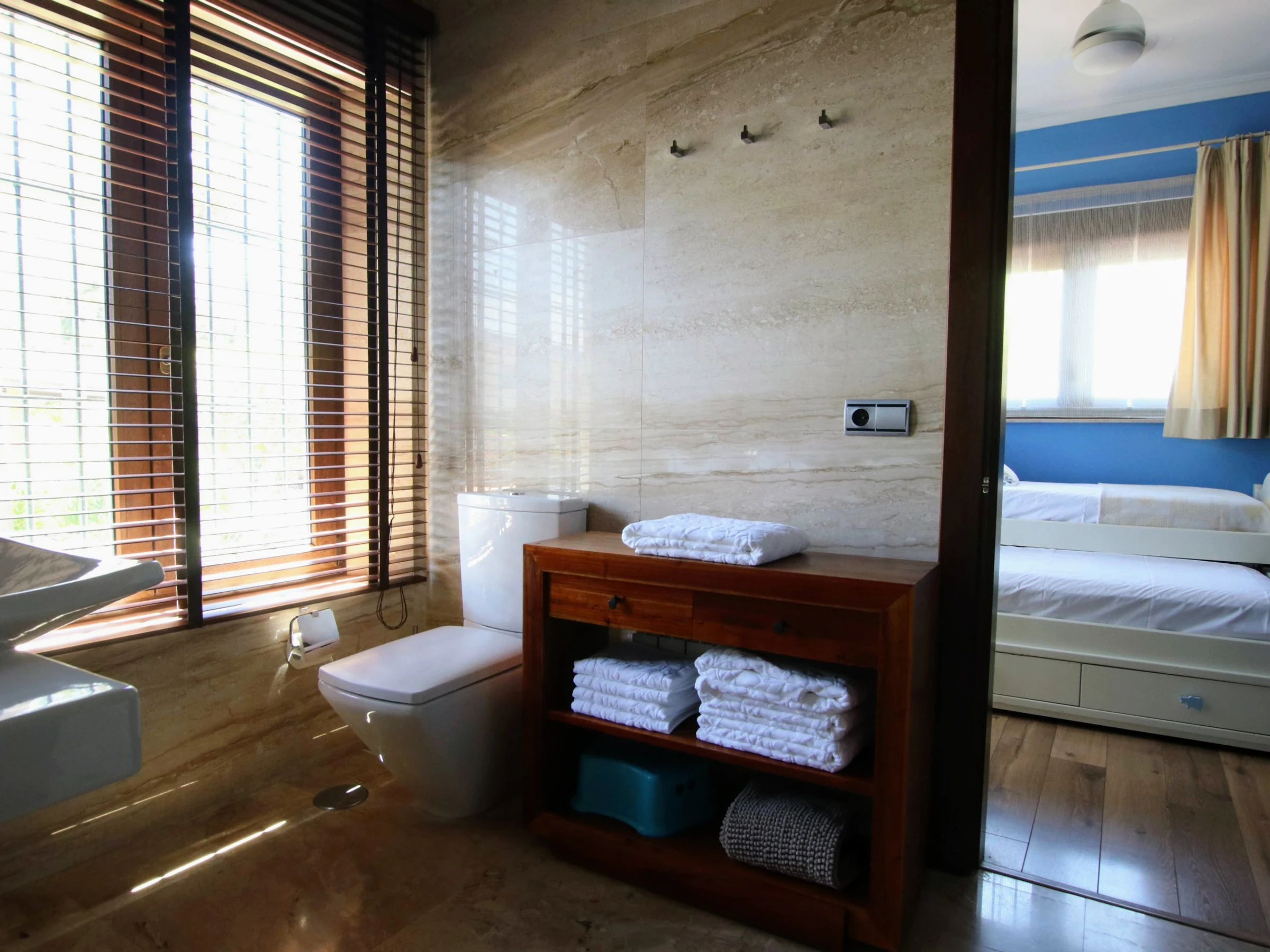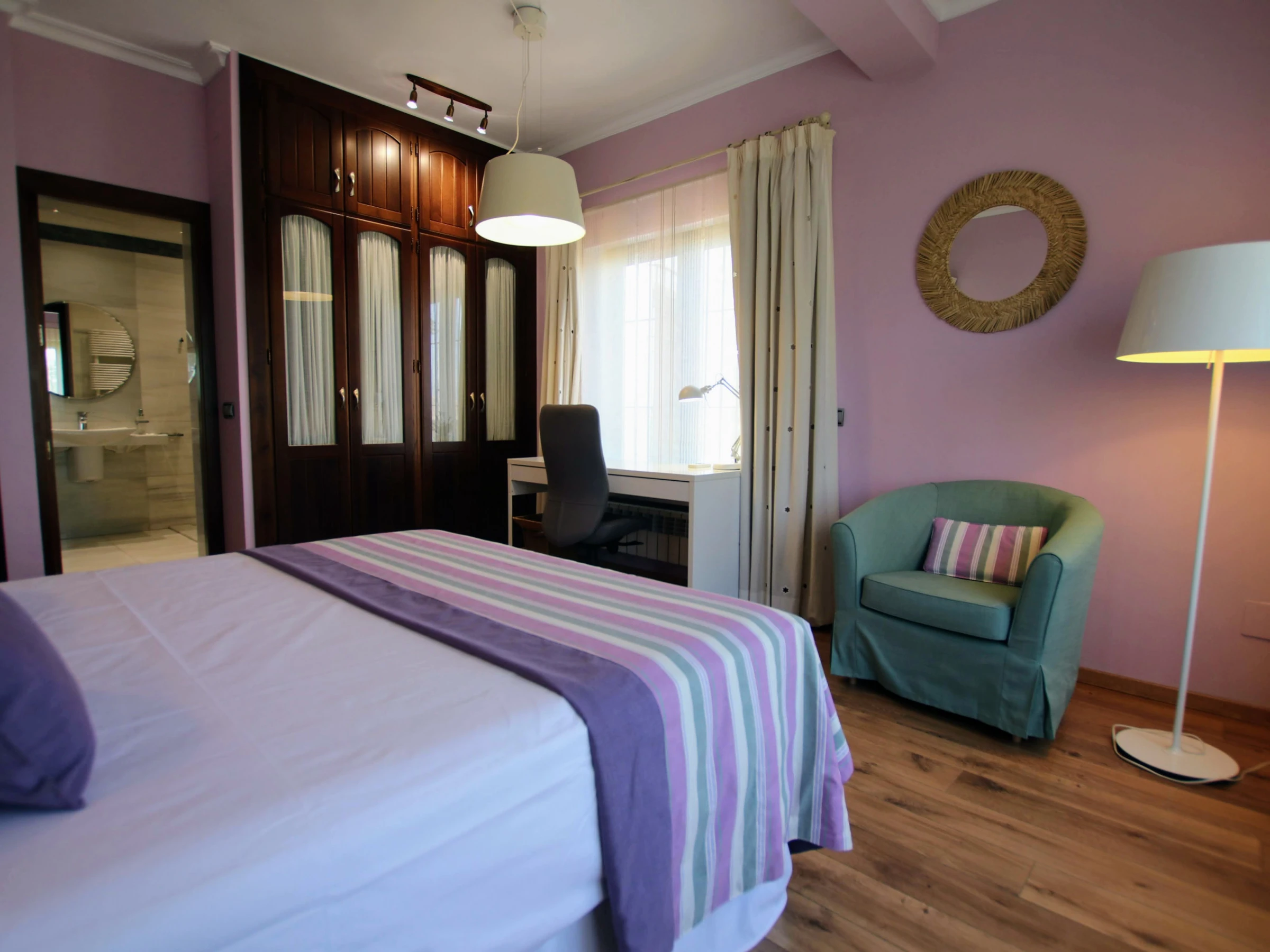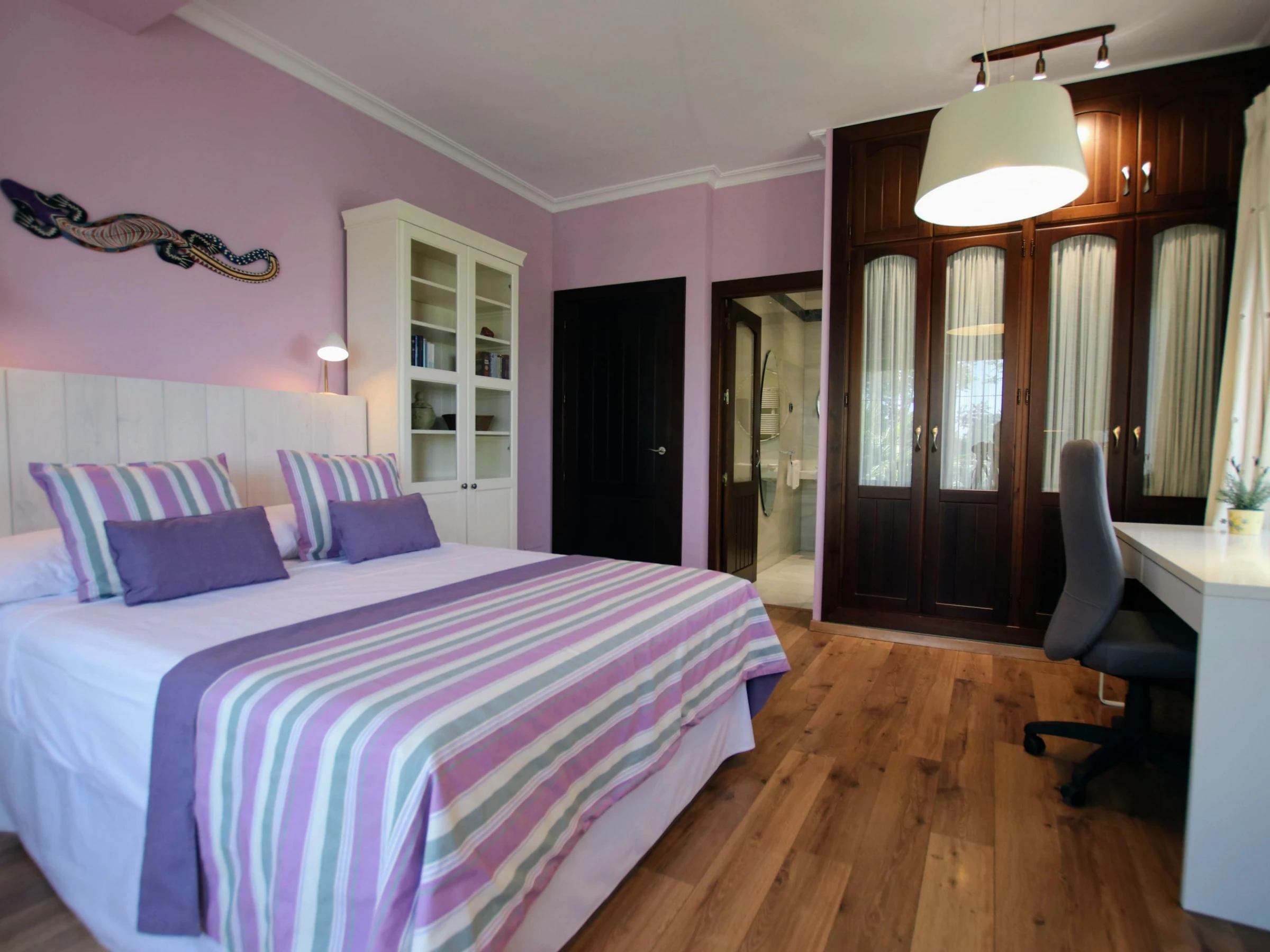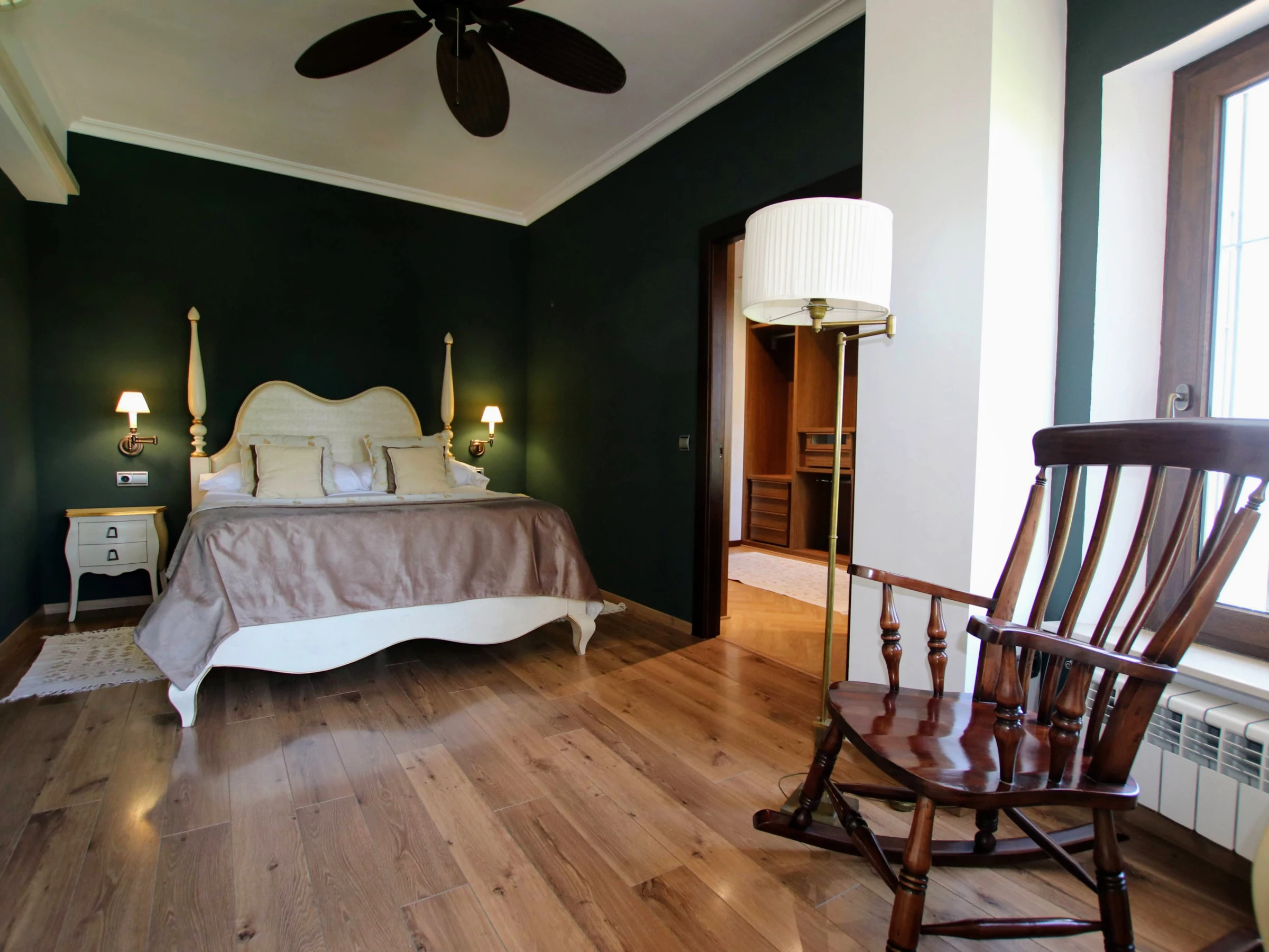 -Bedroom A: consists of a double bed of 150x200cm, with air conditioning and ceiling fan. It also has a spacious walk-in wardrobe and en-suite bathroom with double washbasin, WC, bathtub and shower.