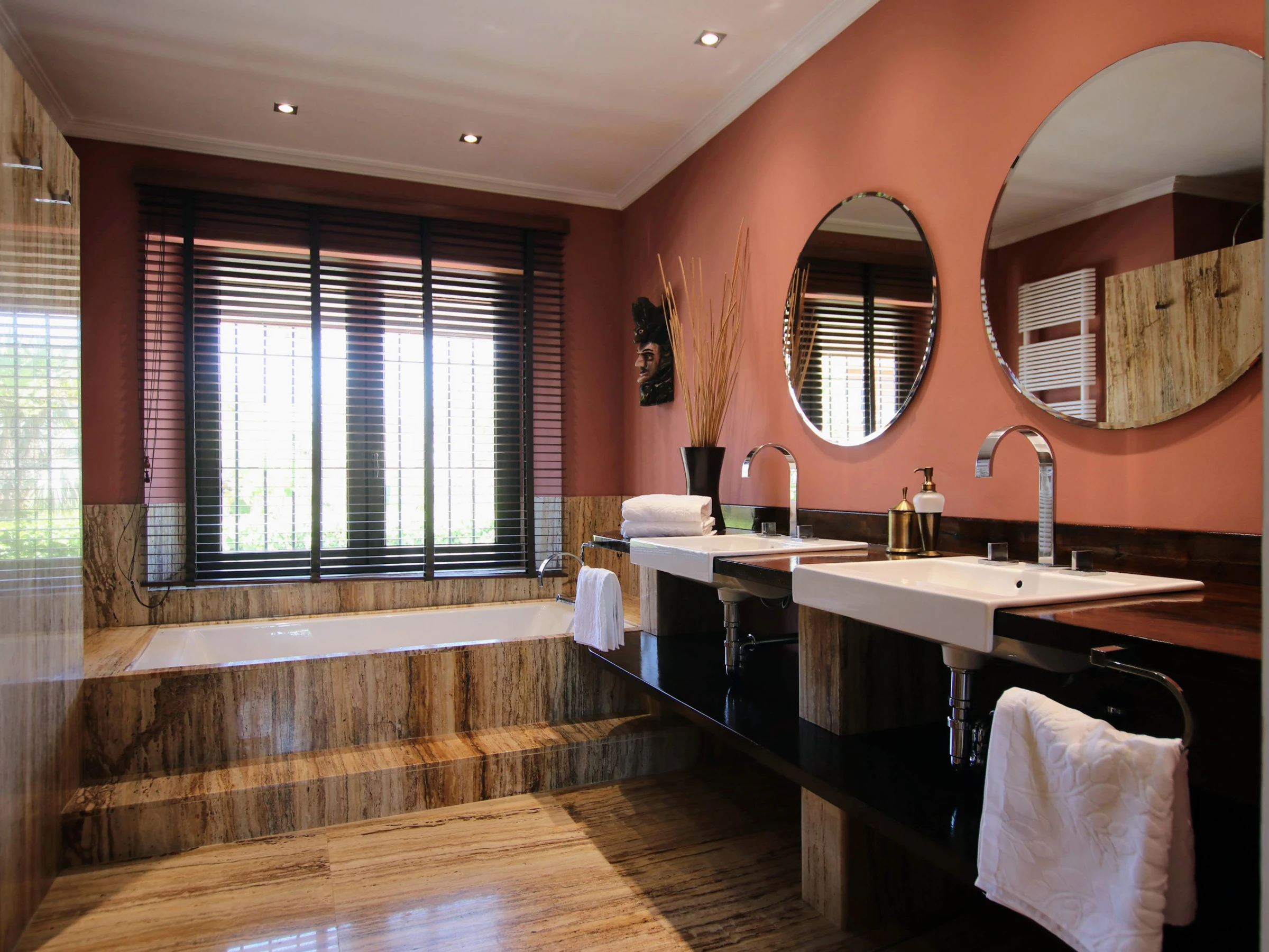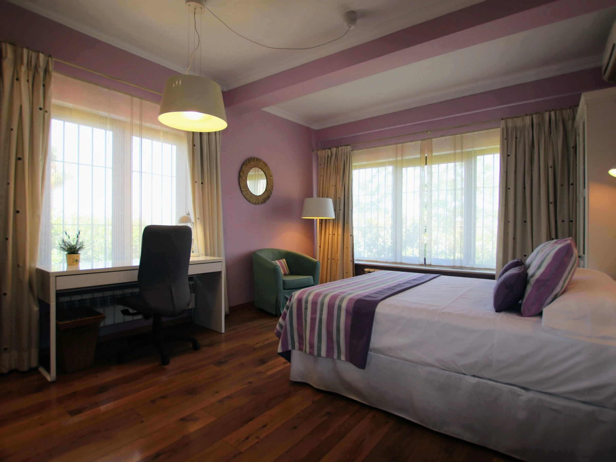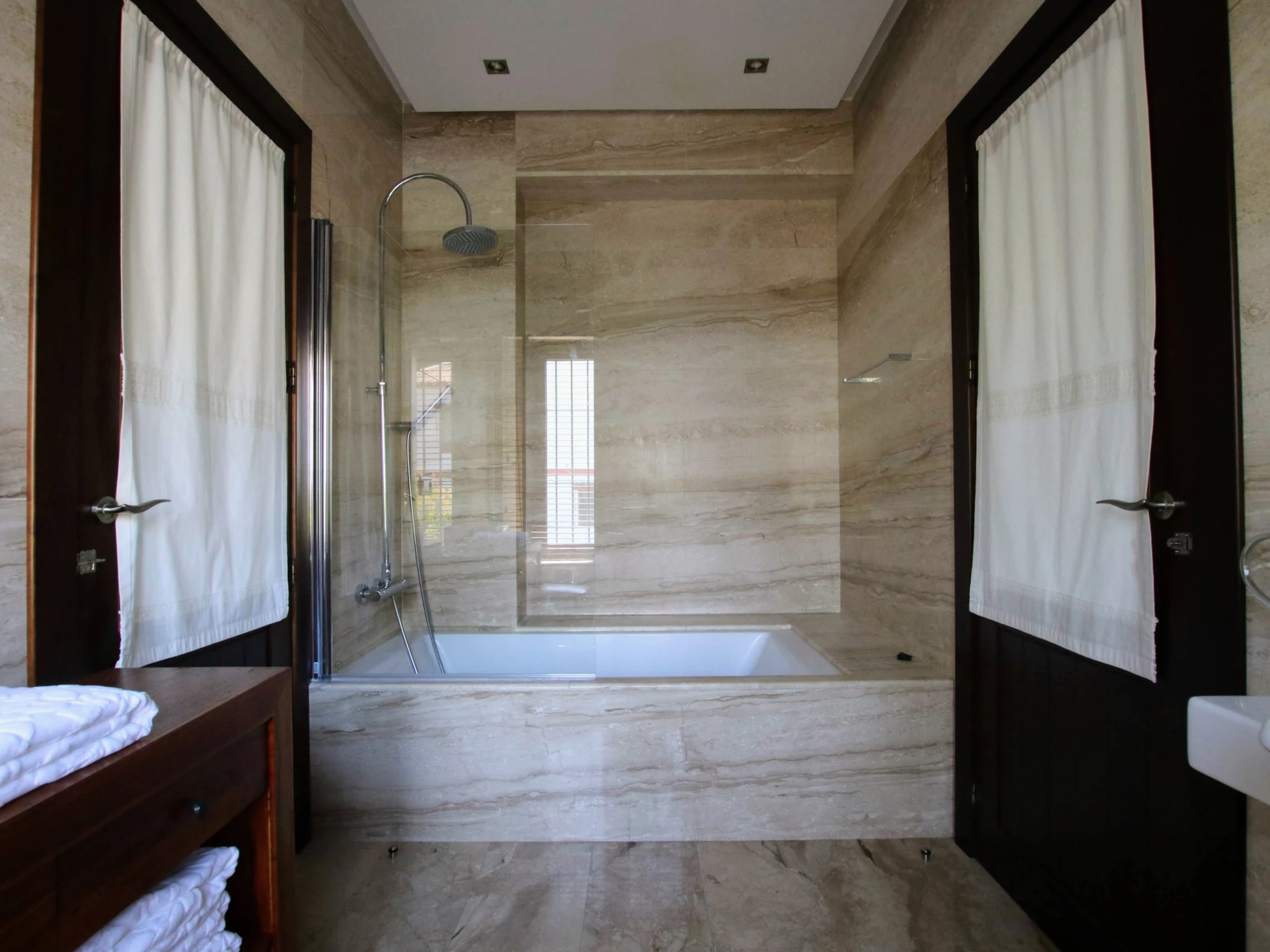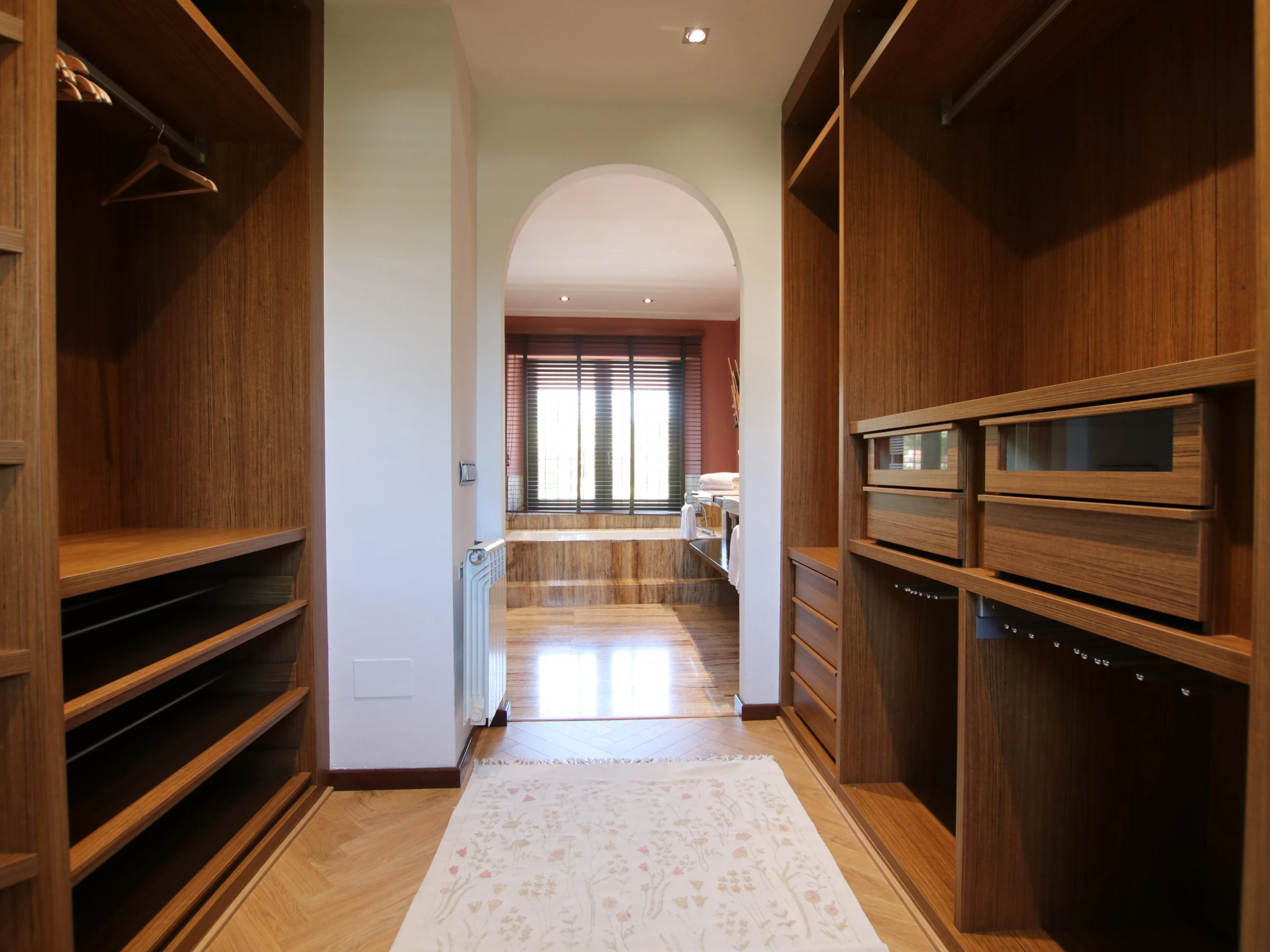 -Bedroom A: consists of a double bed of 150x200cm, with air conditioning and ceiling fan. It also has a spacious walk-in wardrobe and en-suite bathroom with double washbasin, WC, bathtub and shower.