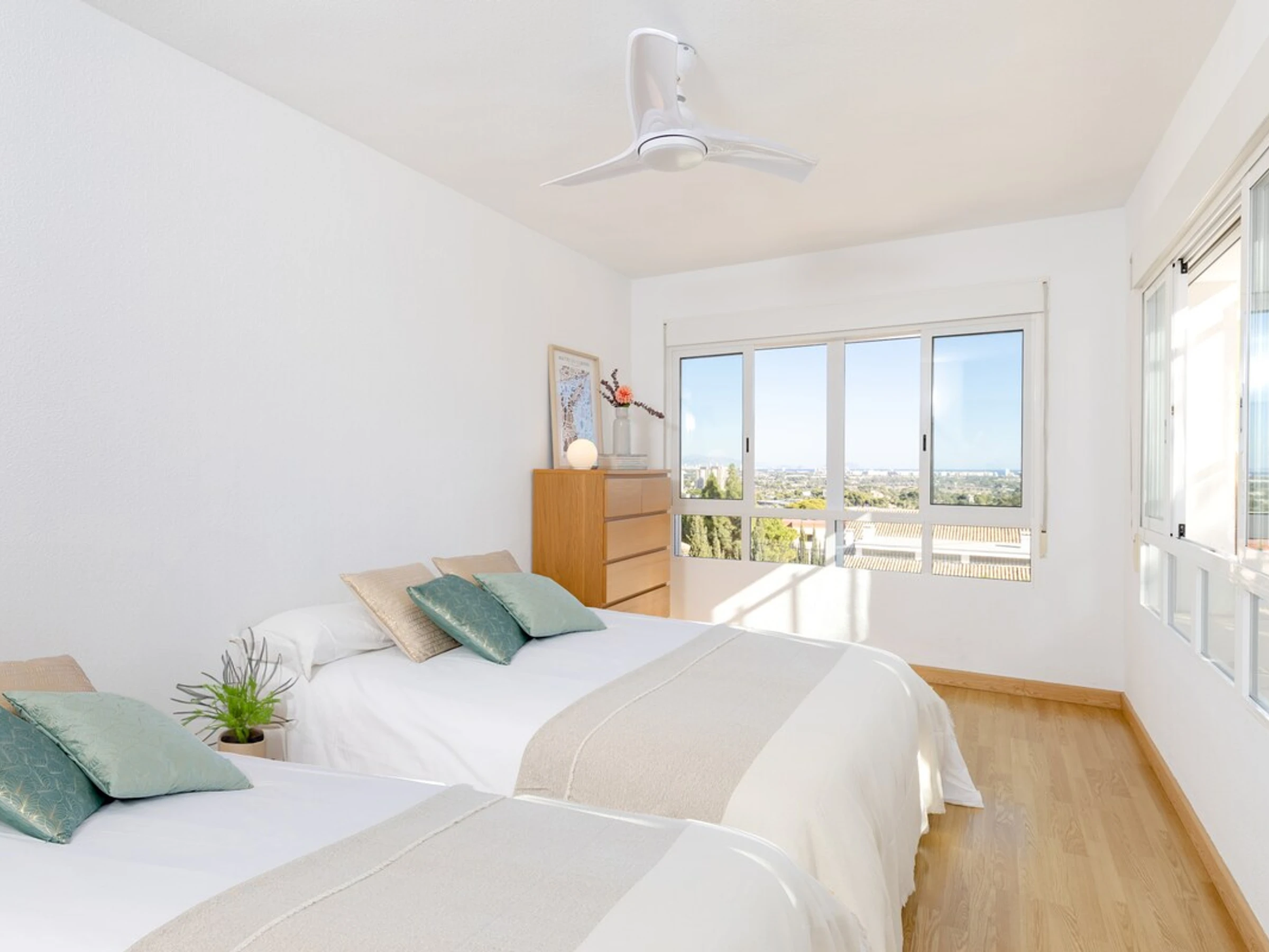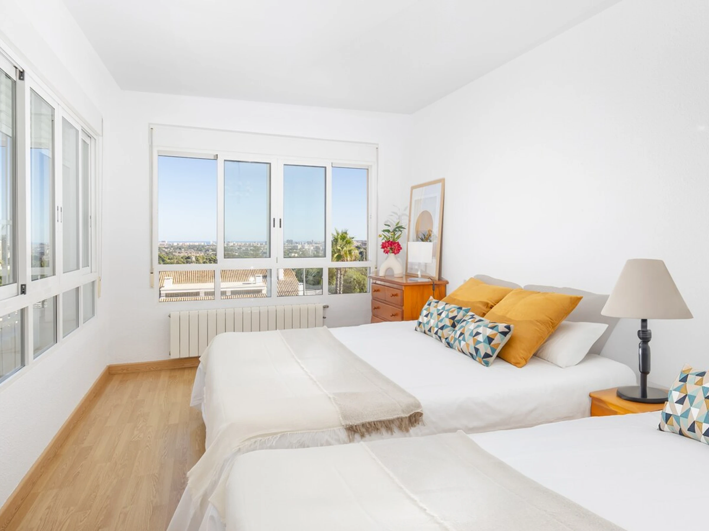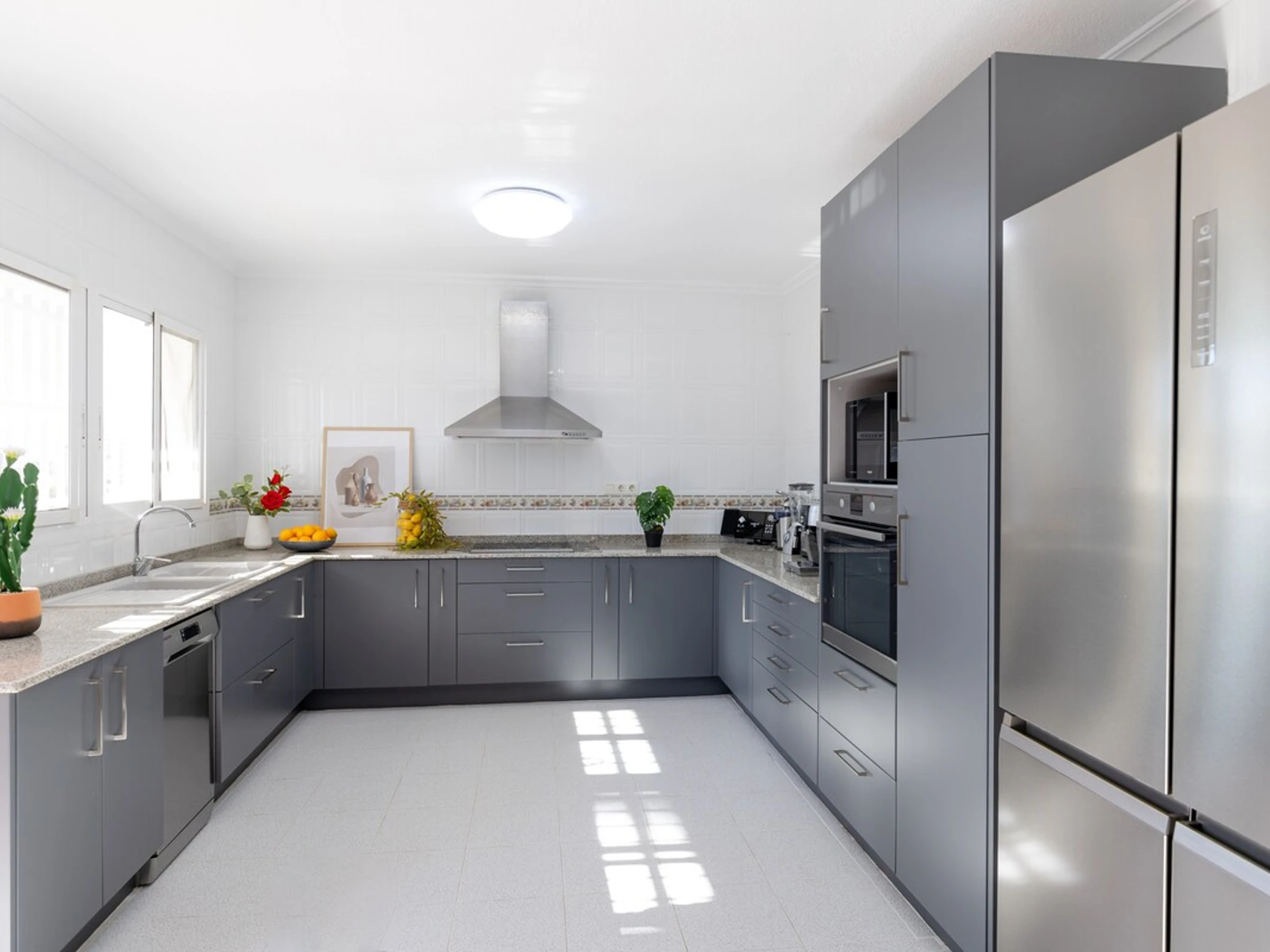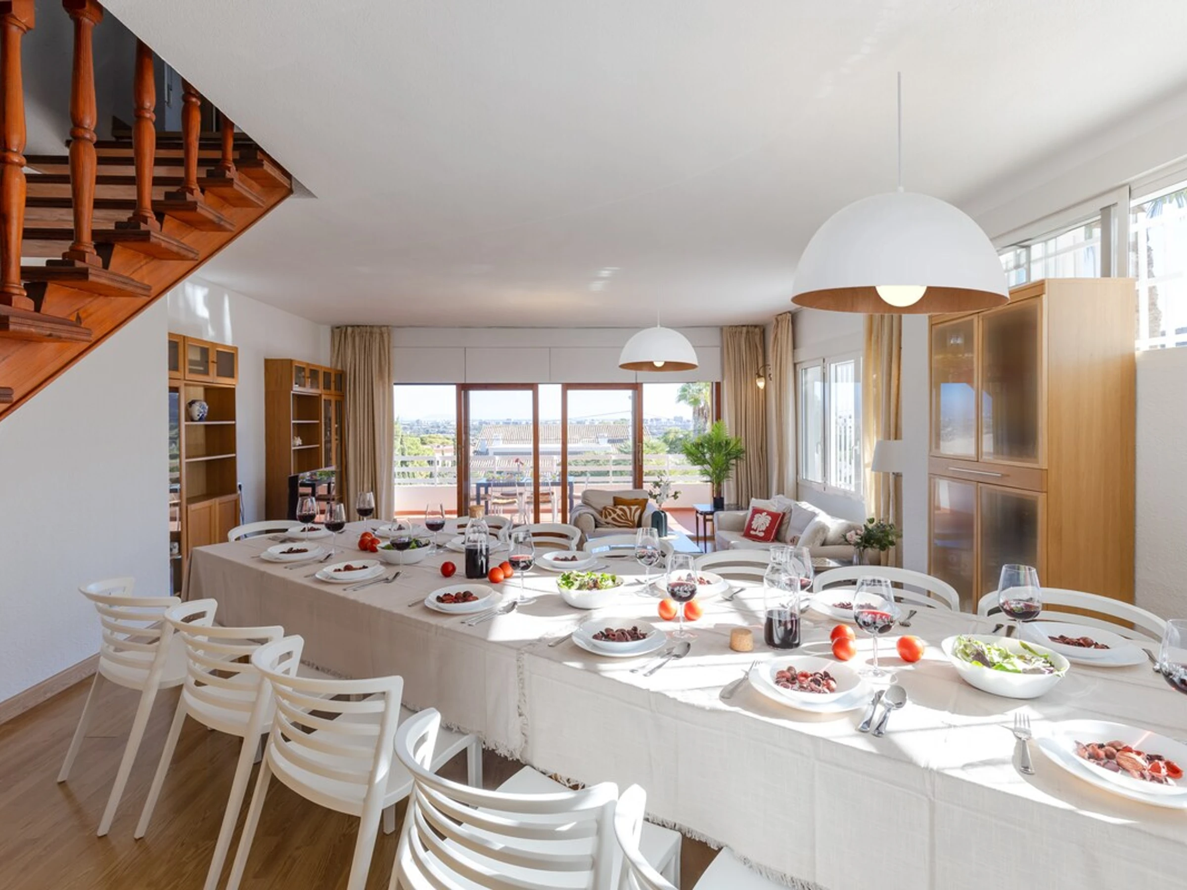 Inspired by Mediterranean design, an urban oasis in the city of Alicante, this large two-story house is built for entertainment and relaxation. The property offers several outdoor areas to unwind. Numerous windows flood the space with natural light and open onto a porch leading to the pool. The garden features a spacious chill-out area, lawn, barbecue, and dining area, all with stunning mountain views.