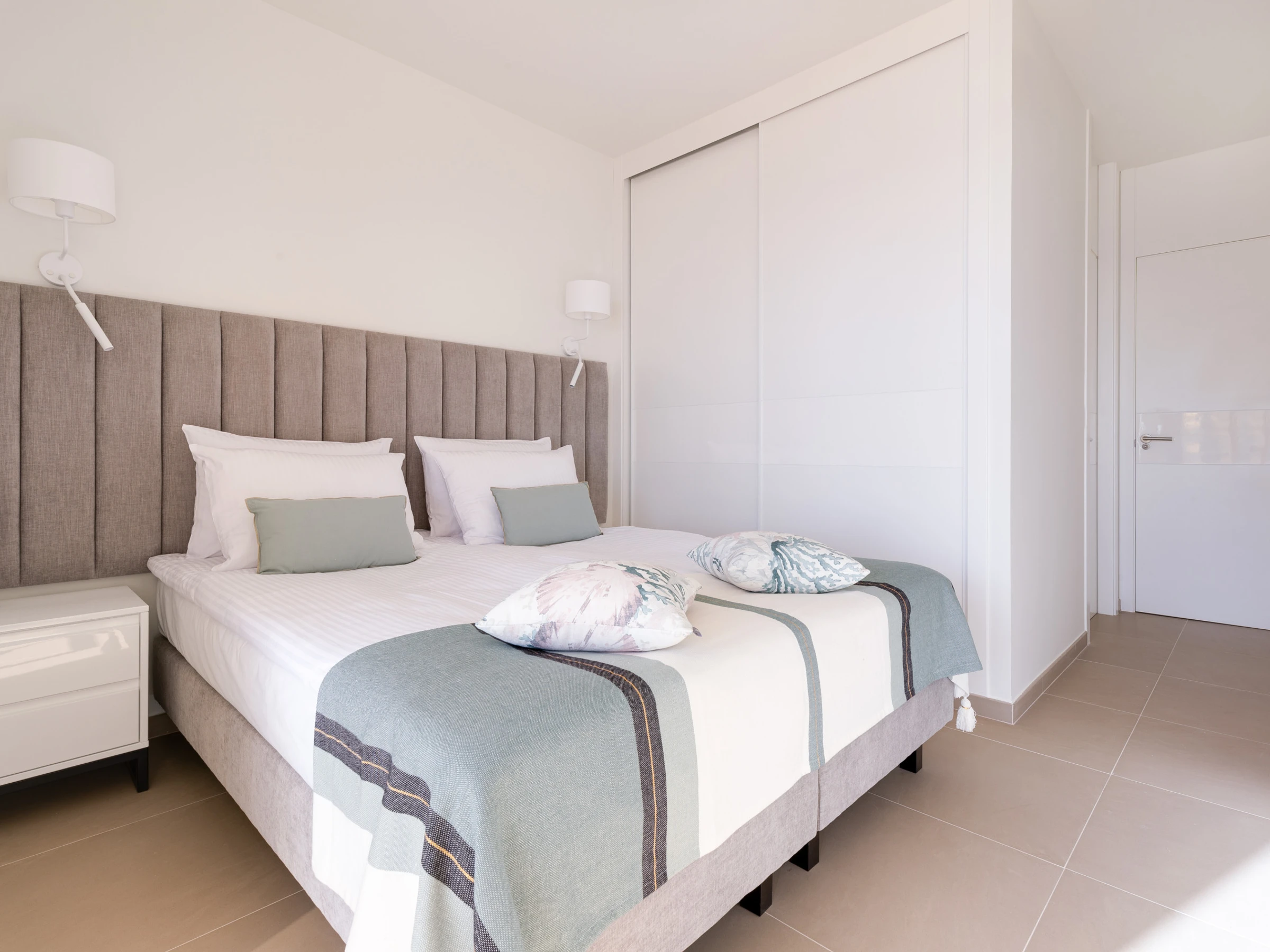 Both bedrooms have large built-in wardrobes with white lacquered doors and panelling inside.