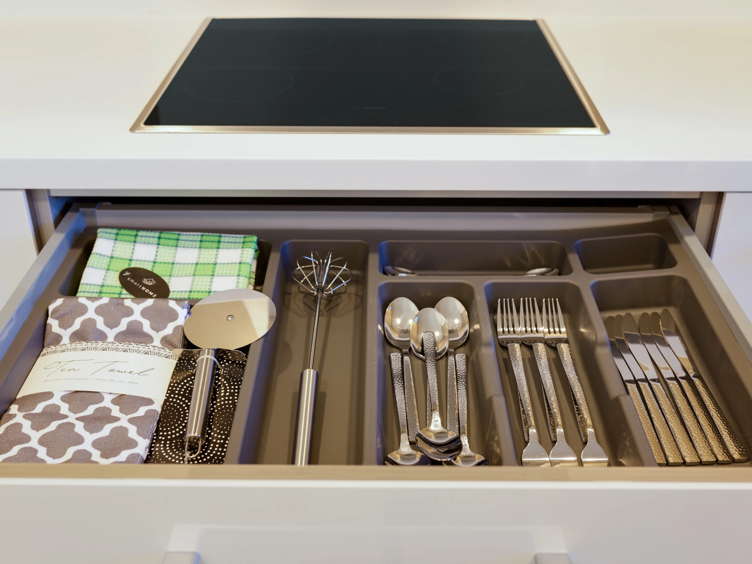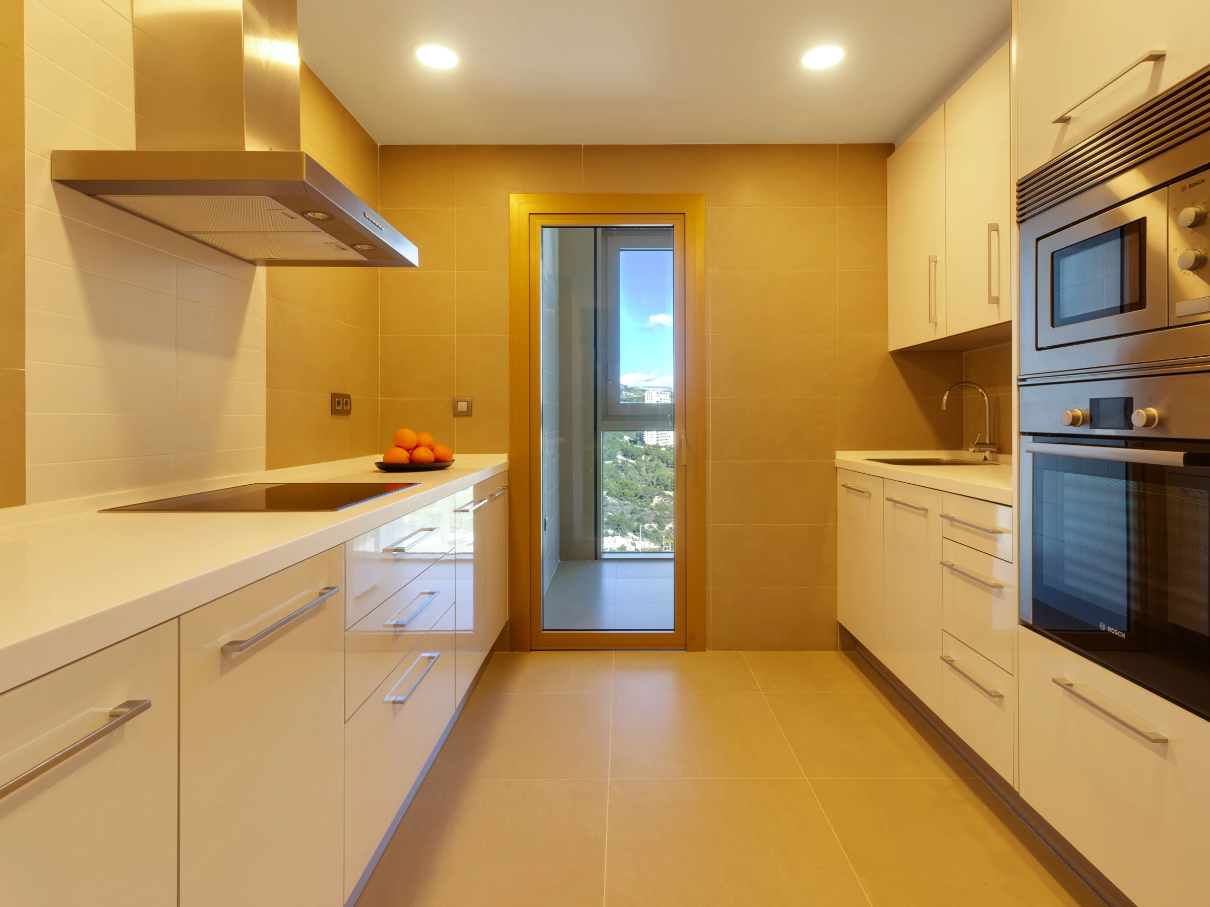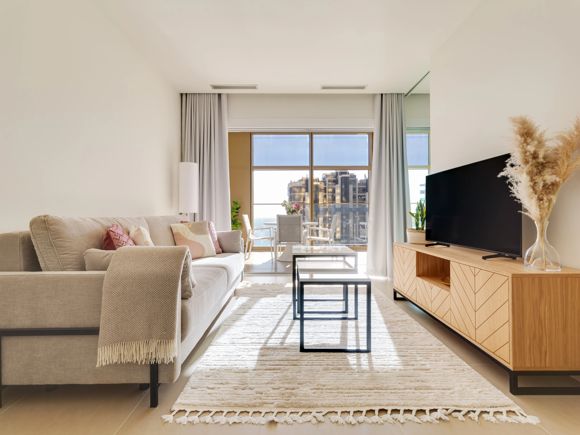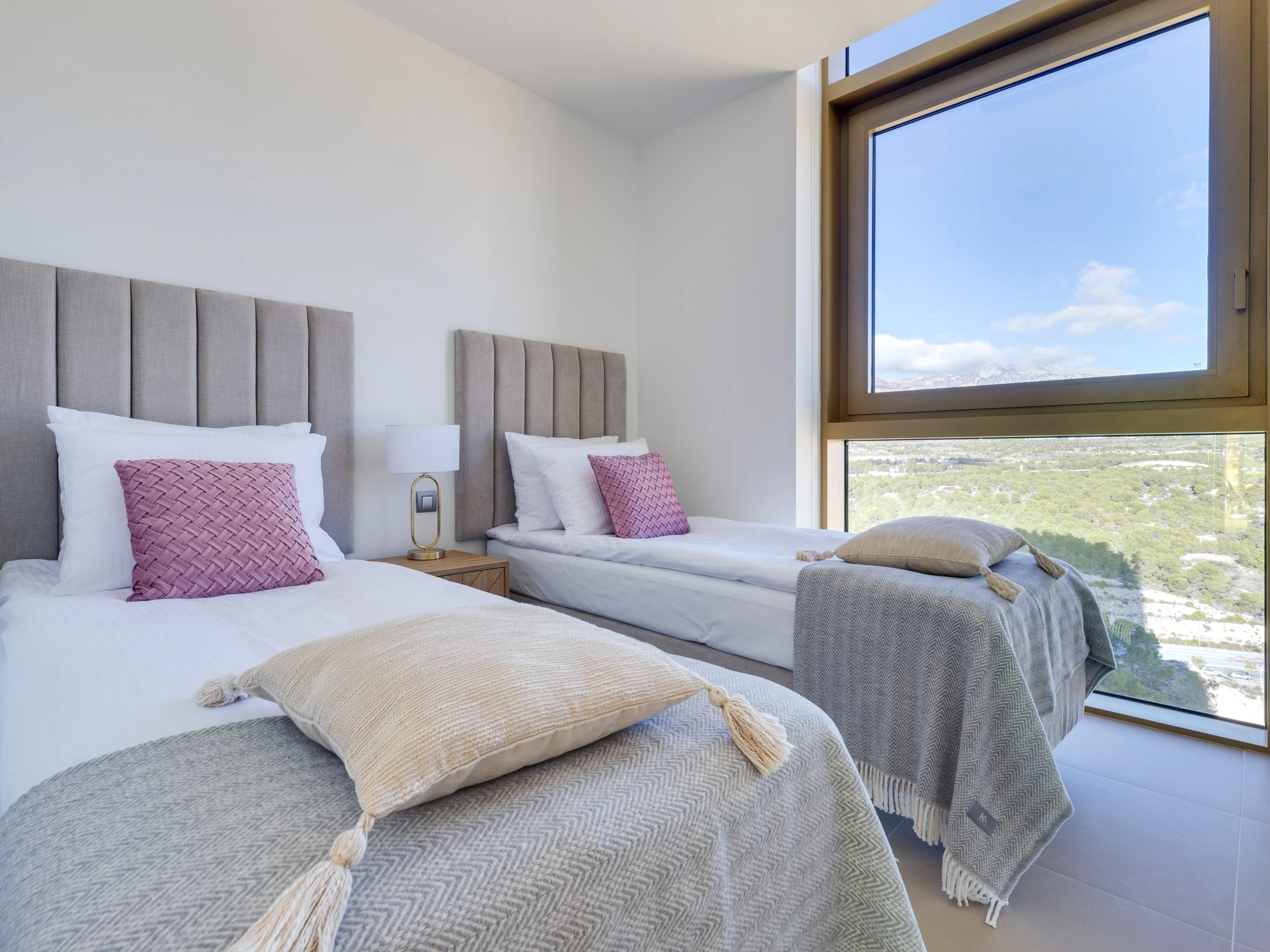 The living room is spacious, cosy and bright throughout the day, with panoramic sea views. It has large windows for maximum comfort, with high quality windows and doors.