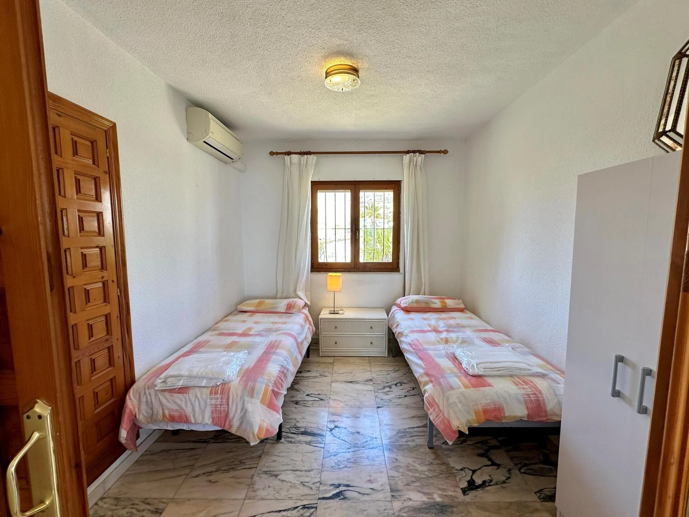 * bedroom with air conditioning and 2 single beds (measuring 180 by 90 cm)