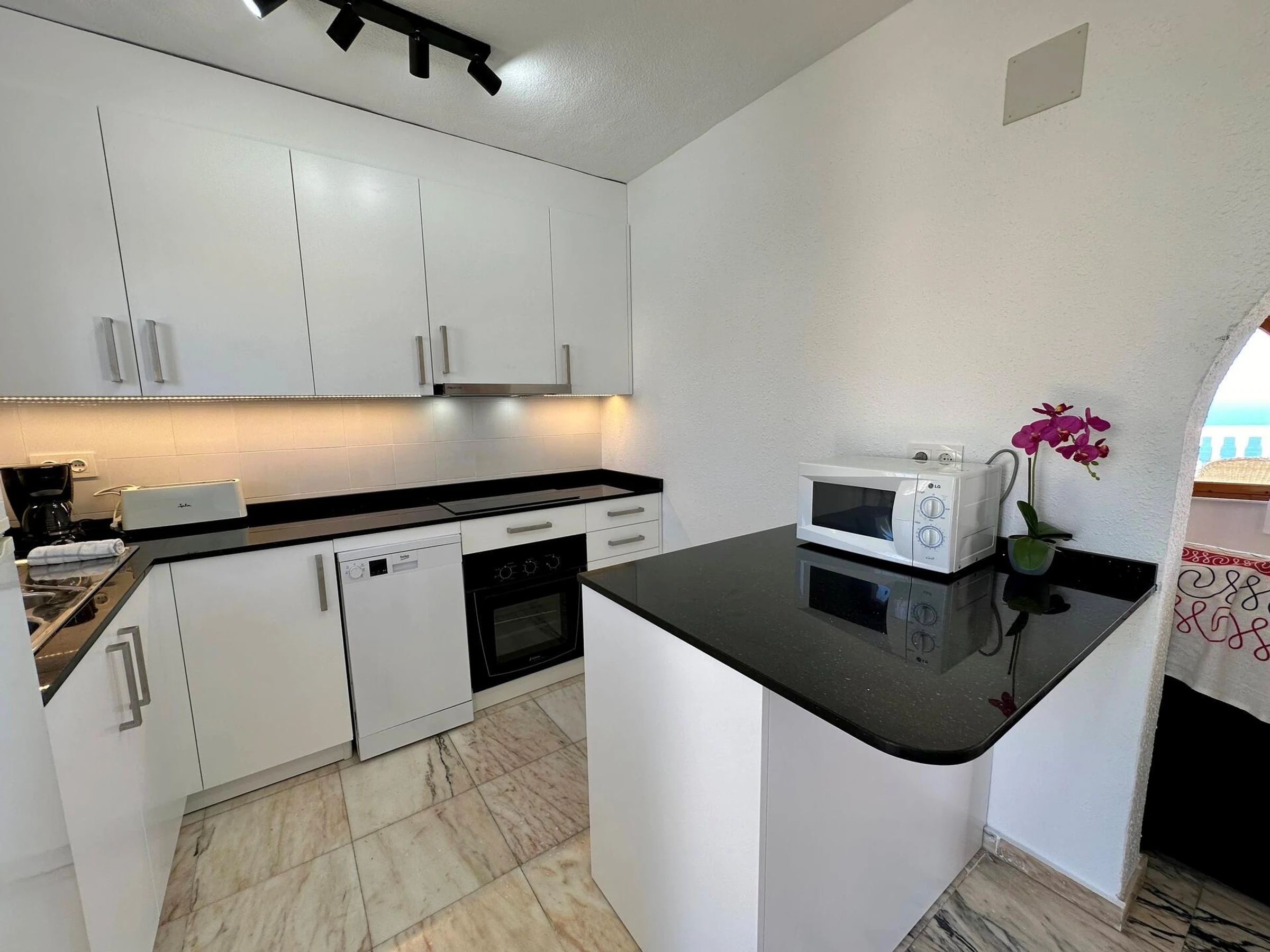 * open kitchen with electric hob, electric oven, microwave, dishwasher,