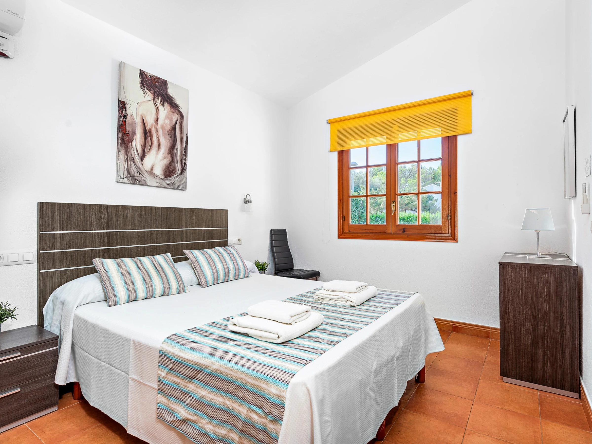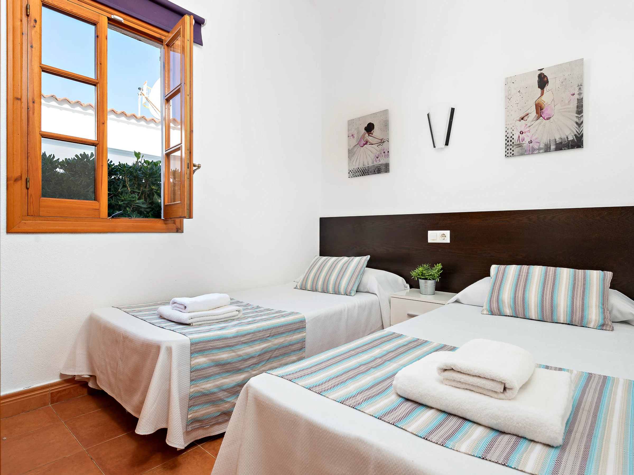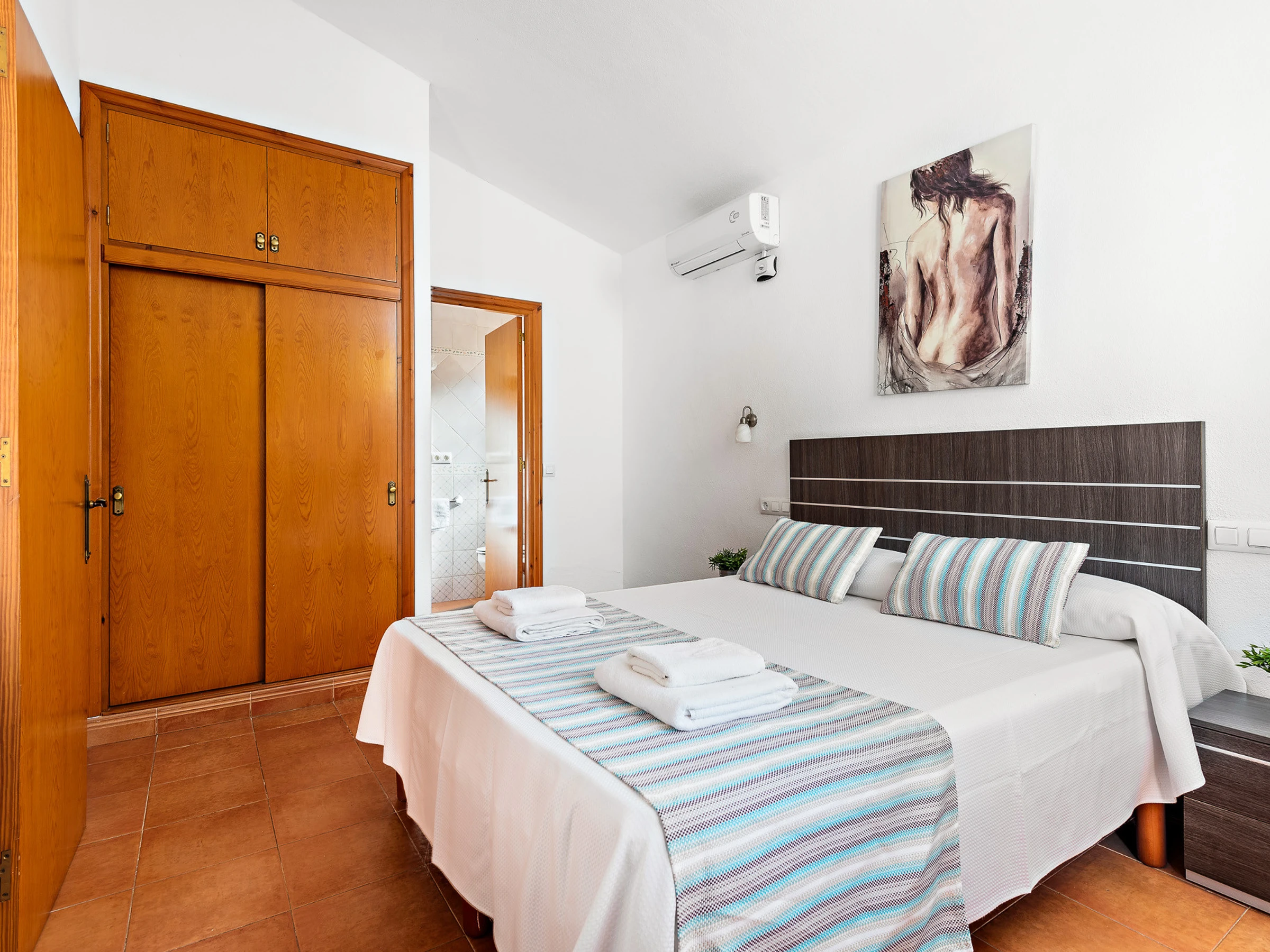 It consists of three air-conditioned bedrooms, one of them with a double bed and en-suite bathroom with bathtub and two other double bedrooms with two beds each, and they share a bathroom with bathtub.