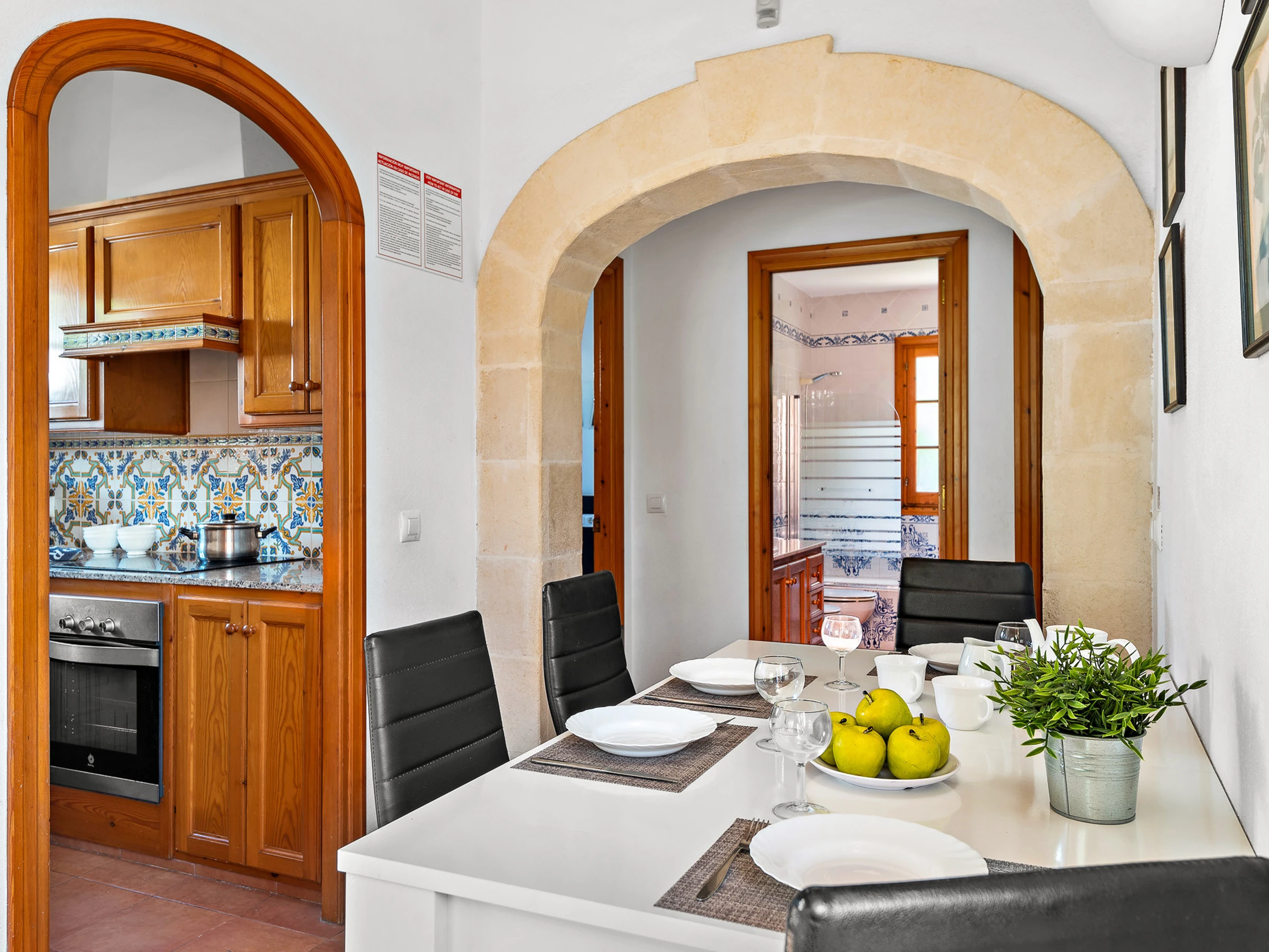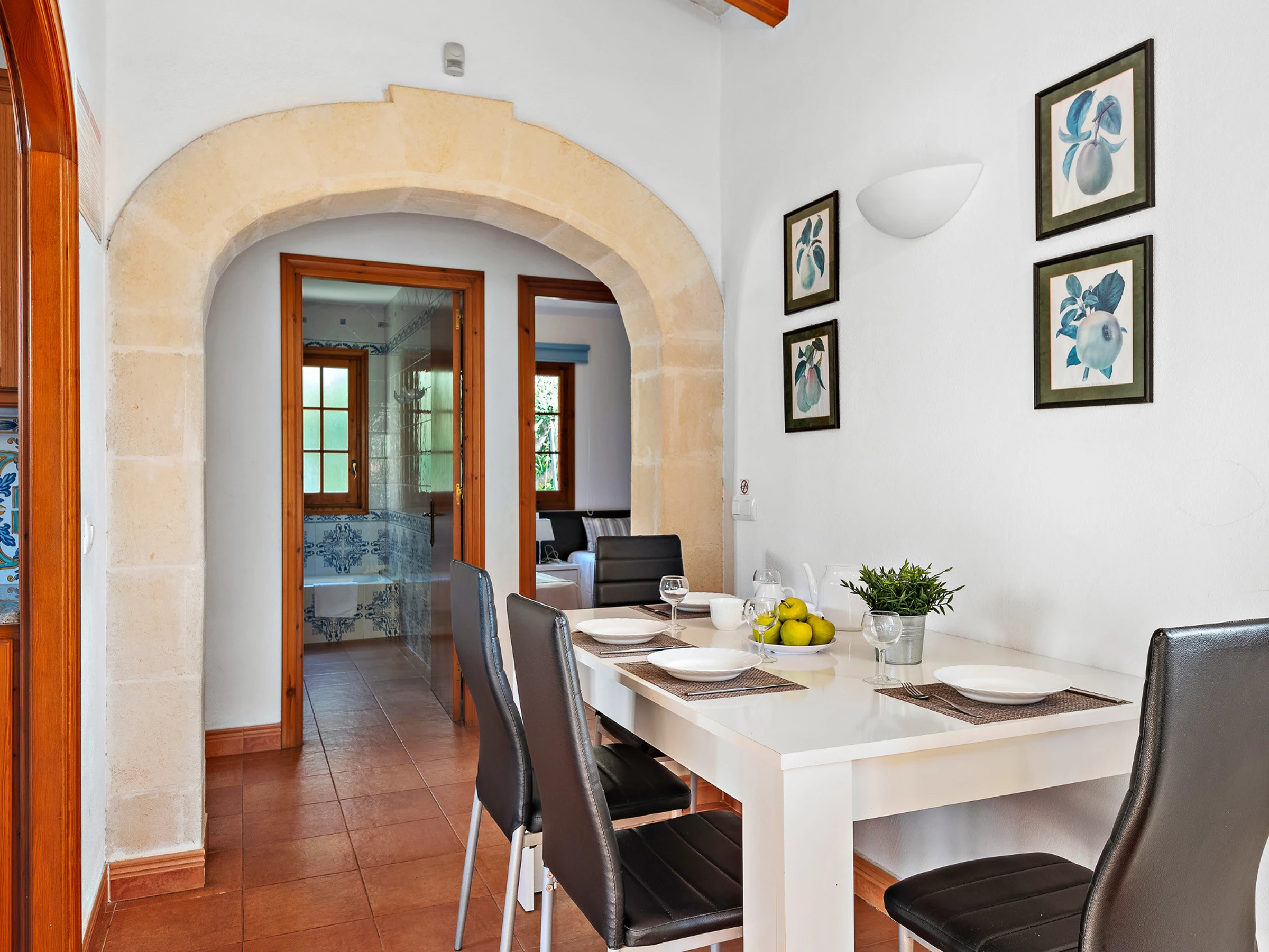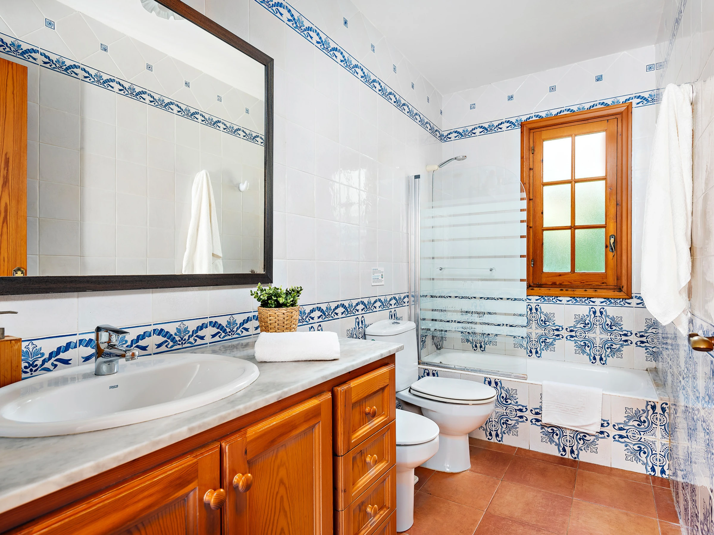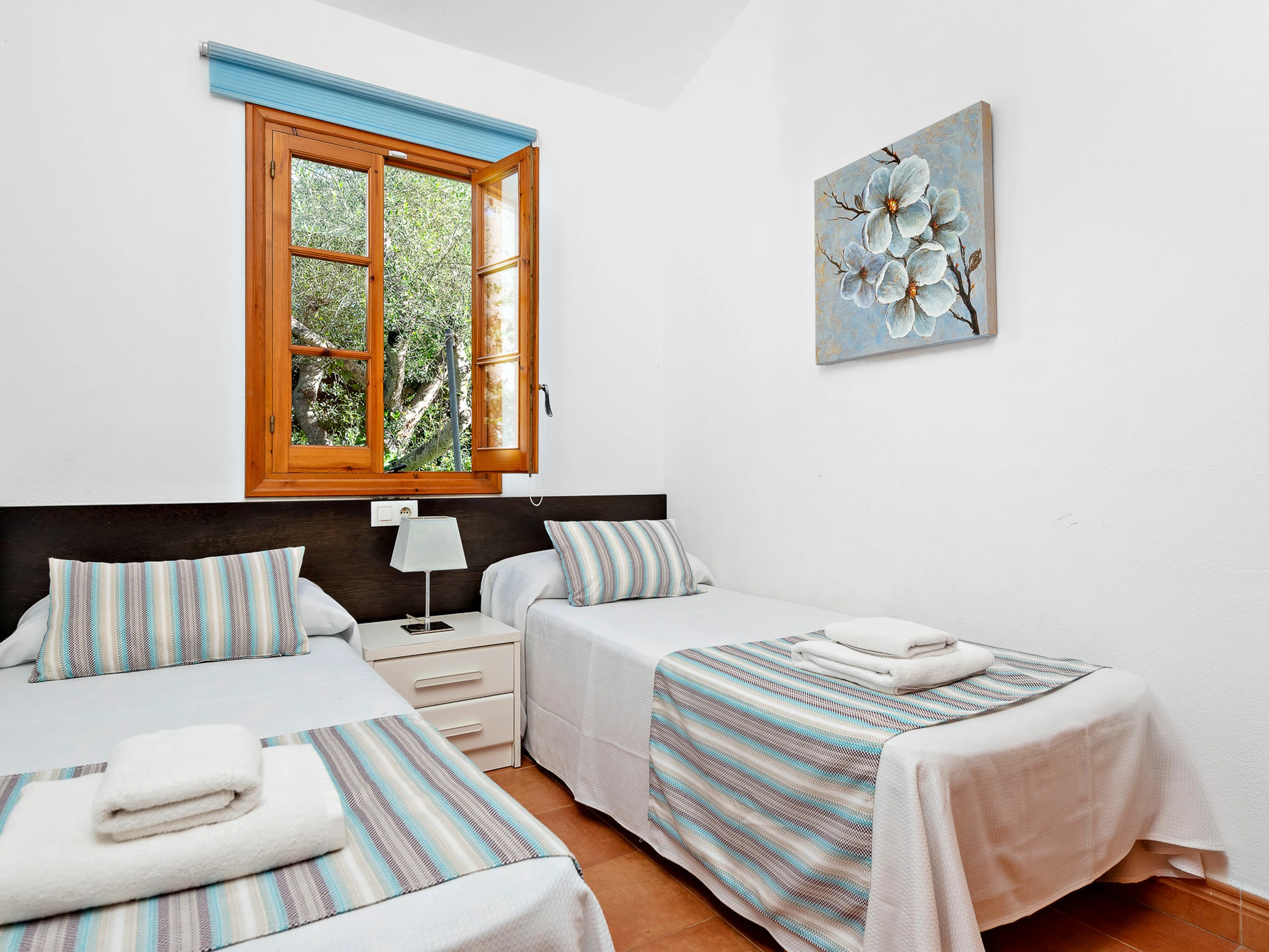 It consists of three air-conditioned bedrooms, one of them with a double bed and en-suite bathroom with bathtub and two other double bedrooms with two beds each, and they share a bathroom with bathtub.