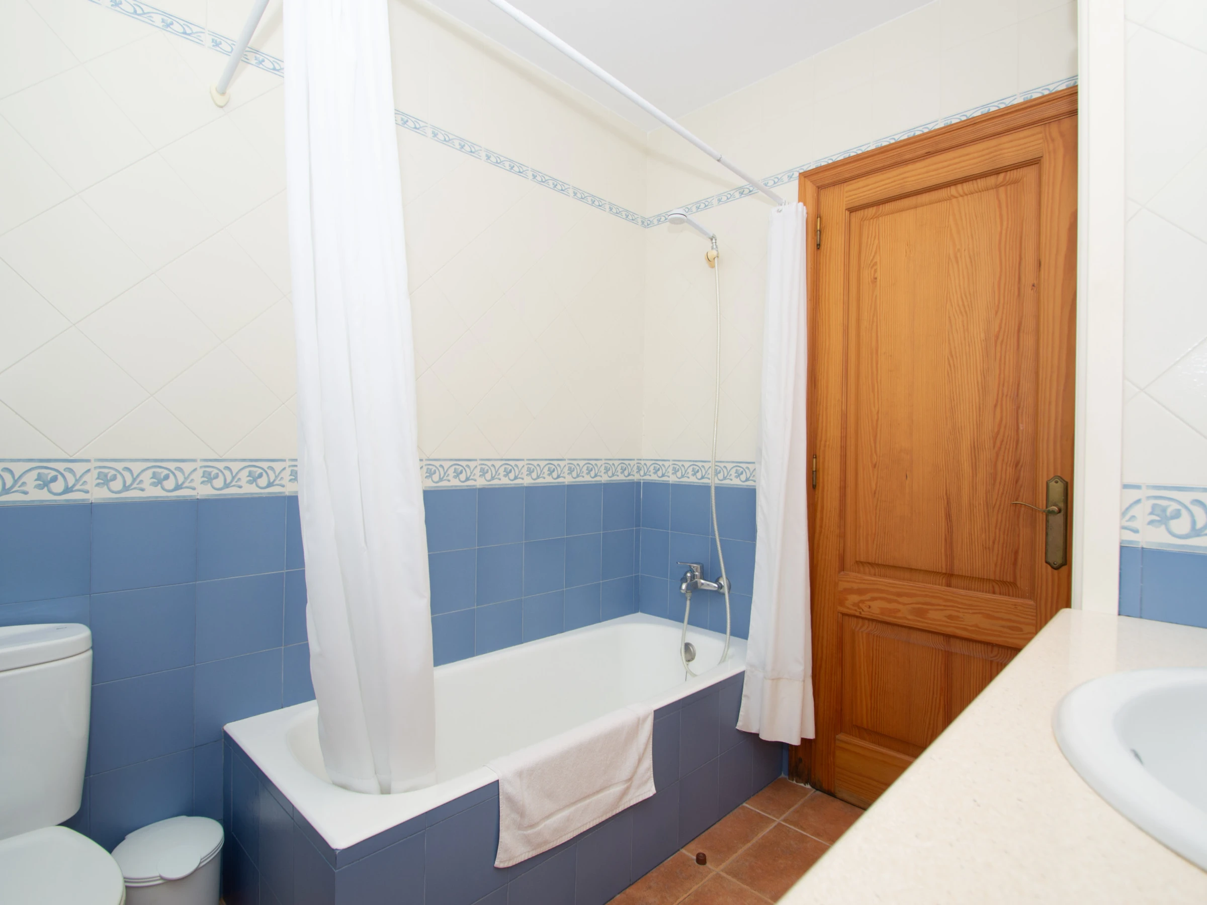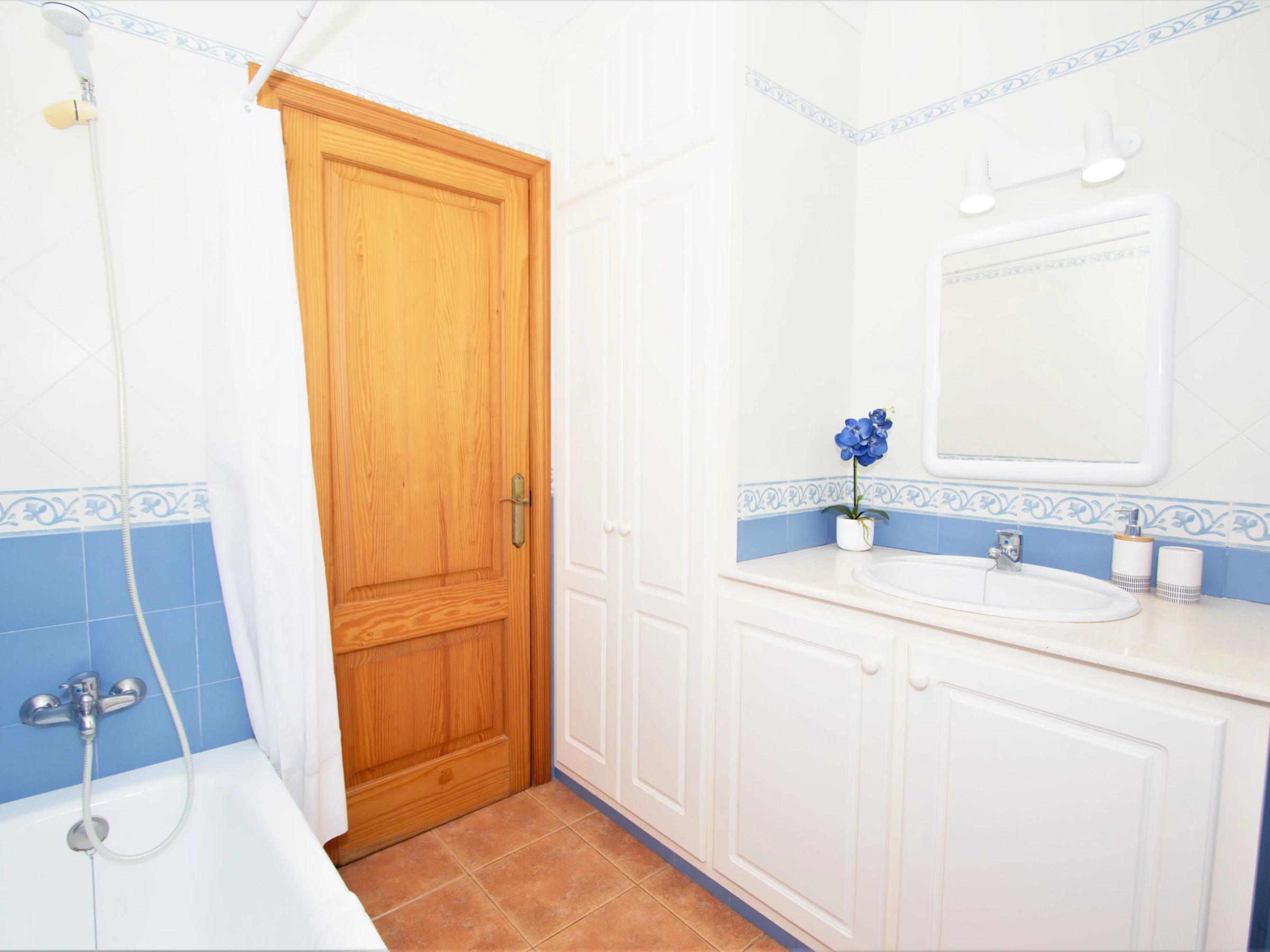 The other rooms are located on the first level. The first double room has two single beds and is equipped with a good wardrobe and air conditioning. The other bedroom is equipped with a single bed and has direct access to the balcony, which has beautiful views of the beach. Next, between the two bedrooms, we find the bathroom fully equipped with a bathtub and hairdryer. Finally, the master bedroom consists of a comfortable double bed, a large built-in wardrobe, air conditioning and a full en-suite bathroom. The bathroom is equipped with bathtub. The master bedroom also has a nice balcony and those wonderful views of the Cala Galdana beach, from the bed.