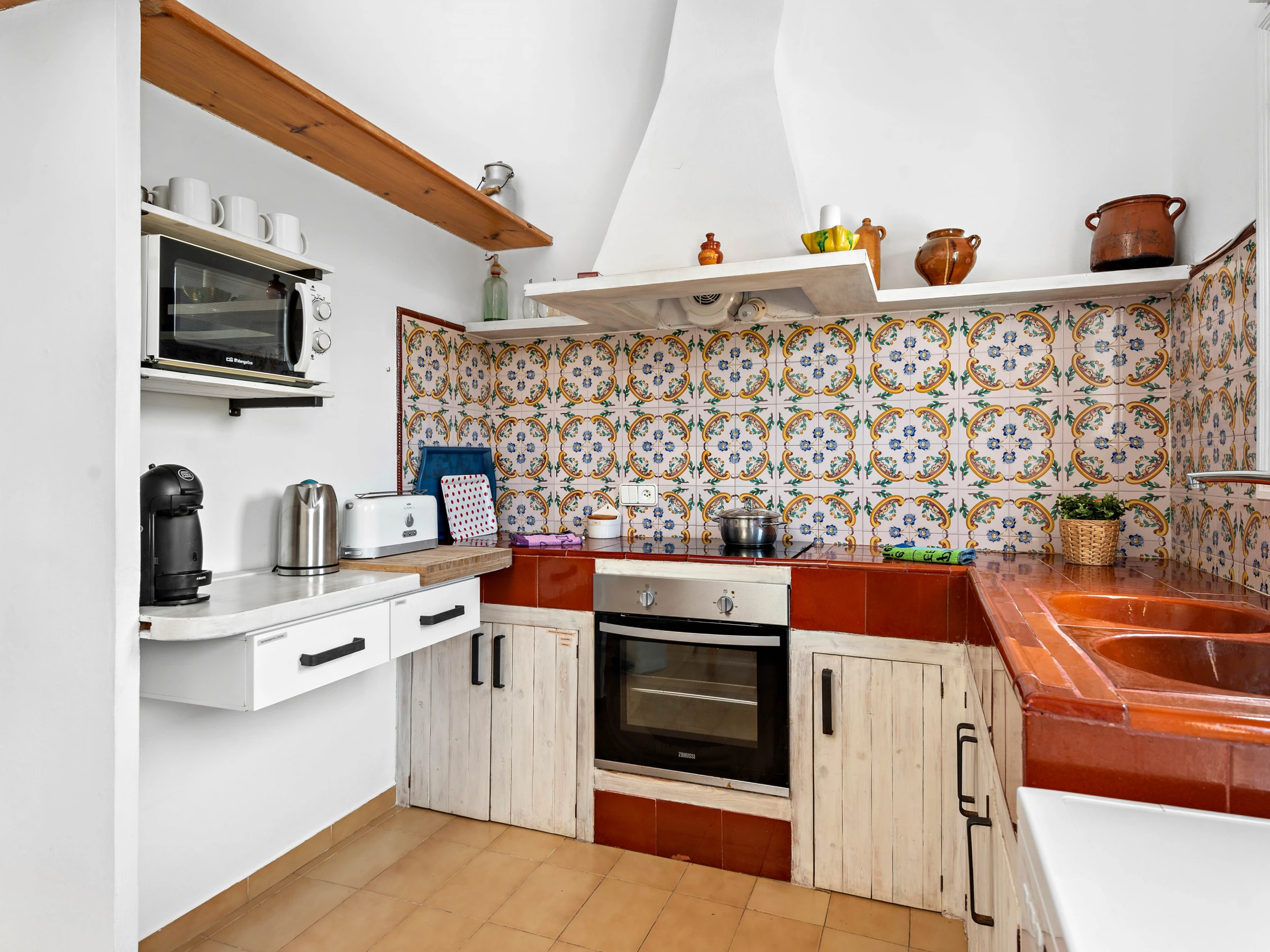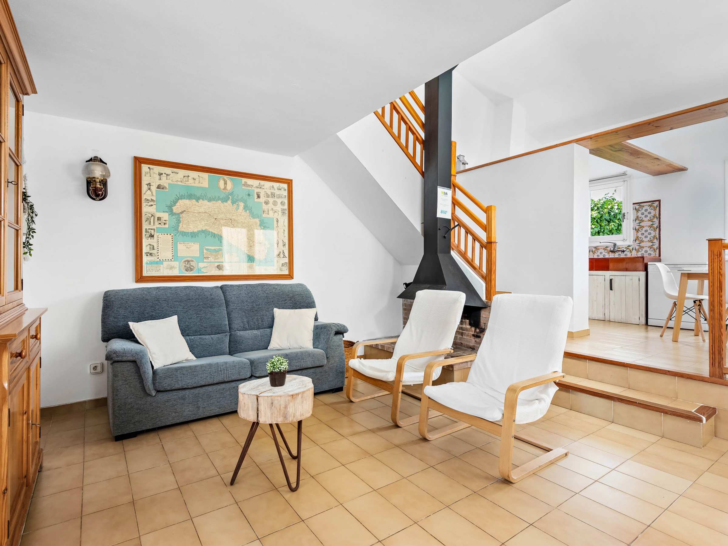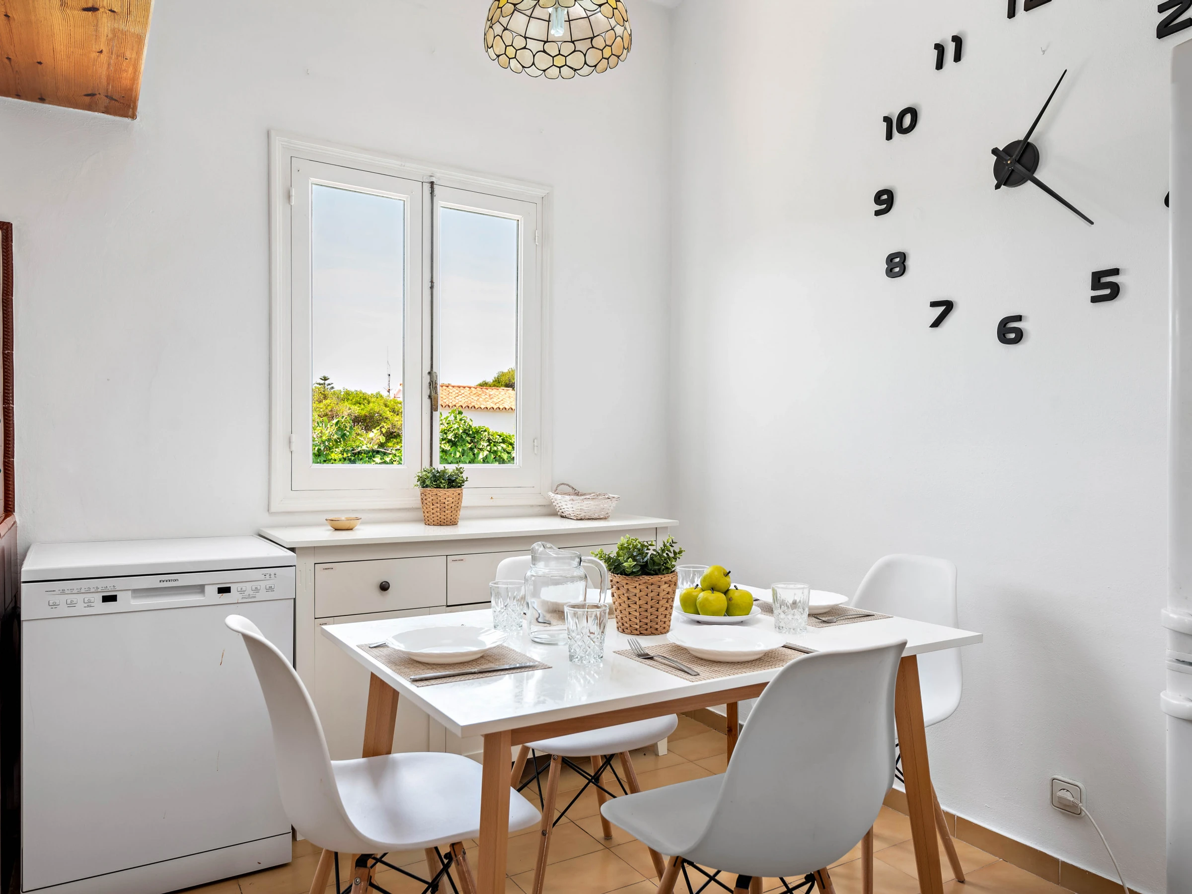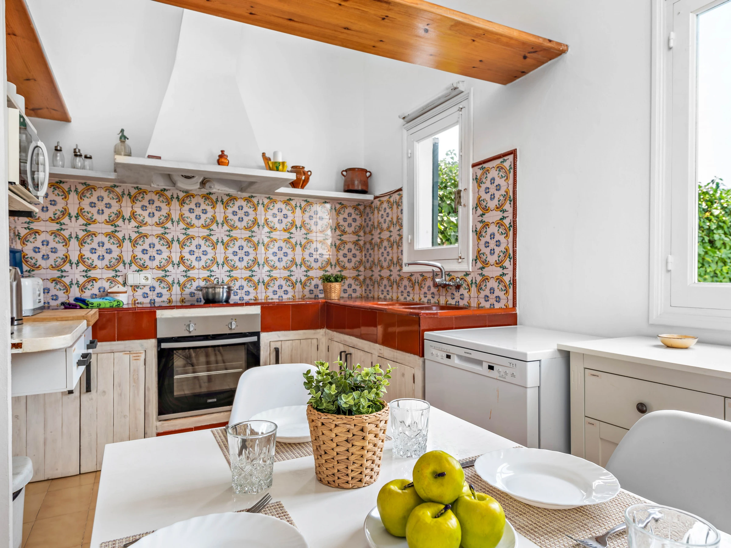 Inside, we find a rustic-style kitchen with everything necessary; electric oven, ceramic hob, microwave, toaster, capsule coffee machine and dishwasher. We also find a dining area with tables and chairs annexed to the bright living room. Living room with TV and WiFi.