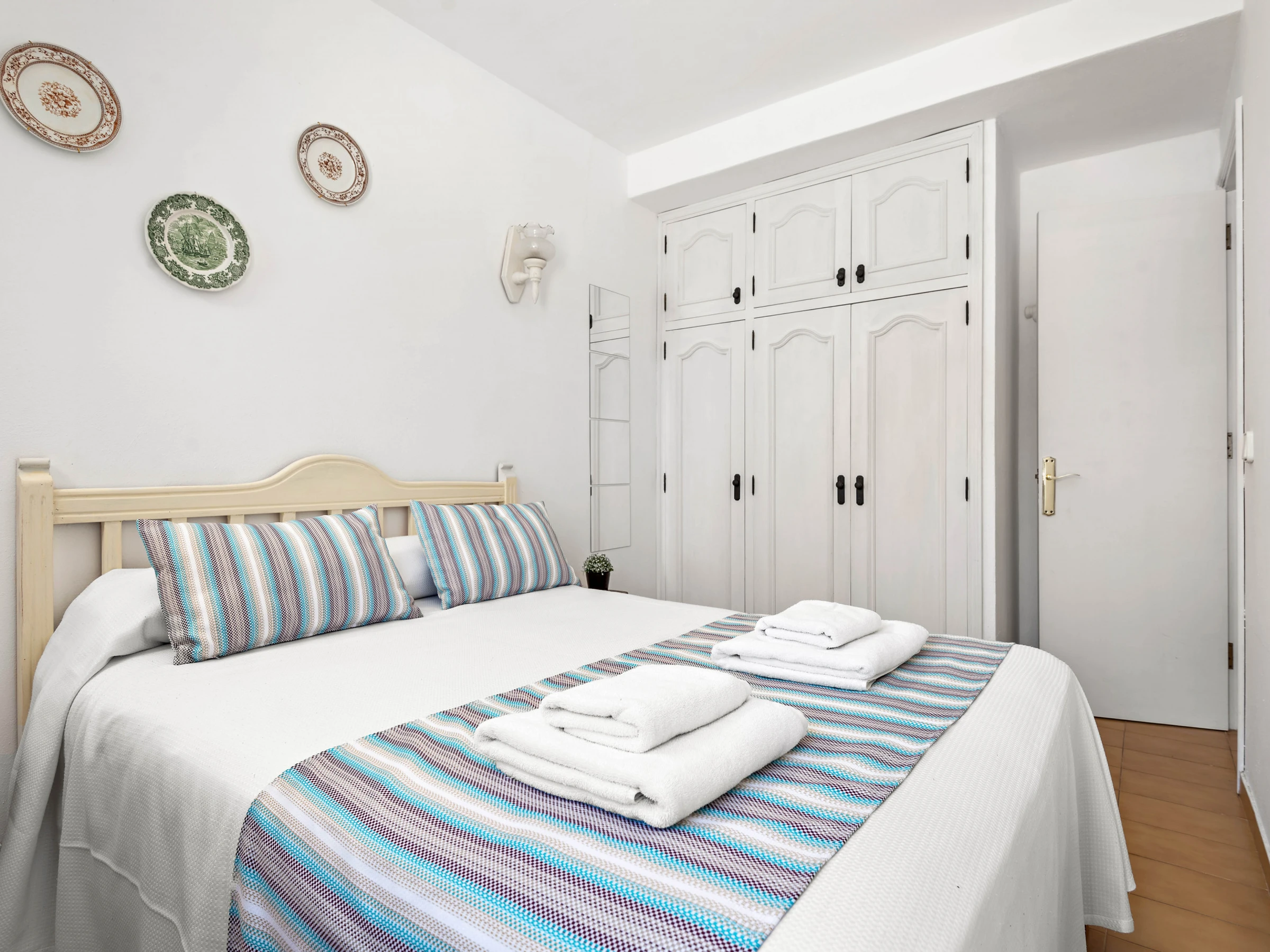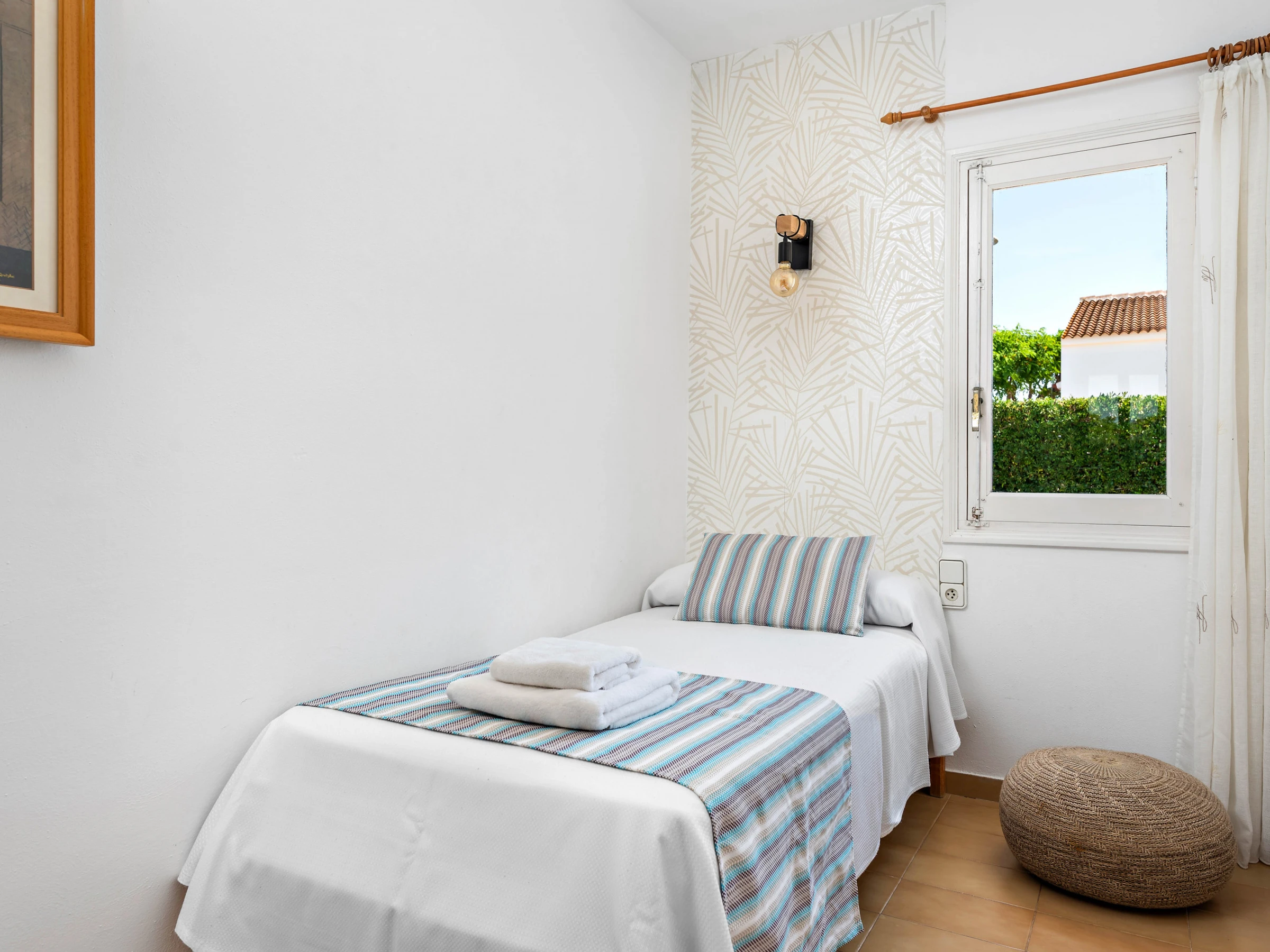 It consists of 3 bedrooms, one of them with 2 single beds with air conditioning, located on the upper floor with access to a private terrace, a master bedroom with air conditioning and a third individual bedroom with a fan (both located on the ground floor). All rooms share a single renovated bathroom with shower and washing machine. The villa has a safe.