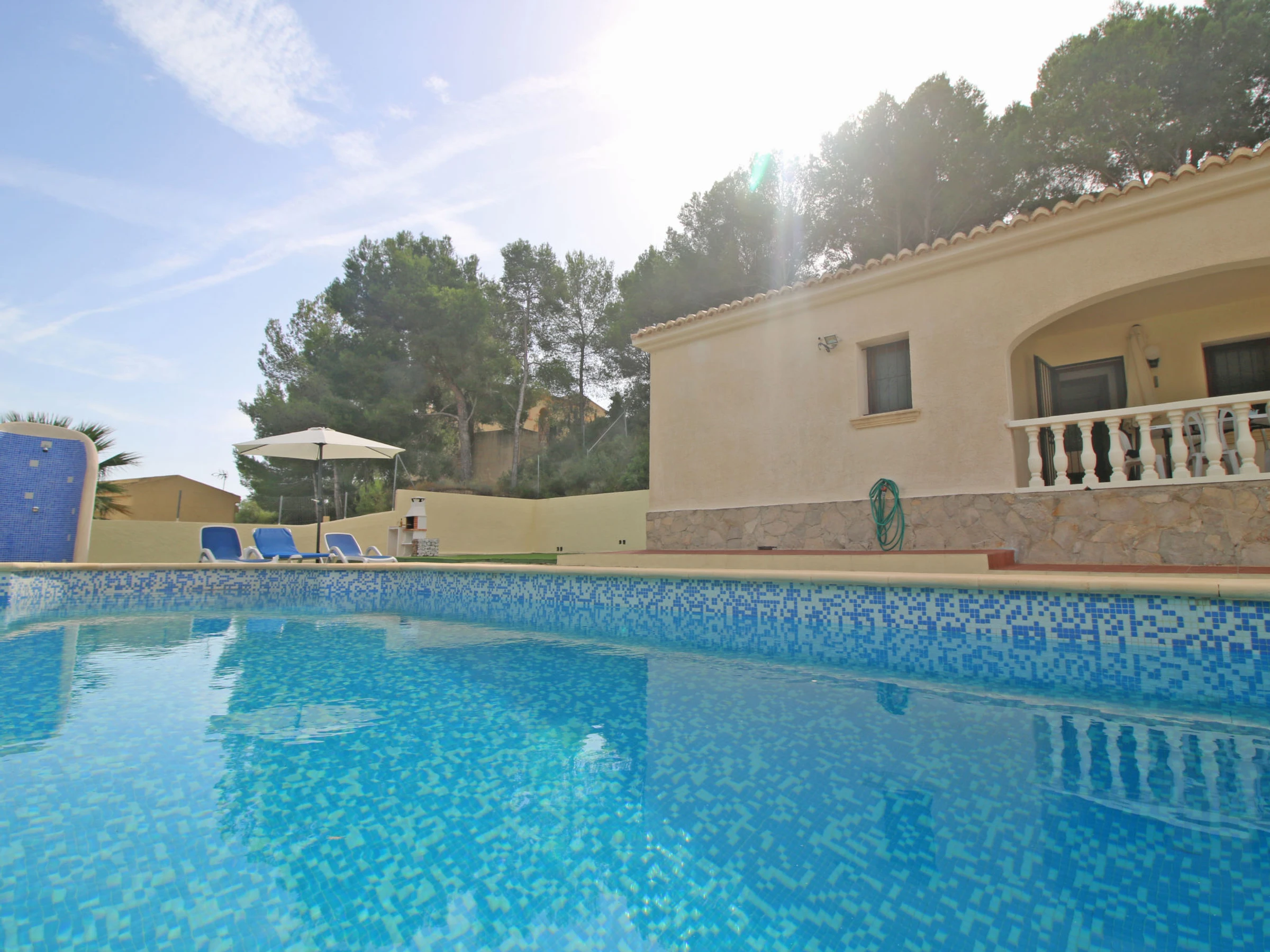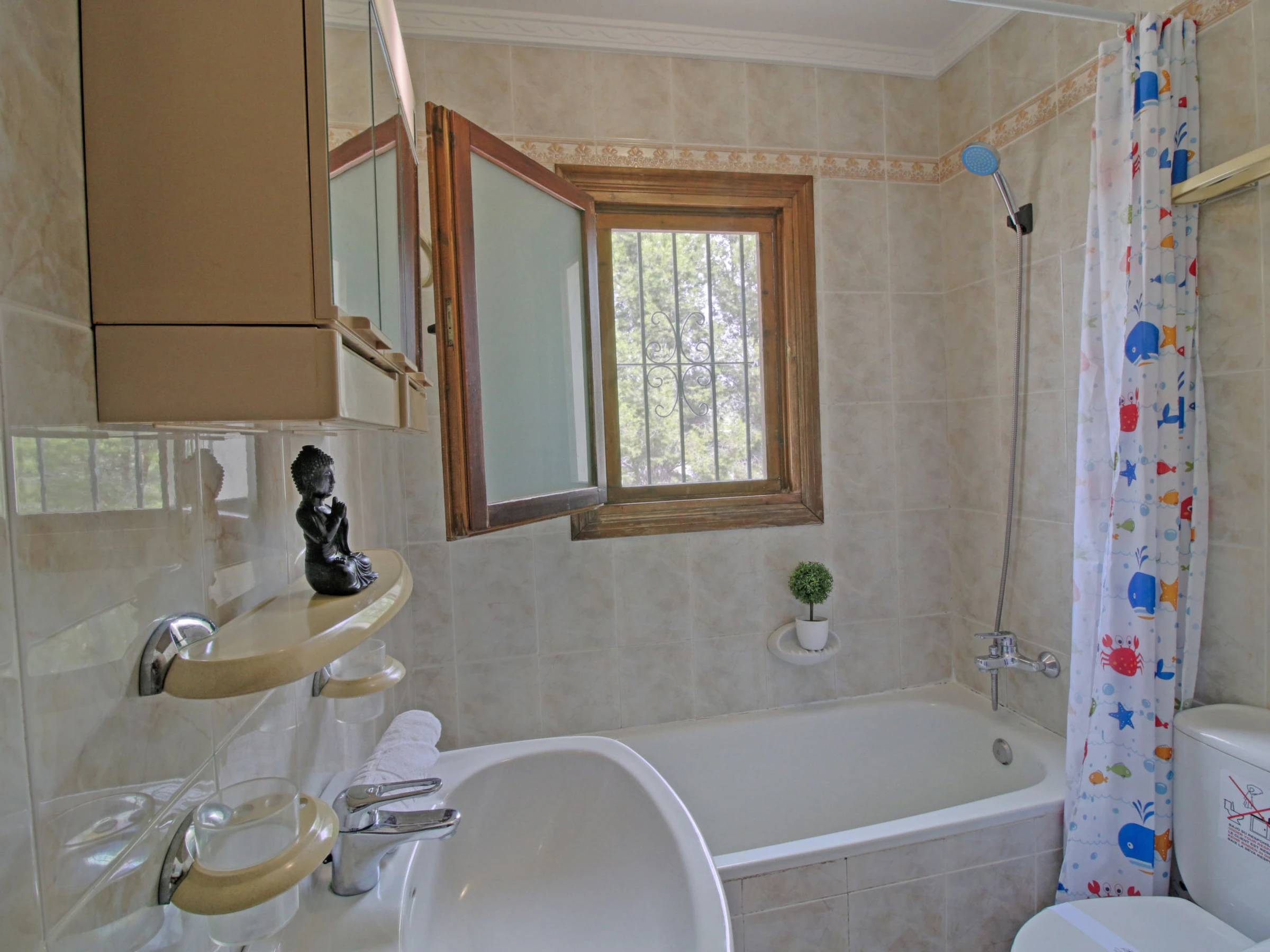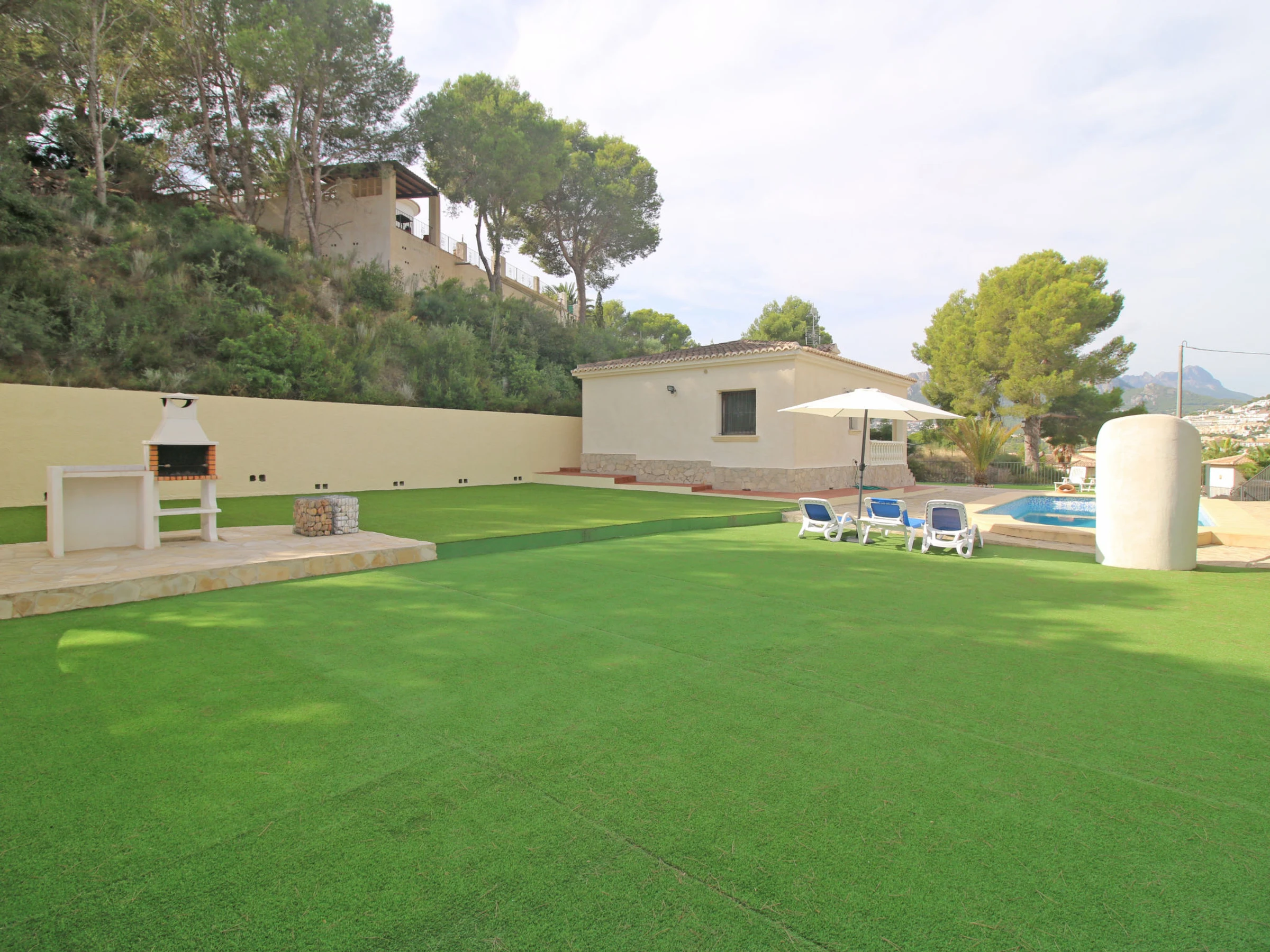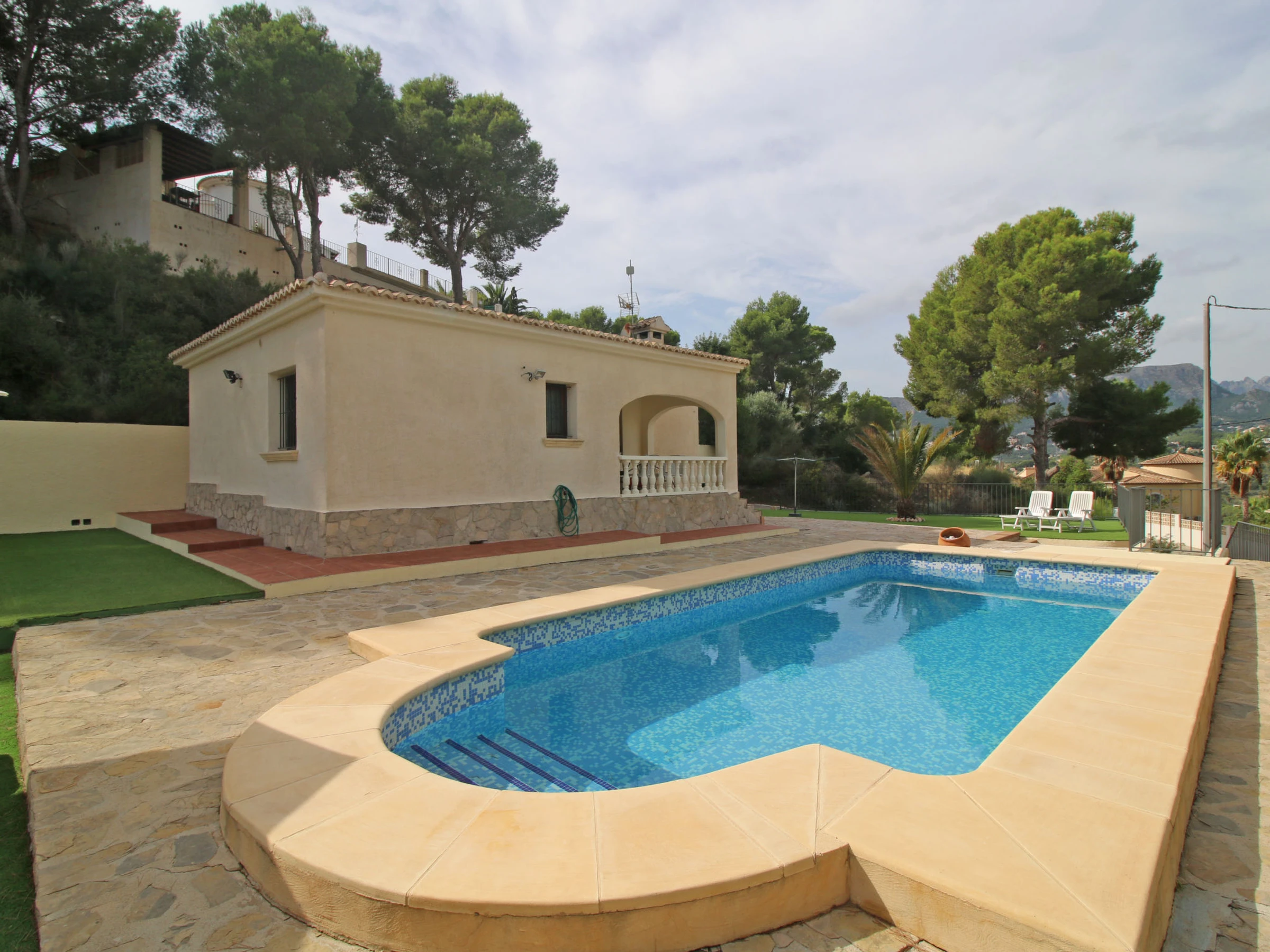 La Vallesa: Small, simple single-family house "Villa Sandra". 3.2 km from the centre of Calpe, in a quiet position, traffic calmed area, 2.5 km from the sea, 2.5 km from the beach. Private: property 1'020 m2 (fenced), garden with lawn, swimming pool angular (8 x 4 m, seasonal availability: [hidden] - [hidden] with internal staircase. Outdoor shower. Supermarket 2 km, restaurant 1.8 km, bar 1.8 km, café 2.5 km, bus stop 1 km, sandy beach "Playa de la Fossa" 3 km. Nearby attractions: Aqualandia, Mundormar, Terra Mítica, Terra Natura, y Benidorm Palace (Benidorm). Hiking paths: Peñón de Ifach, Sierra de Oltà.