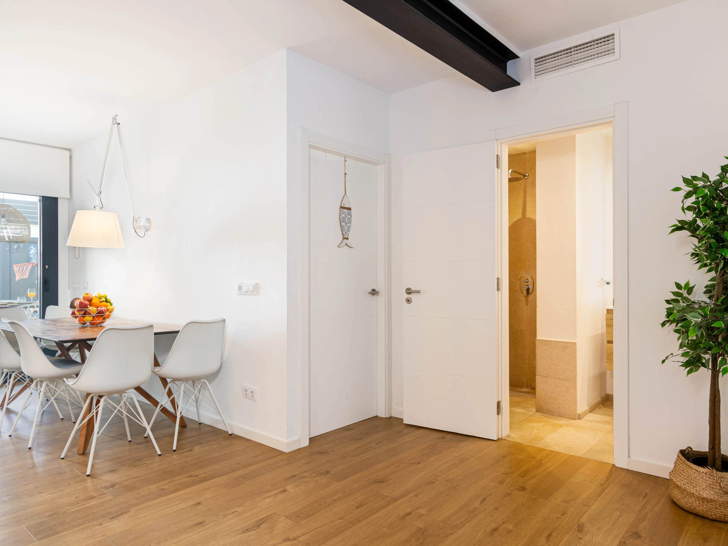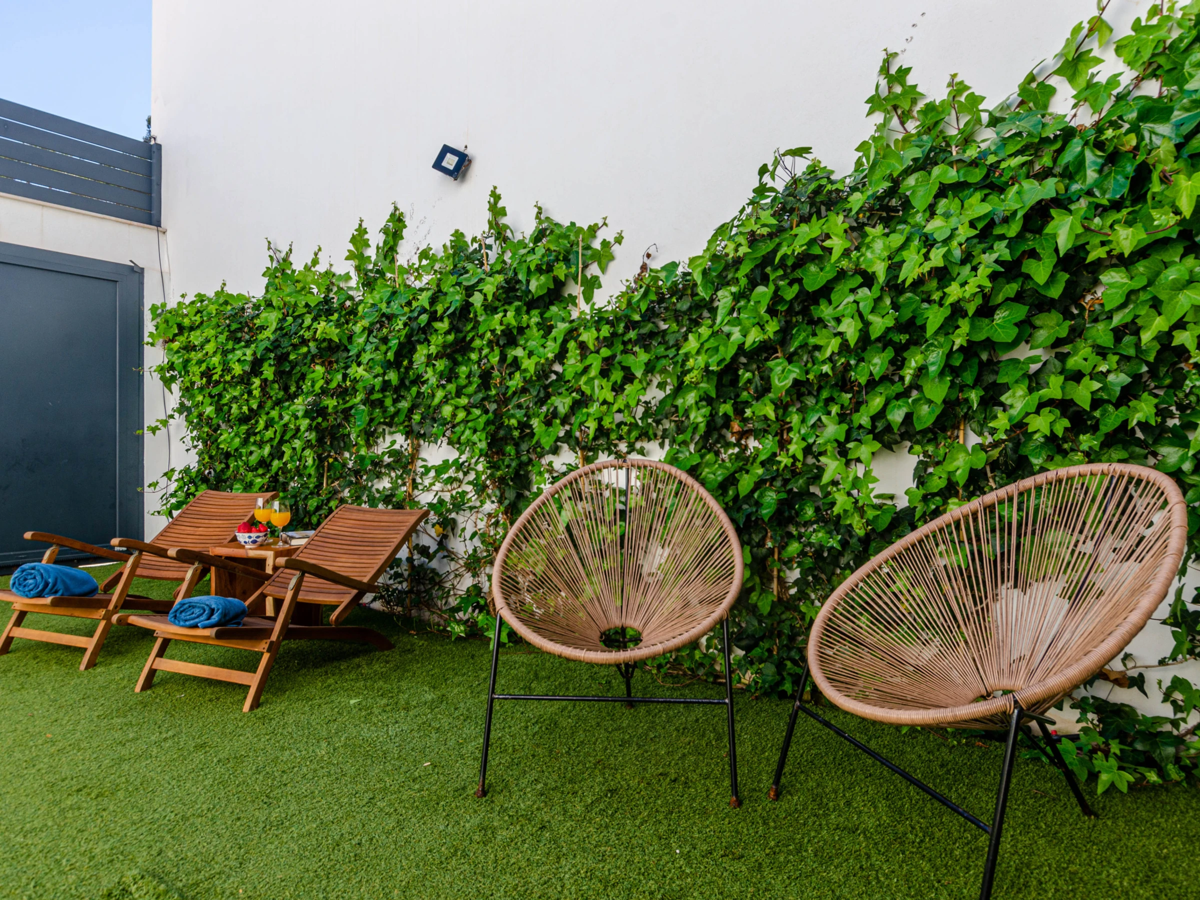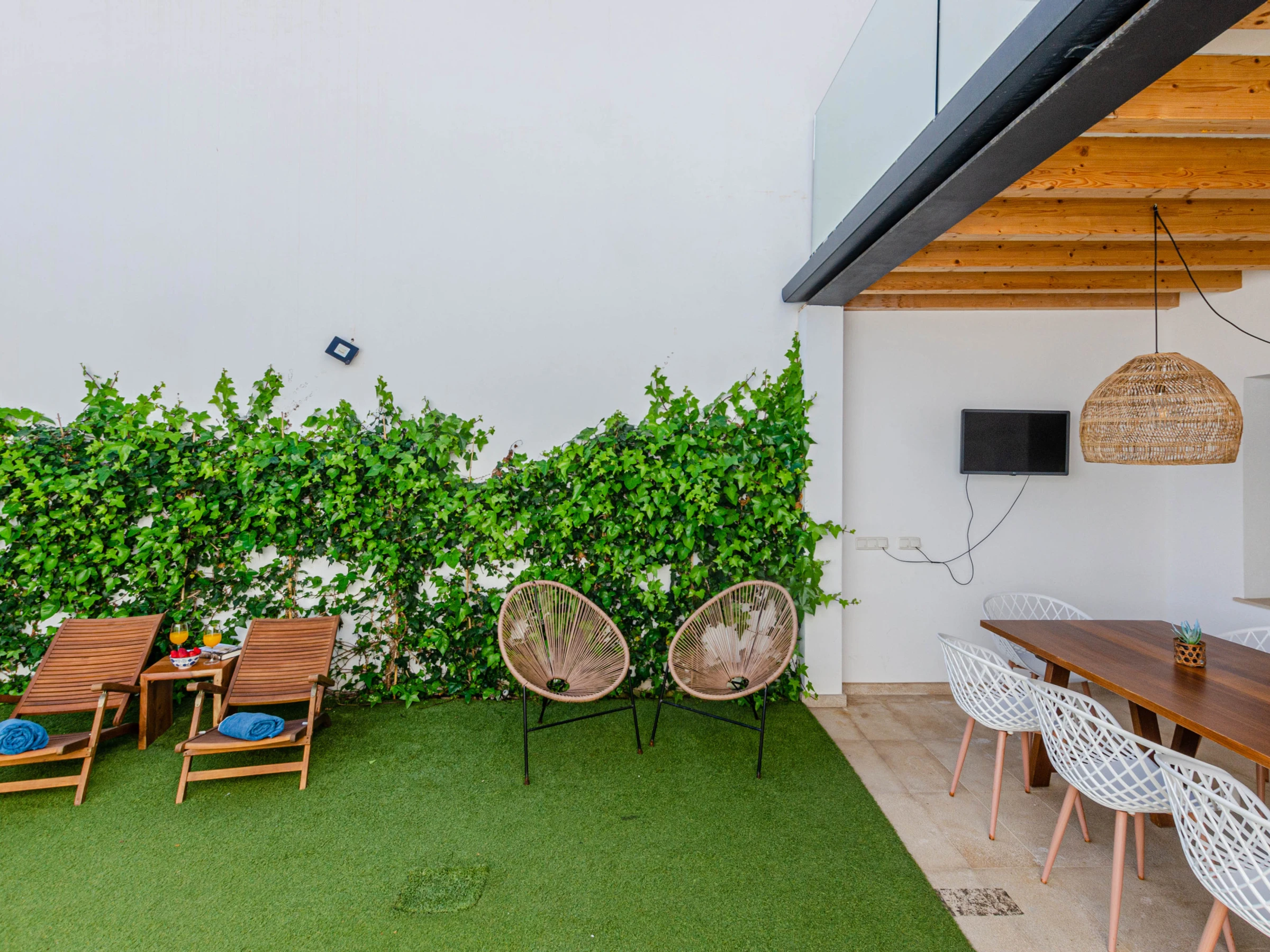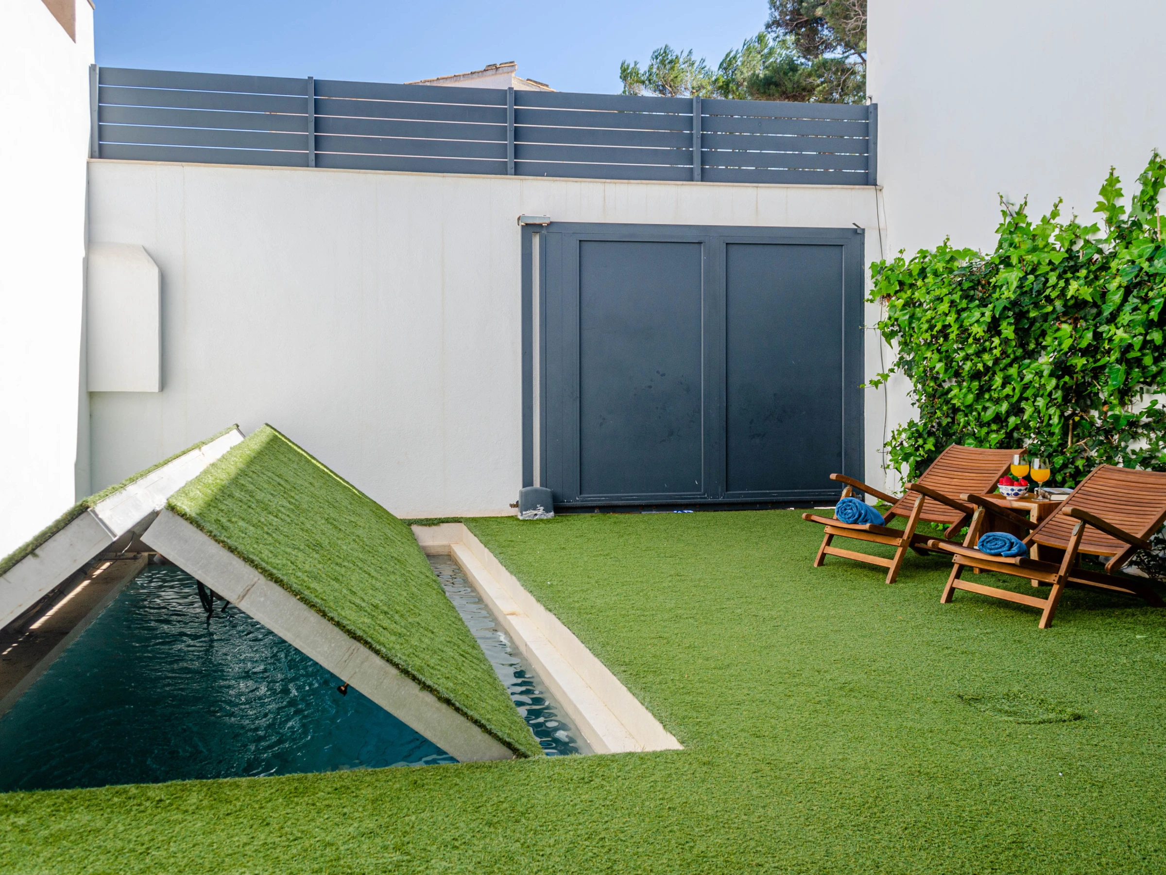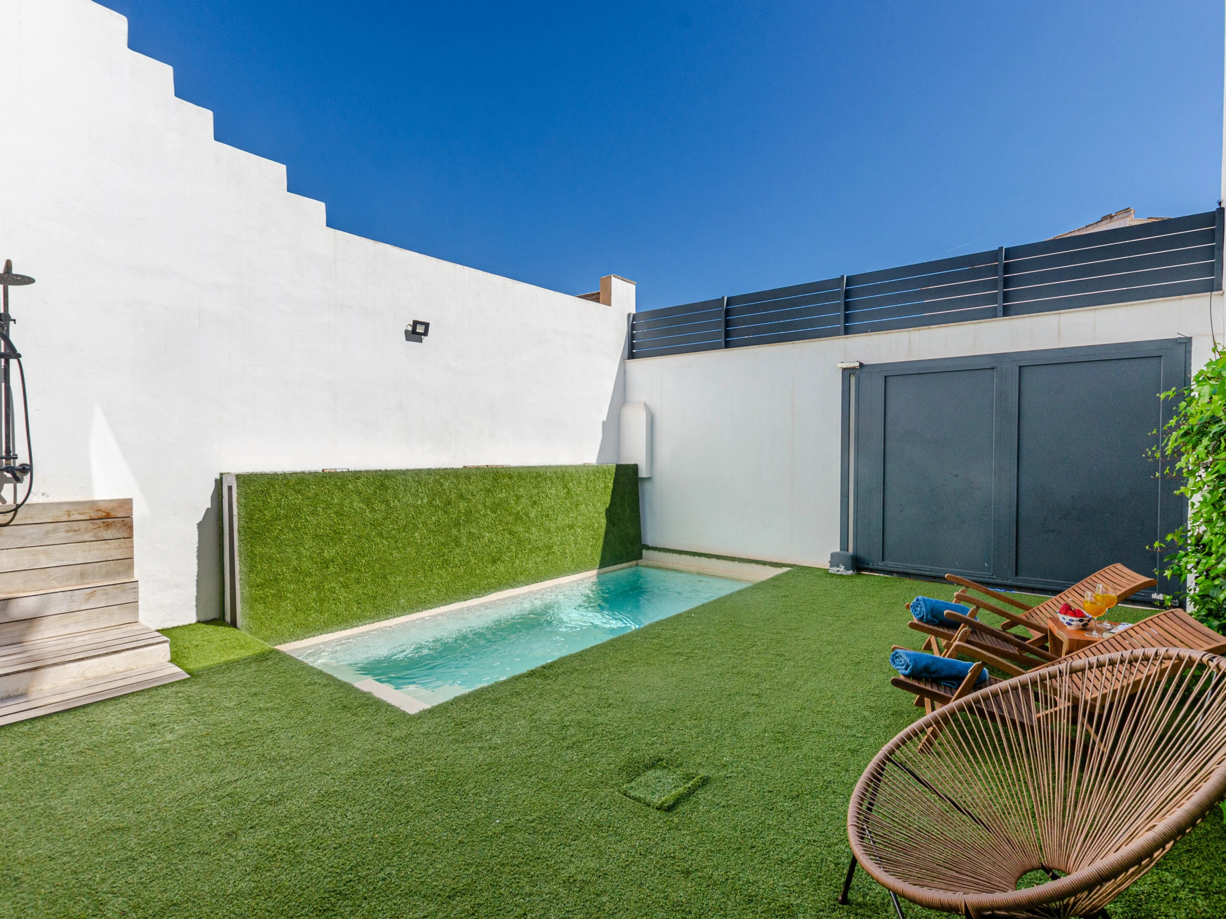 Enjoy the private saltwater pool, measuring 4 x 2 meters and 1.5 meters deep, equipped with a secure closing system for children, allowing you to relax while the little ones play safely. The garden, with its well-maintained artificial grass, invites relaxation and outdoor entertainment, with two comfortable sun loungers for sunbathing and an elegantly furnished porch, equipped with a dining table and an electric awning for enjoying delicious outdoor meals. For the little ones, a complete set of equipment is provided, including floaties, balls, and pool toys, as well as a practical outdoor shower to cool off after a fun day in the sun.