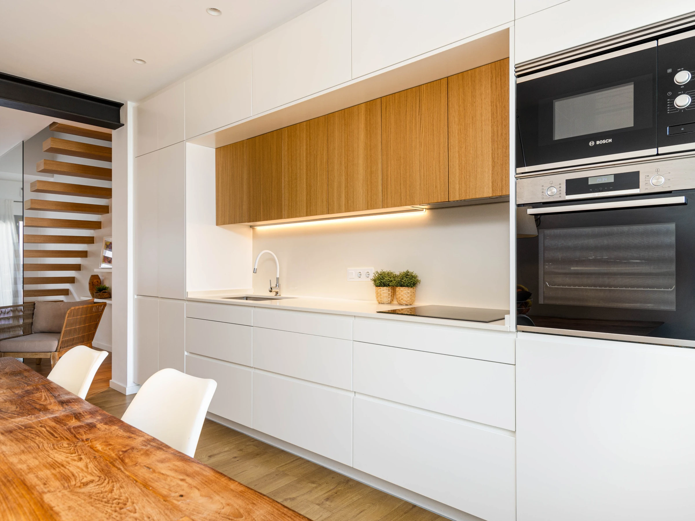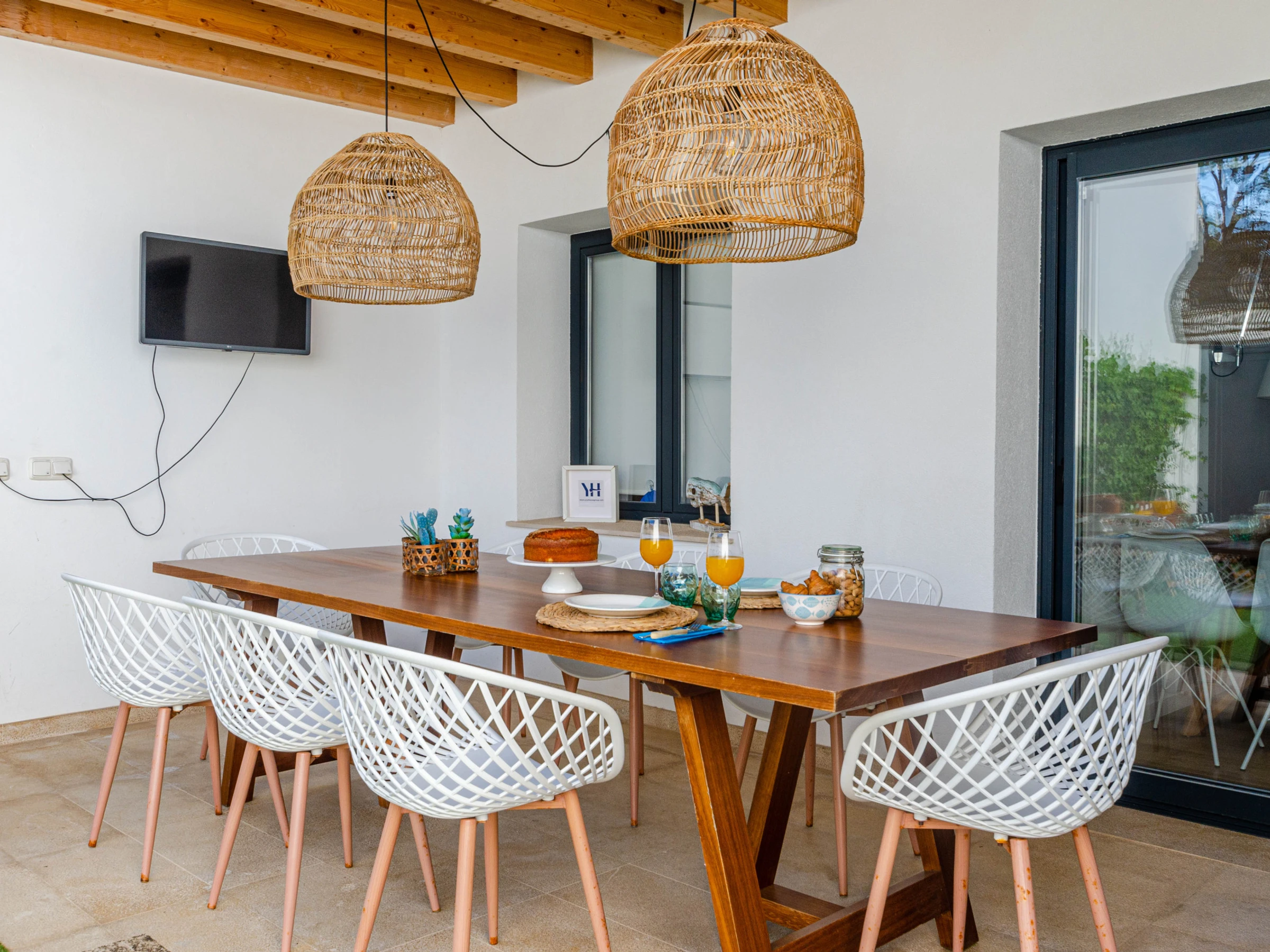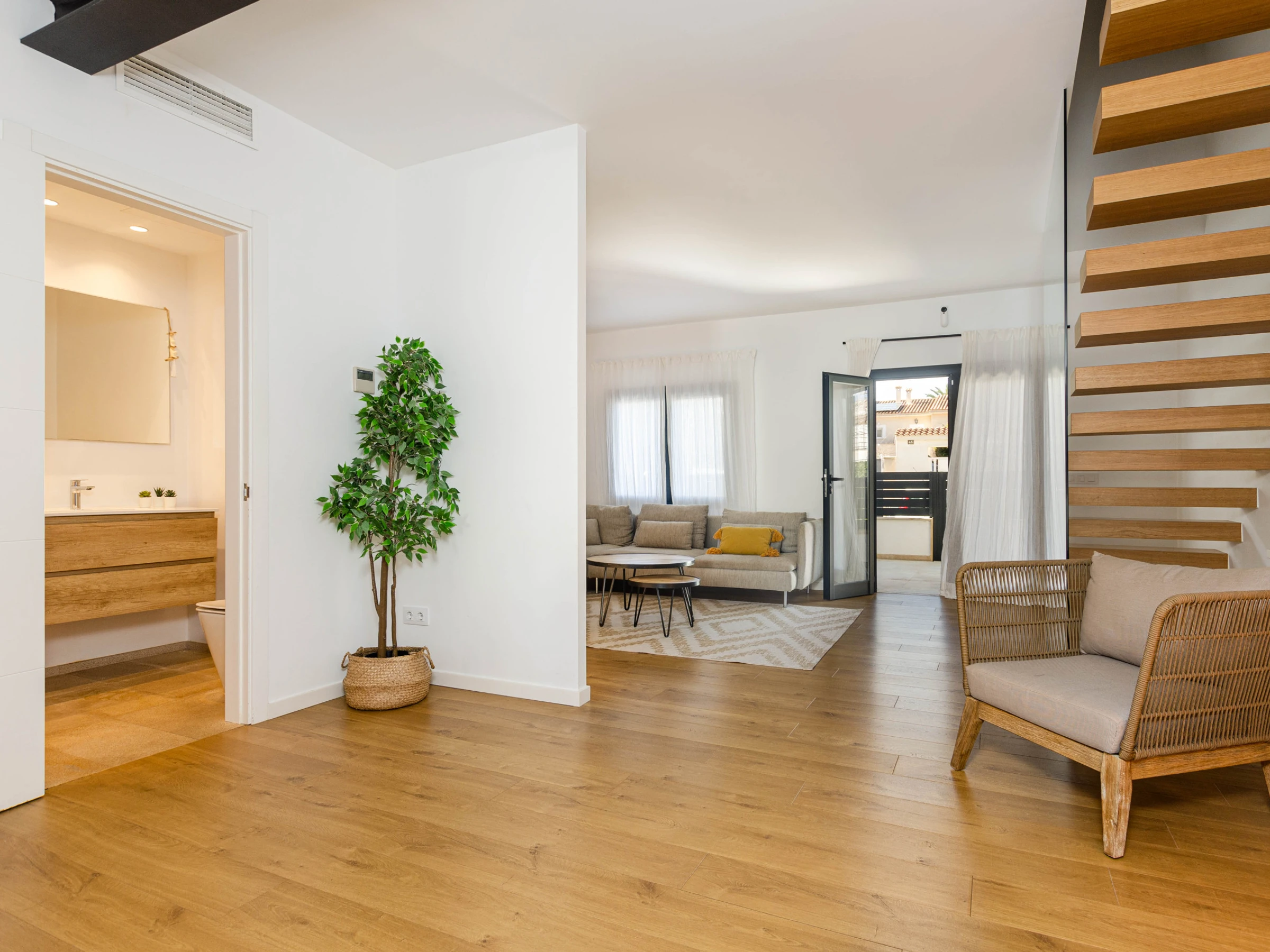 Inside, you will find a bright and spacious kitchen fully equipped with an oven, induction cooktop, microwave, cooking utensils, kettle, filter coffee maker, and Nespresso machine, ensuring your culinary needs are met during your stay. The dining area opens to the living room, providing a cozy atmosphere for family meals, while the comfortable sofa and flat-screen Smart TV invite you to relax and enjoy a family movie night. Additionally, high-speed WiFi is available for those who need to work or stay connected during their stay. The villa has centralized air conditioning on the ground floor and an air conditioning unit per bedroom, ensuring a cool and comfortable environment at all times. On the ground floor, you will find a bedroom with a double bed and another with two single beds, both with access to the terrace, as well as an en-suite bathroom with a shower in the master bedroom and another independent bathroom with a bathtub.