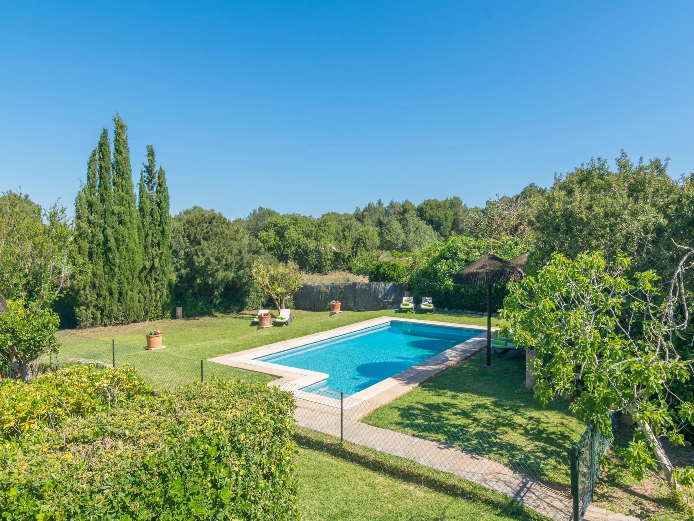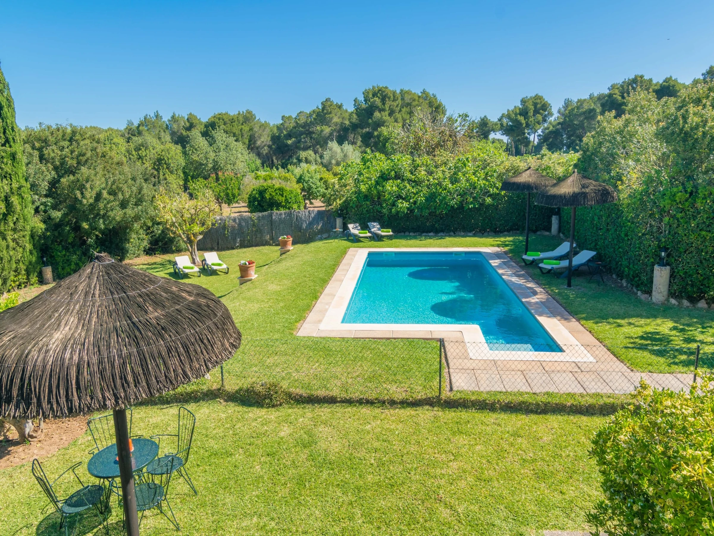 The diversity of greenery around the exterior area of this beautiful house, transforms all corners into the perfect places to relax and enjoy the atmosphere and the views over nature while swimming in the pool or sunbathing on any of the 6 sun loungers or right on the lawn. This is a chlorine pool that sizes 9 x 4.5 metres and has a water depth ranging from 1 to 2 metres. It is possible to set a children safety fence around it. There also is an exterior shower in case you want to cool down quickly before cooking a succulent barbecue that you can enjoy at the terrace. The property is fenced and there are neighbours around.