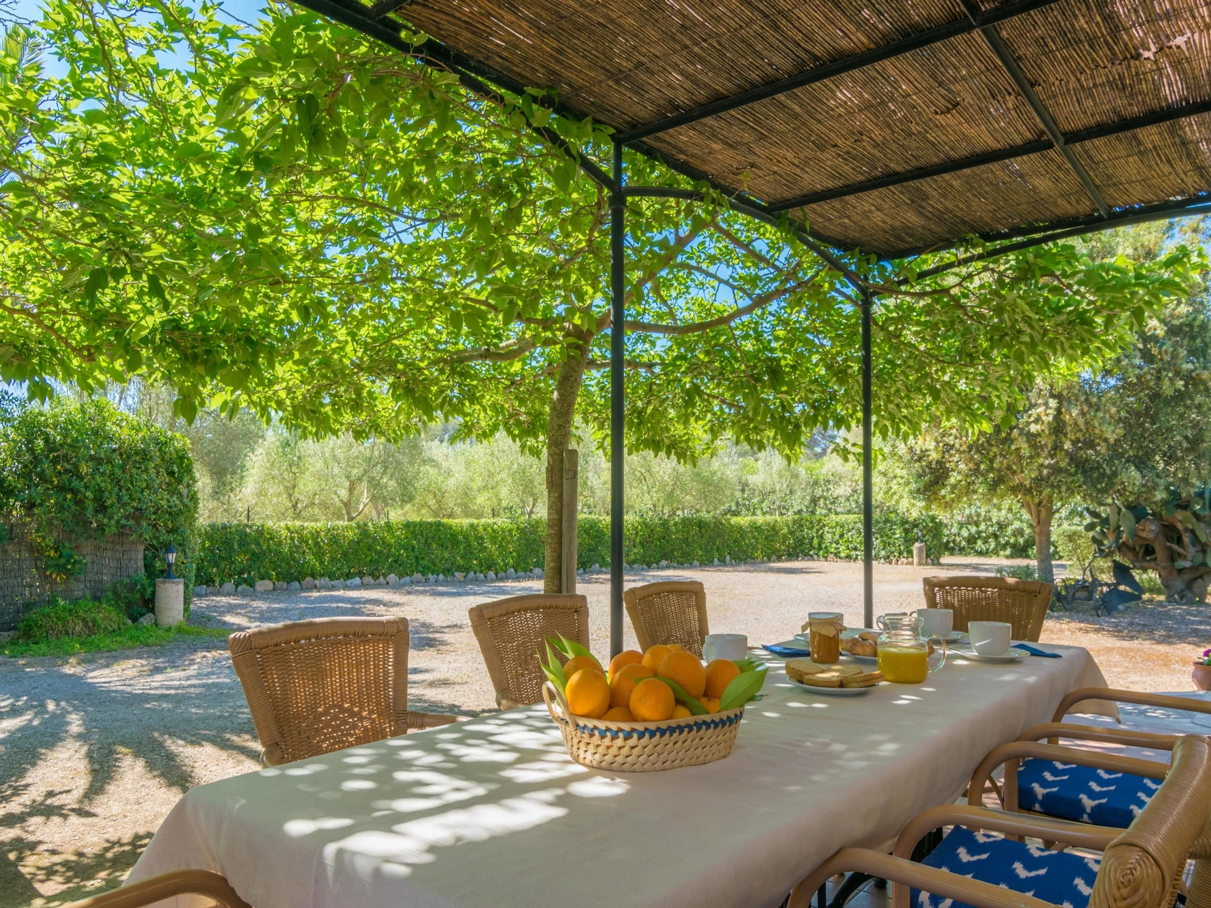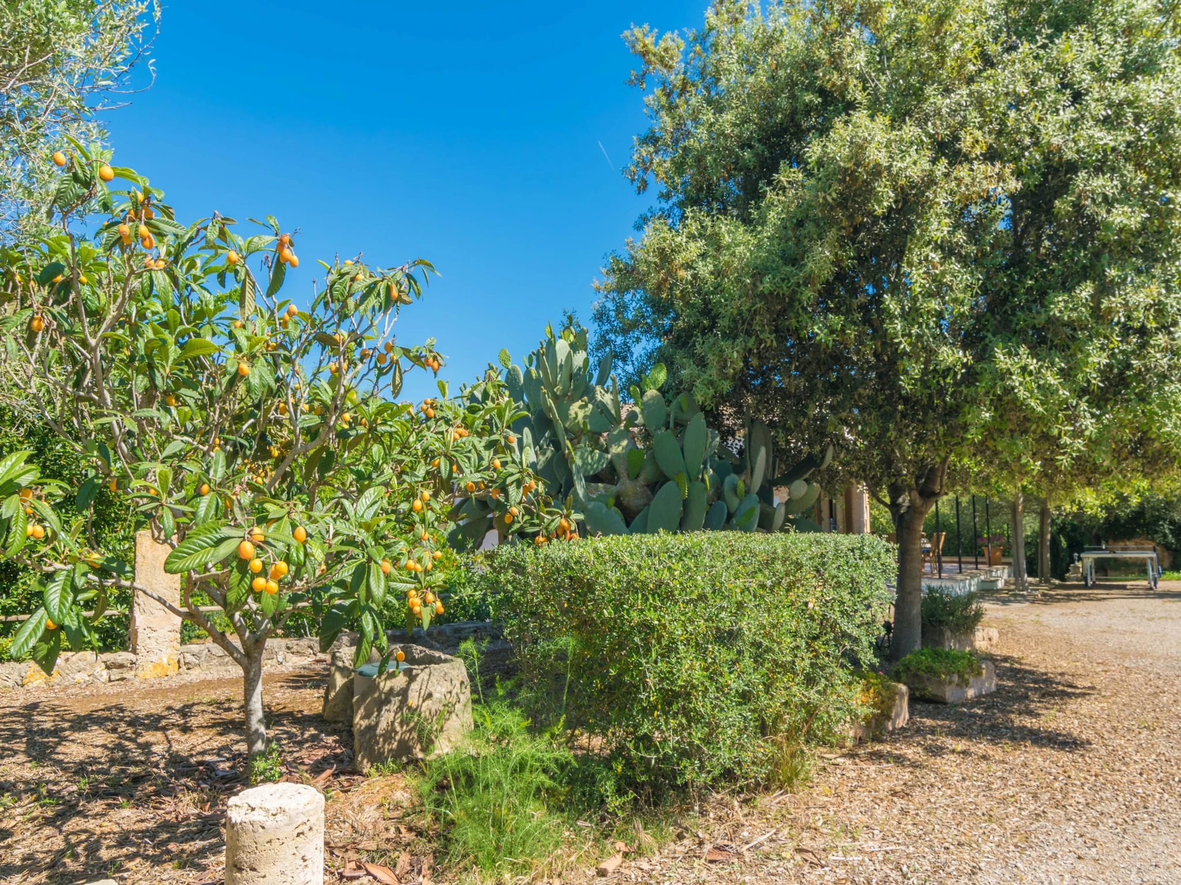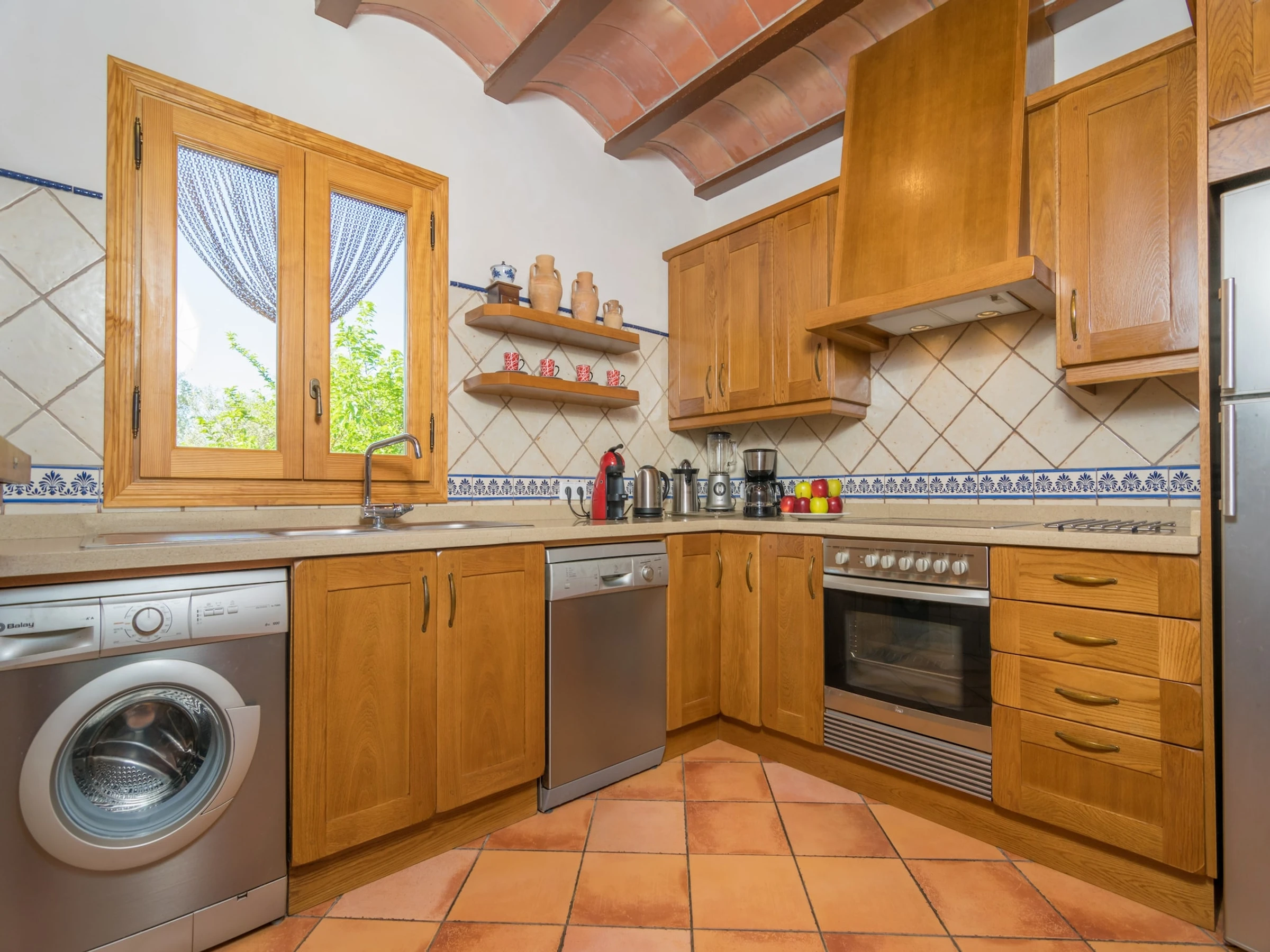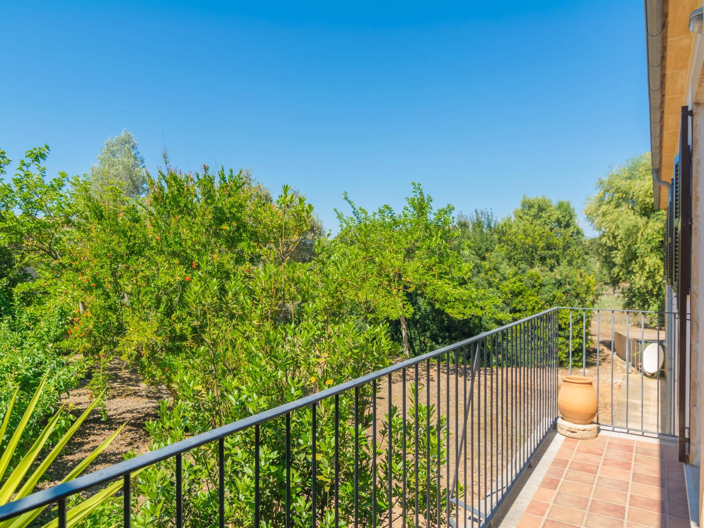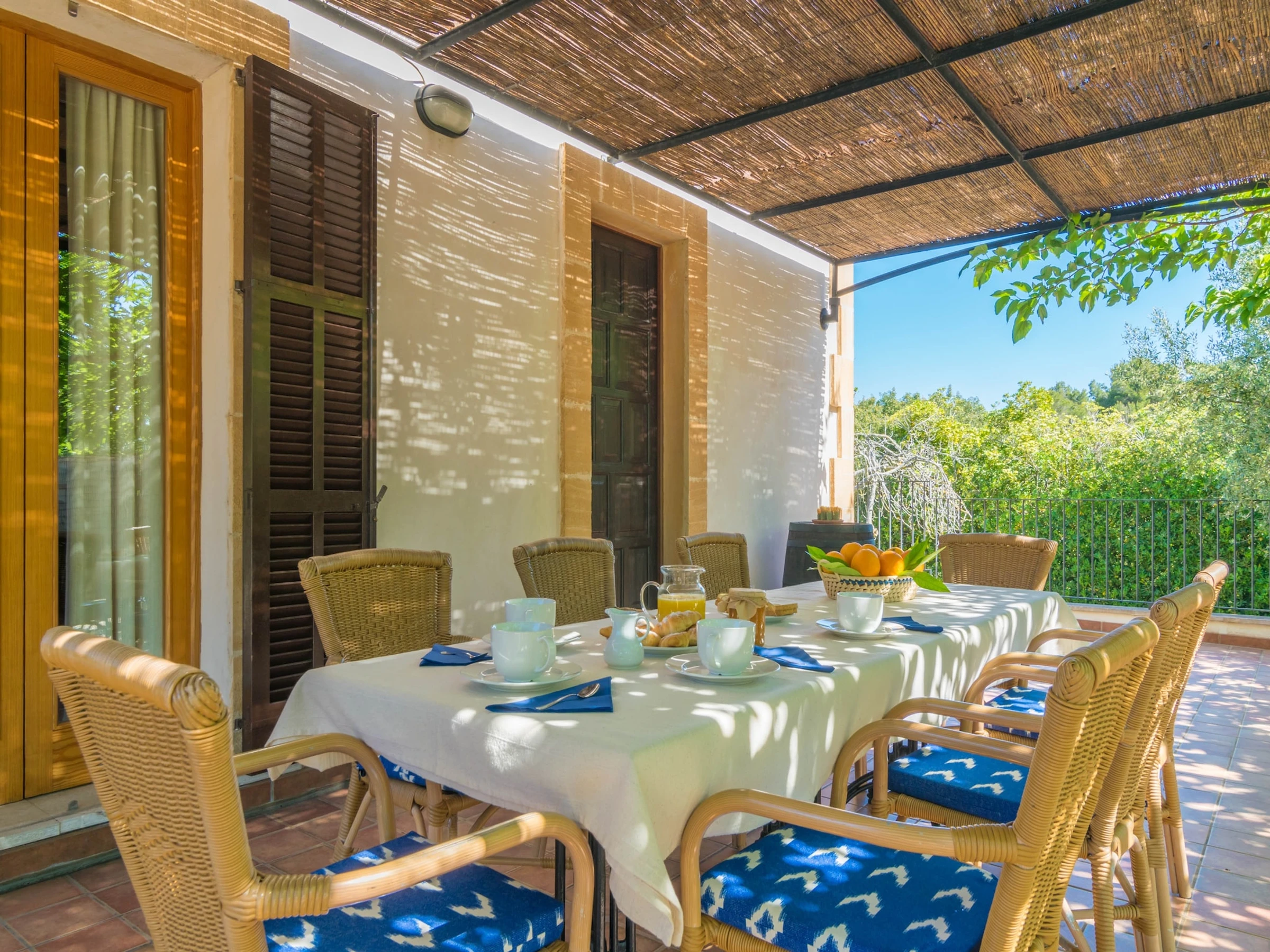 Inside, the house is quite simple and comfy, highlighting the beautiful Mallorcan style that makes it really special. When you enter you will find a living dining - room -with TV Sat and air-conditioning- that leads to the kitchen. It is equipped with a ceramic hob, oven, dishwasher, etc, and the washing machine, iron and ironing board also are right here. The house features three bedrooms to rest, all of the with air-conditioning and a closet. Two of them have twin beds and exit to a balcony with pool views. The last bedroom has a double bed and space for a baby cot. Finally, the accommodation offers two bathrooms, one with a shower and another with a tub.