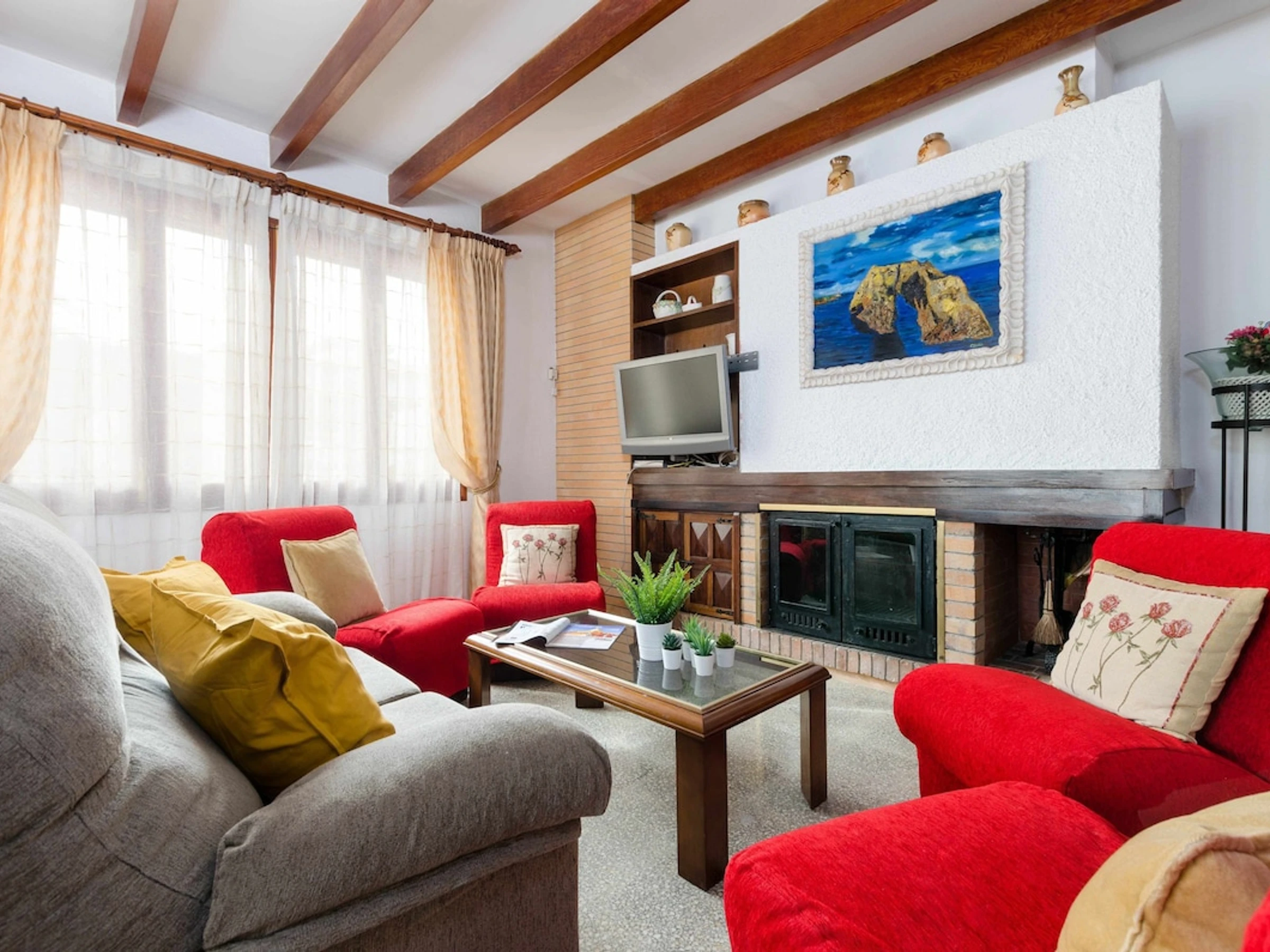 The house is surrounded by a large terrace that goes around the entire corner and also has a charming private terrace for sunbathing on loungers or enjoying an exquisite dinner outdoors. In the air-conditioned living-dining room, there is a sofa and four armchairs, satellite TV and WiFi connection. The fireplace is decorative and cannot be used.