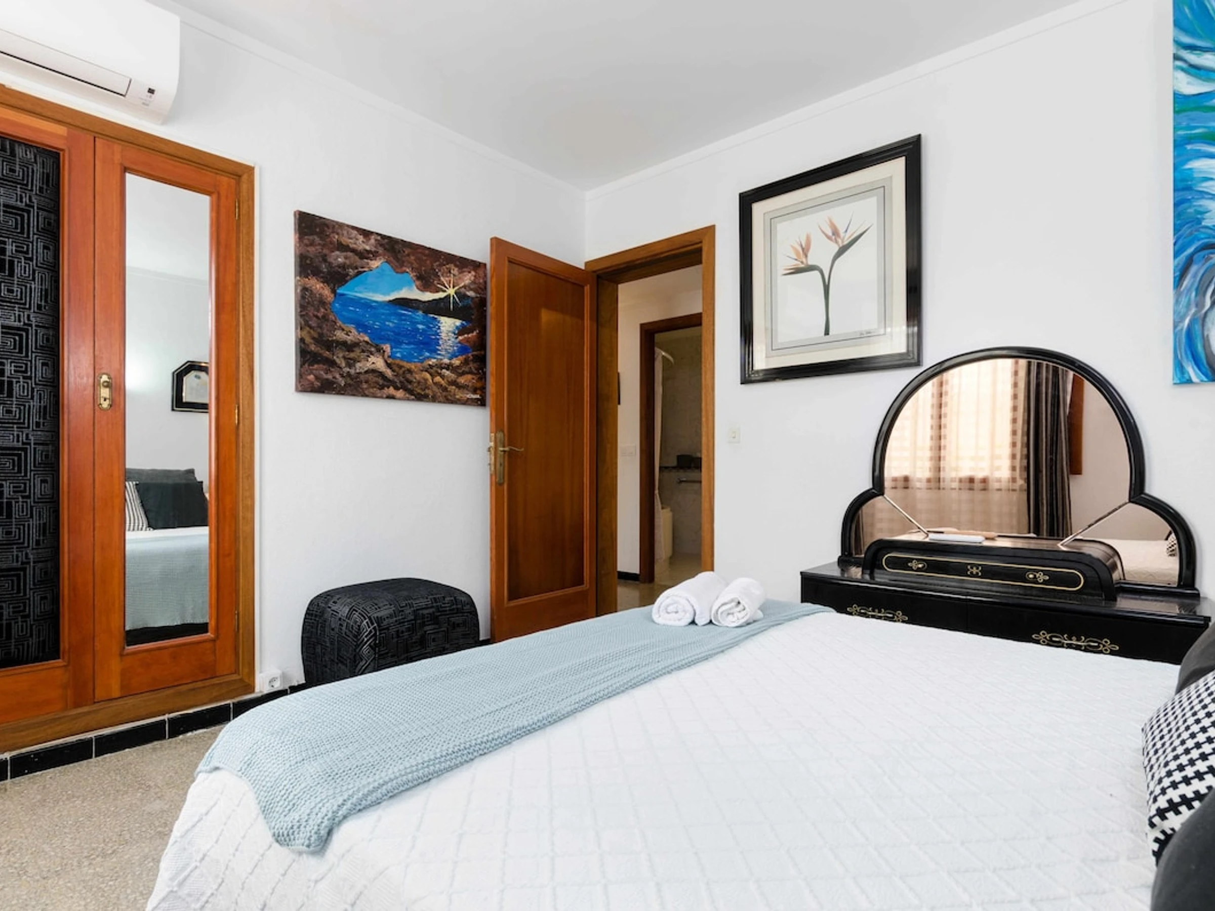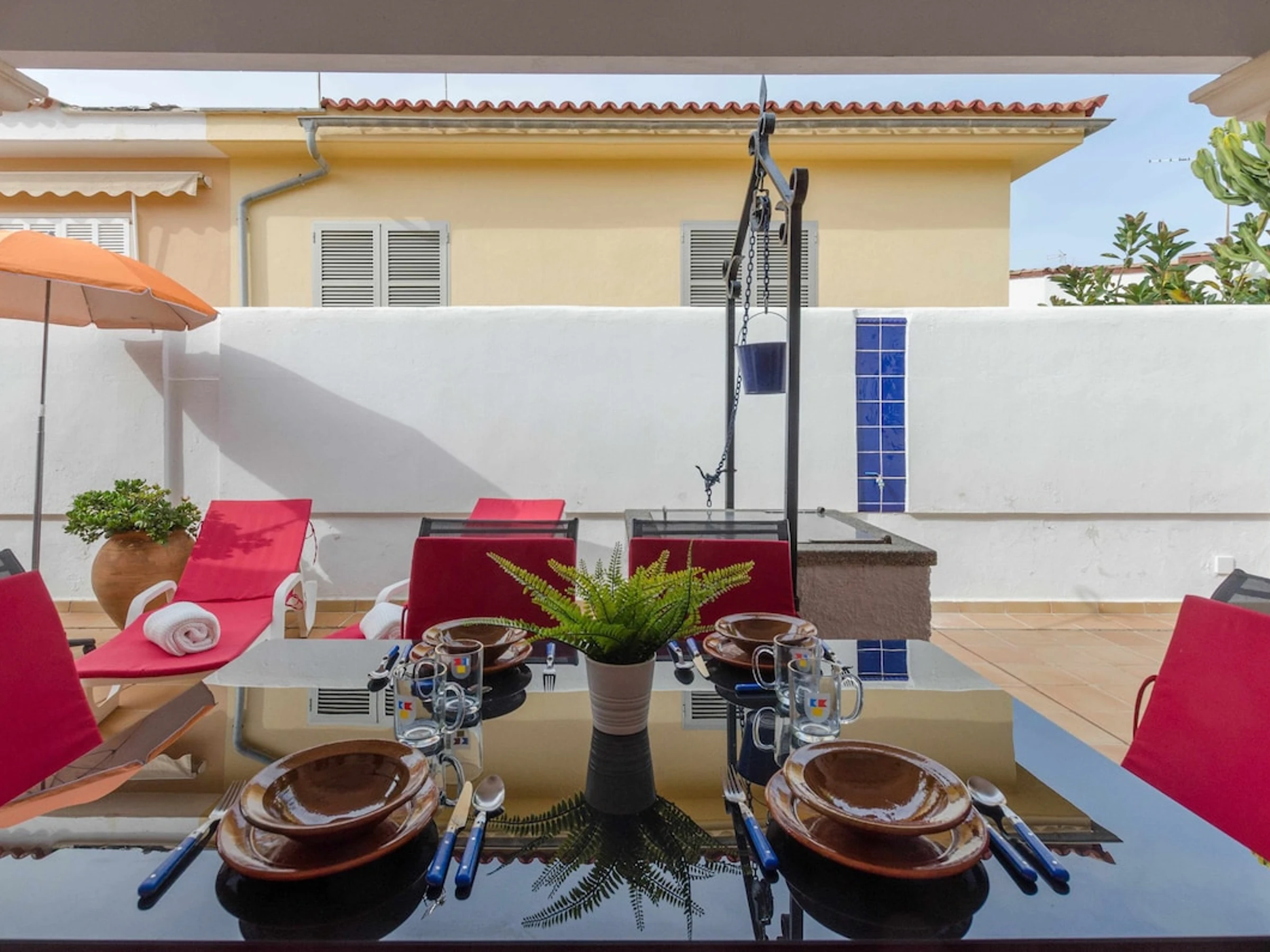 To rest, there are two bedrooms with a double bed of 150 cm, air conditioning, wardrobes, and drawers. The other bedroom has 1 single bed of 90 cm and a fan. The house has two bathrooms, one with a shower and the other with a bathtub, and also has an exterior toilet. Washing machine, iron/ironing board, cot, and high chair complete the equipment.