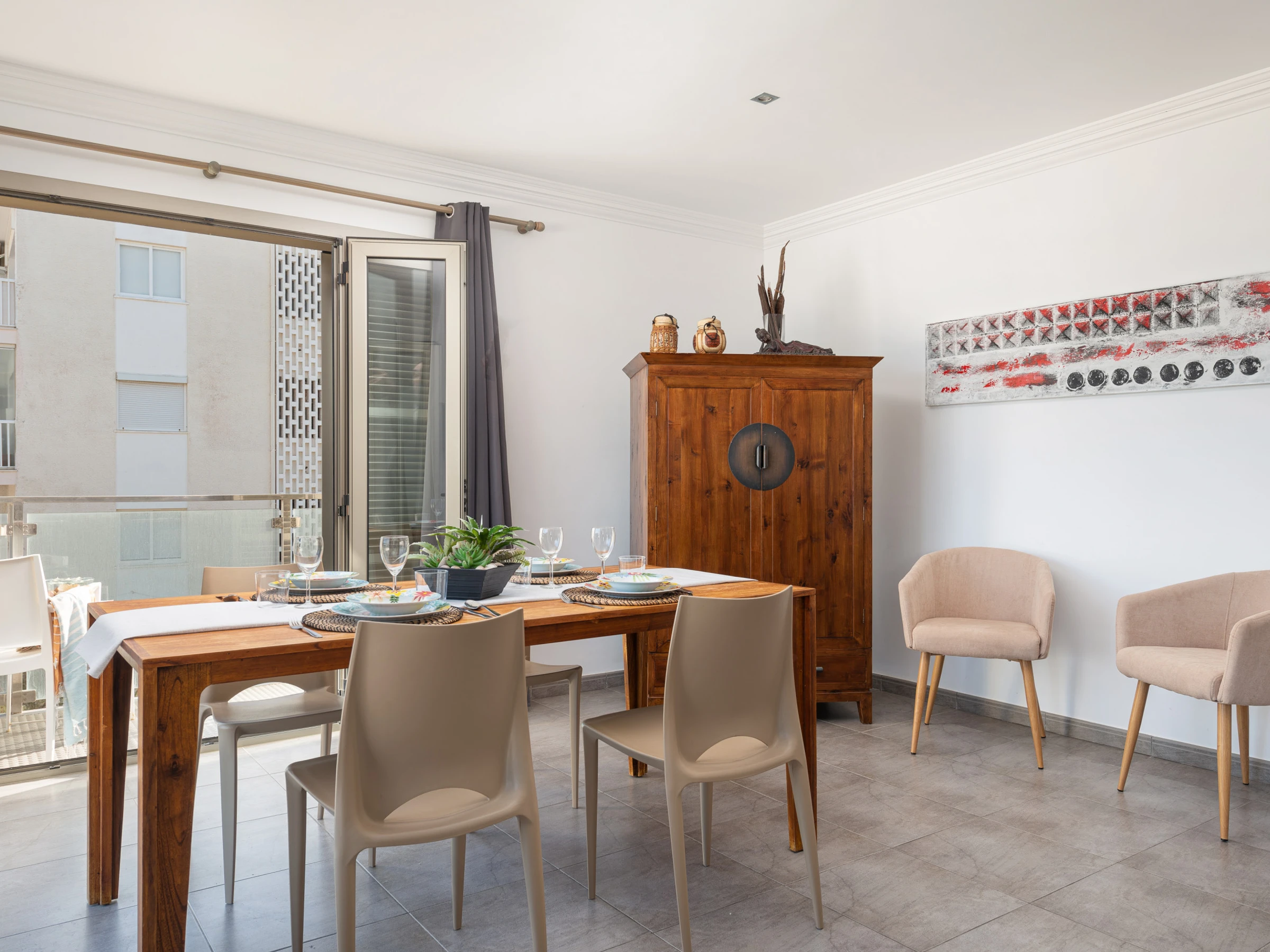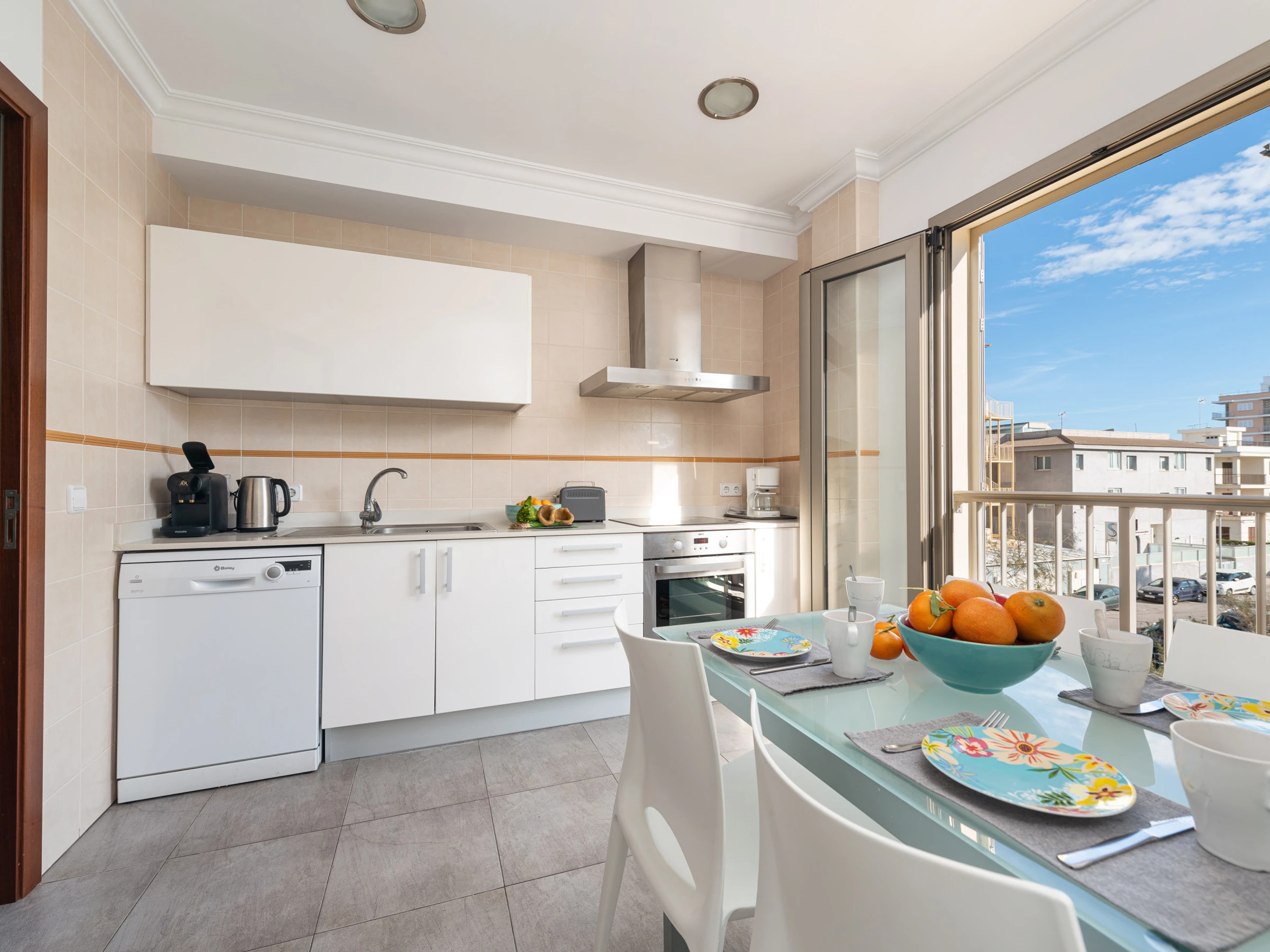 The apartment is located in Can Picafort in the bay of Alcudia in a lively area directly next to the beach where you can also stroll along the promenade enjoying the variety of cafes, shops and restaurants.