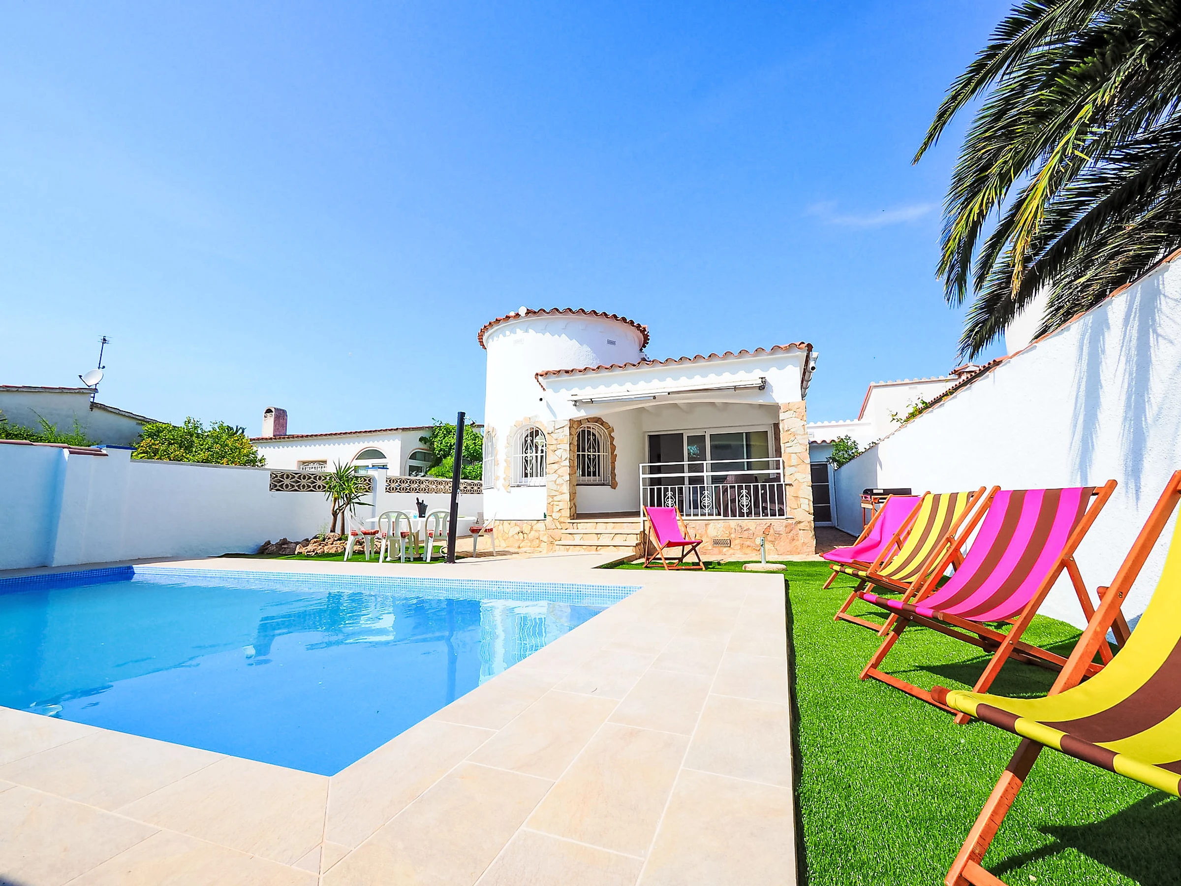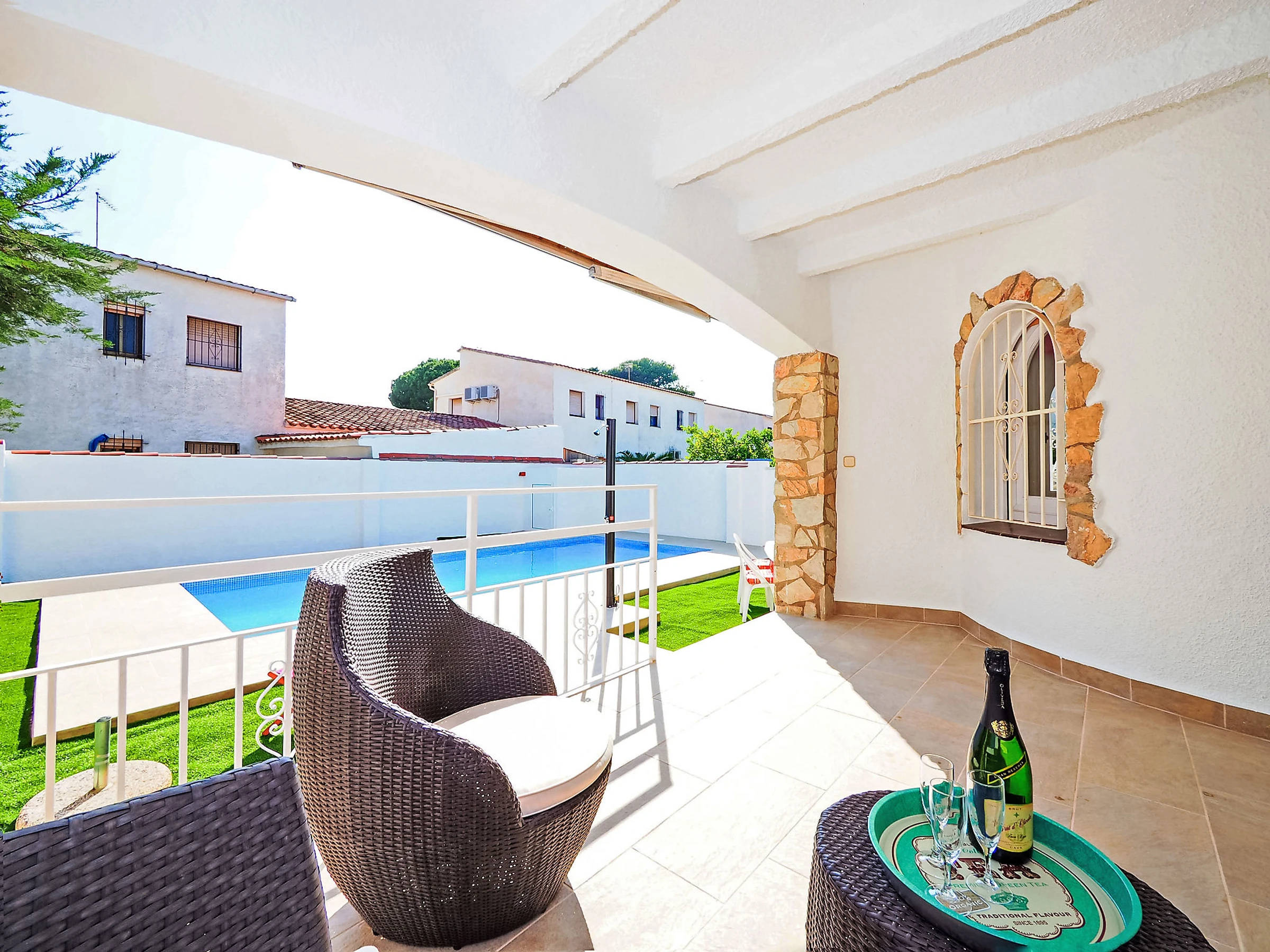 Very modern, beautiful single-family house "Alberes", renovated in 2015. In the district of Alberes 1.2 km from the centre of Empuriabrava, in a quiet, sunny position residential area (villas), traffic calmed area, 1.2 km from the sea, 350 m from the canal, 450 m from the river, south-west facing position. Private: swimming pool angular (7 x 3 m, seasonal availability: [hidden] - [hidden] Outdoor shower, patio, pergola, garden furniture, barbecue. In the house: air conditioning. Parking, single garage. Shop 300 m, grocery 300 m, supermarket 400 m, restaurant 260 m, bar 300 m, bakery 230 m, bus stop 2.8 km, sandy beach "Empuriabrava" 1.2 km. Sports harbour 1.8 km, golf course (15 hole) 8 km, surf school 2 km, sailing school 2 km, tennis 2 km, minigolf 1.5 km, riding stable 3 km, walking paths from the house 400 m, cycle lane 400 m. Nearby attractions: Centro paracaidismo y túnel del viento 2 km, Parque Acuático Roses 10 km, Museo Dalí Figueres 15 km, Castillo de Perelada 12 km, Ruïnas de St. Martí de Empúries 21 km, Monasterio de Sant Pere de Rodes 23 km. The keys‘ handover takes place by the agency in Empuriabrava.