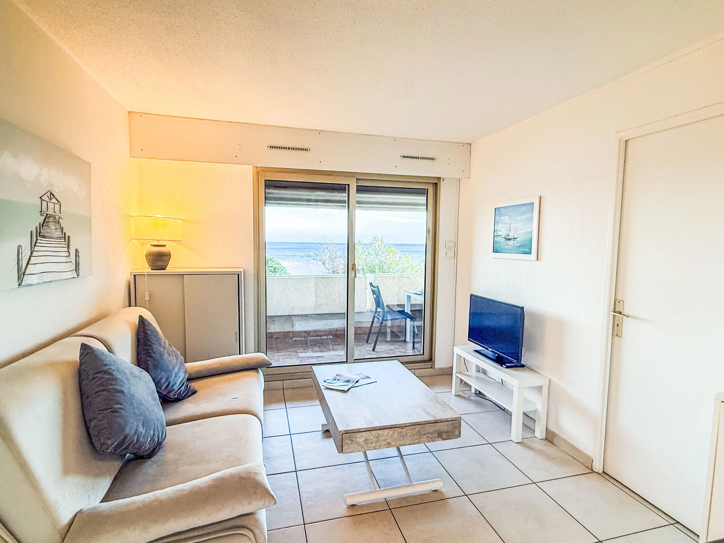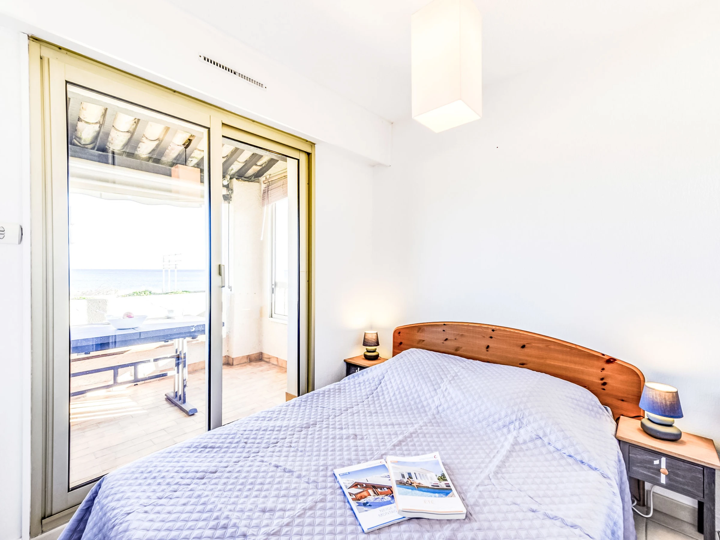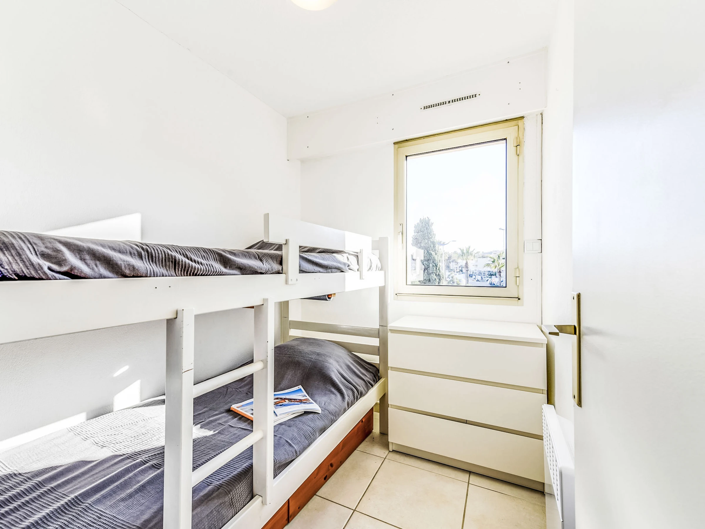 3-room apartment 35 m2 on 1st floor, south facing position. Practical and comfortable furnishings: living/dining room with panoramic window with 1 double sofabed (1 x 140 cm, length 190 cm), TV (flat screen), air conditioning and electric shutters. Exit to the terrace. 1 room with panoramic window with 1 french bed (1 x 140 cm, length 190 cm), electric heater. Exit to the terrace. 1 room with 1 x 2 bunk beds (80 cm, length 190 cm), electric heater. Open kitchen (oven, dishwasher, 3 ceramic glass hob hotplates, toaster, kettle, microwave, freezer, electric coffee machine). Shower, sep. WC. Electric heating, boiler (100 litres). Terrace 11 m2, south facing position. Terrace furniture, deck chairs (2). Beautiful view of the sea. Facilities: washing machine. Internet (WiFi, extra). Parking space n 15 (fenced). Please note: TV only FR. Smoke alarm.