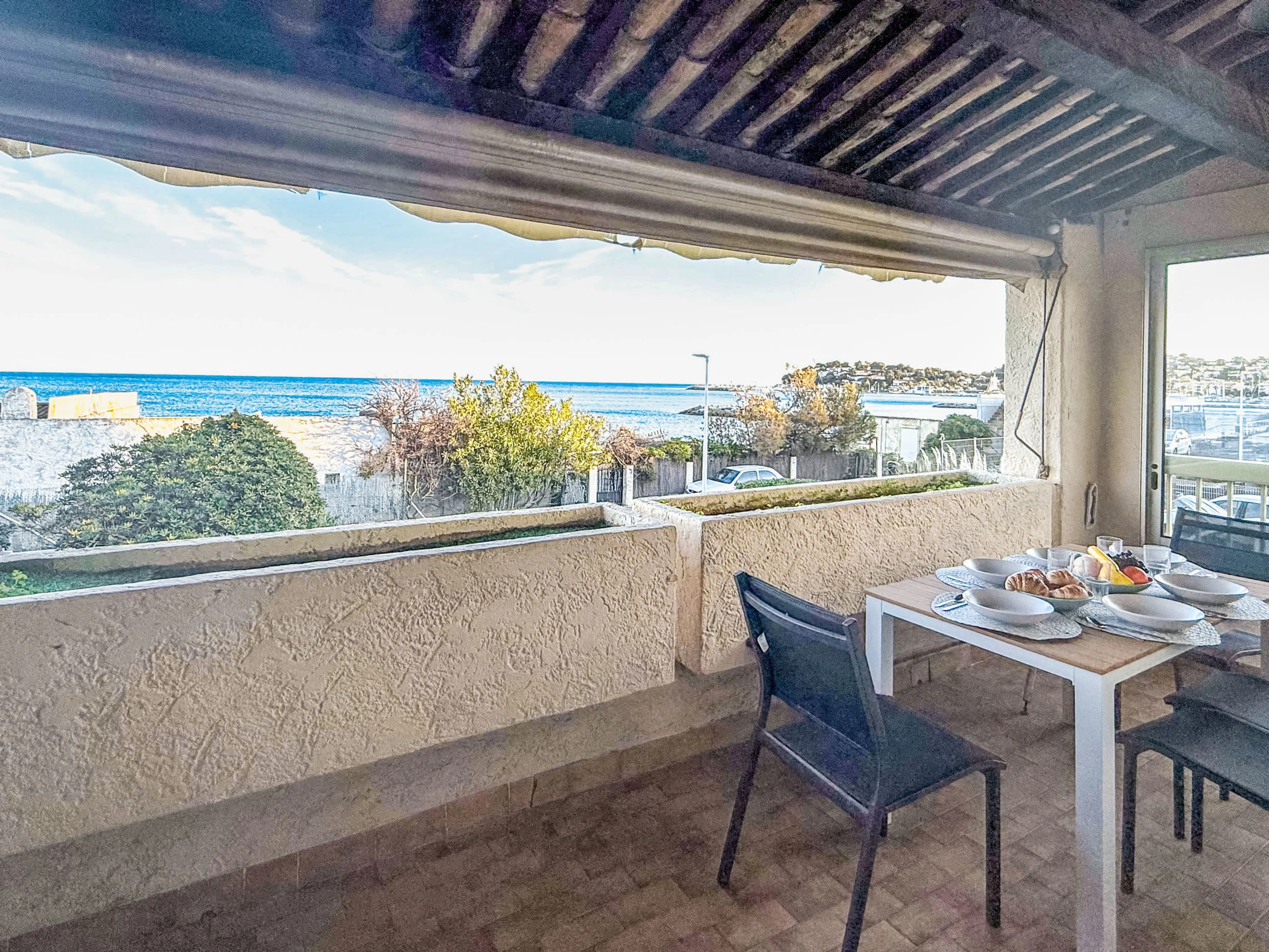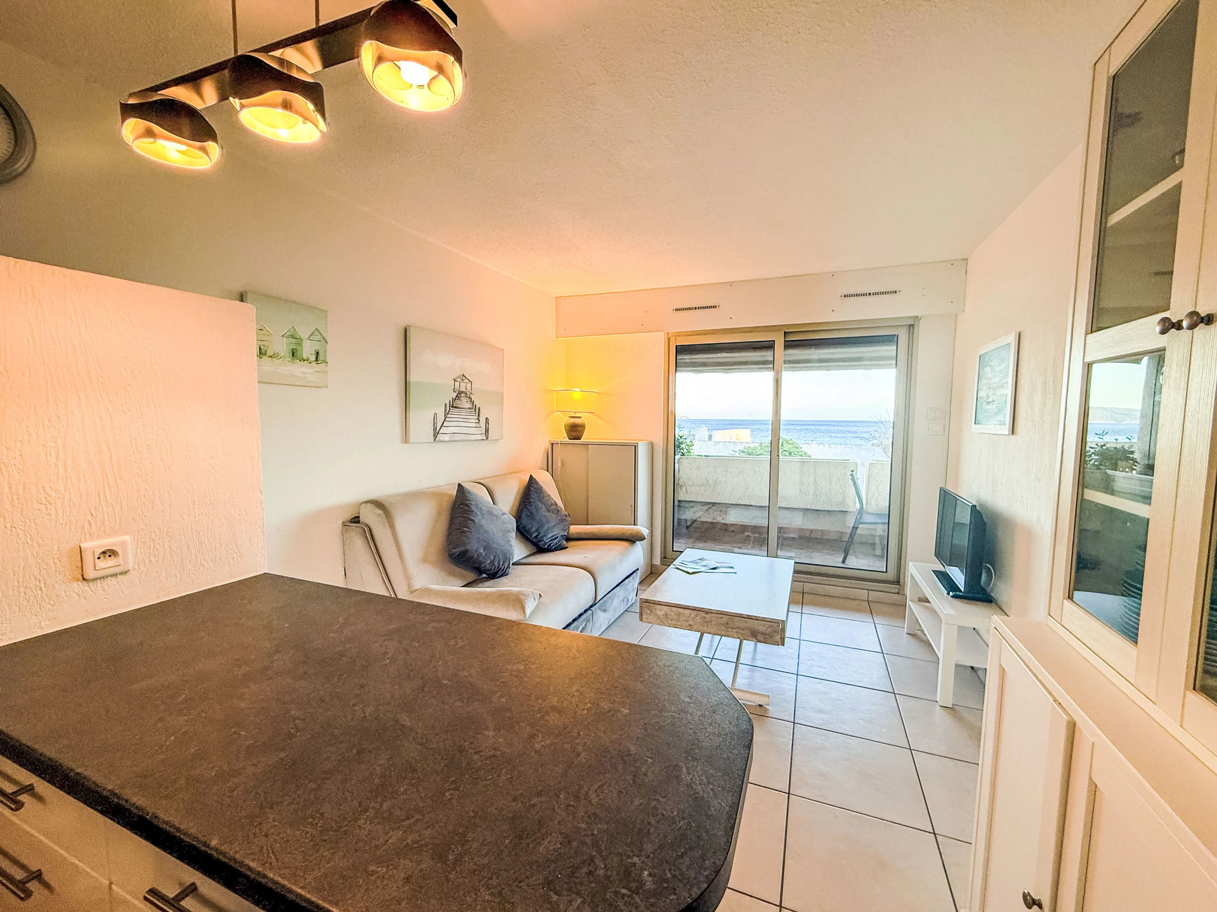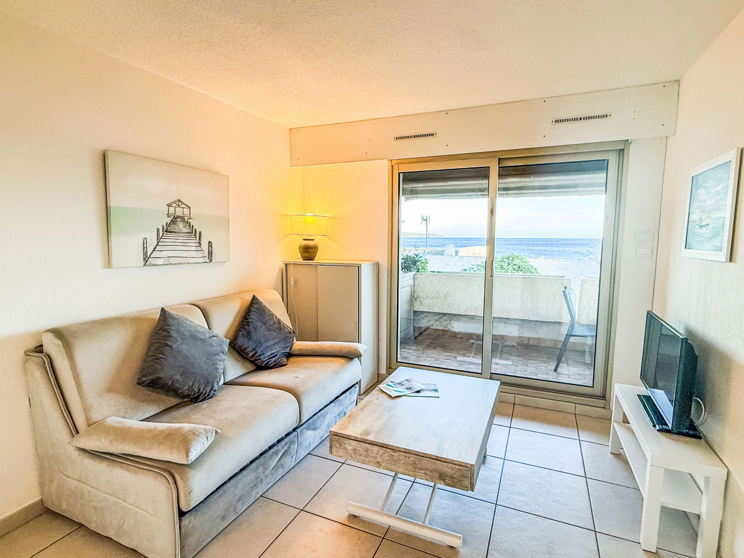 3-room apartment 35 m2 on 1st floor, south facing position. Practical and comfortable furnishings: living/dining room with panoramic window with 1 double sofabed (1 x 140 cm, length 190 cm), TV (flat screen), air conditioning and electric shutters. Exit to the terrace. 1 room with panoramic window with 1 french bed (1 x 140 cm, length 190 cm), electric heater. Exit to the terrace. 1 room with 1 x 2 bunk beds (80 cm, length 190 cm), electric heater. Open kitchen (oven, dishwasher, 3 ceramic glass hob hotplates, toaster, kettle, microwave, freezer, electric coffee machine). Shower, sep. WC. Electric heating, boiler (100 litres). Terrace 11 m2, south facing position. Terrace furniture, deck chairs (2). Beautiful view of the sea. Facilities: washing machine. Internet (WiFi, extra). Parking space n 15 (fenced). Please note: TV only FR. Smoke alarm.