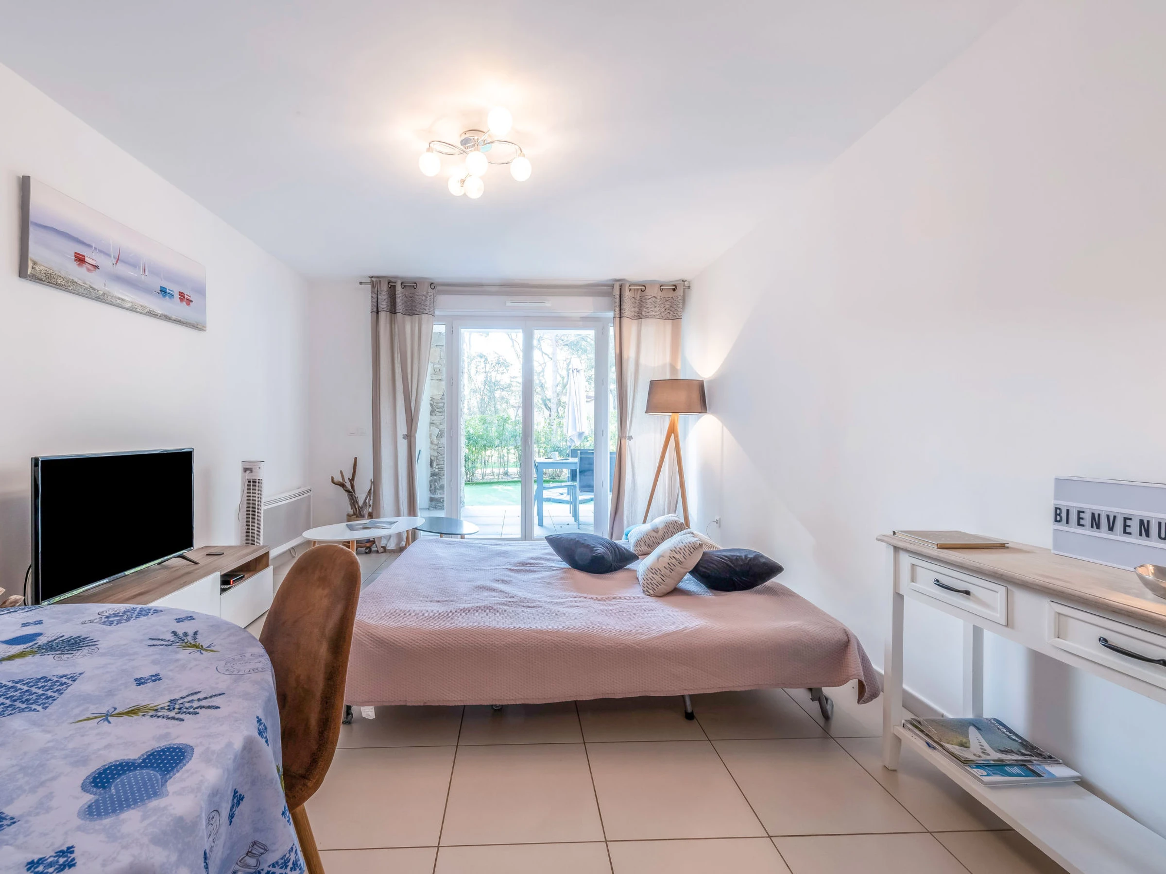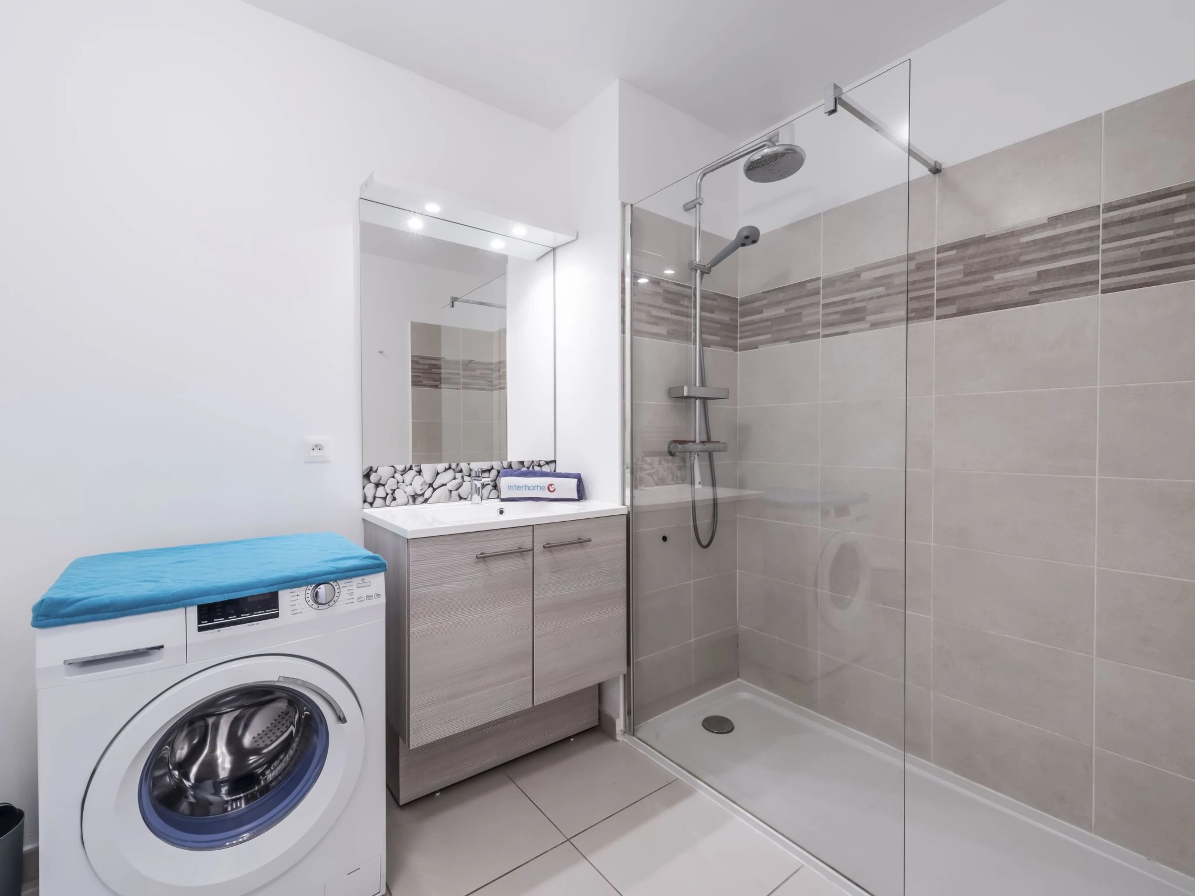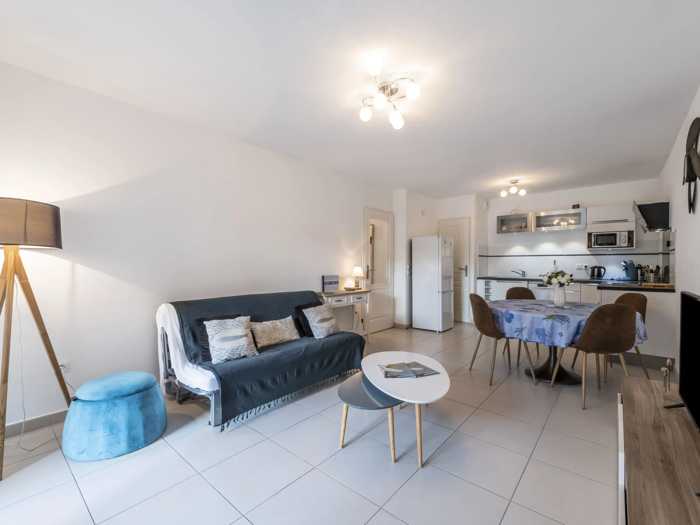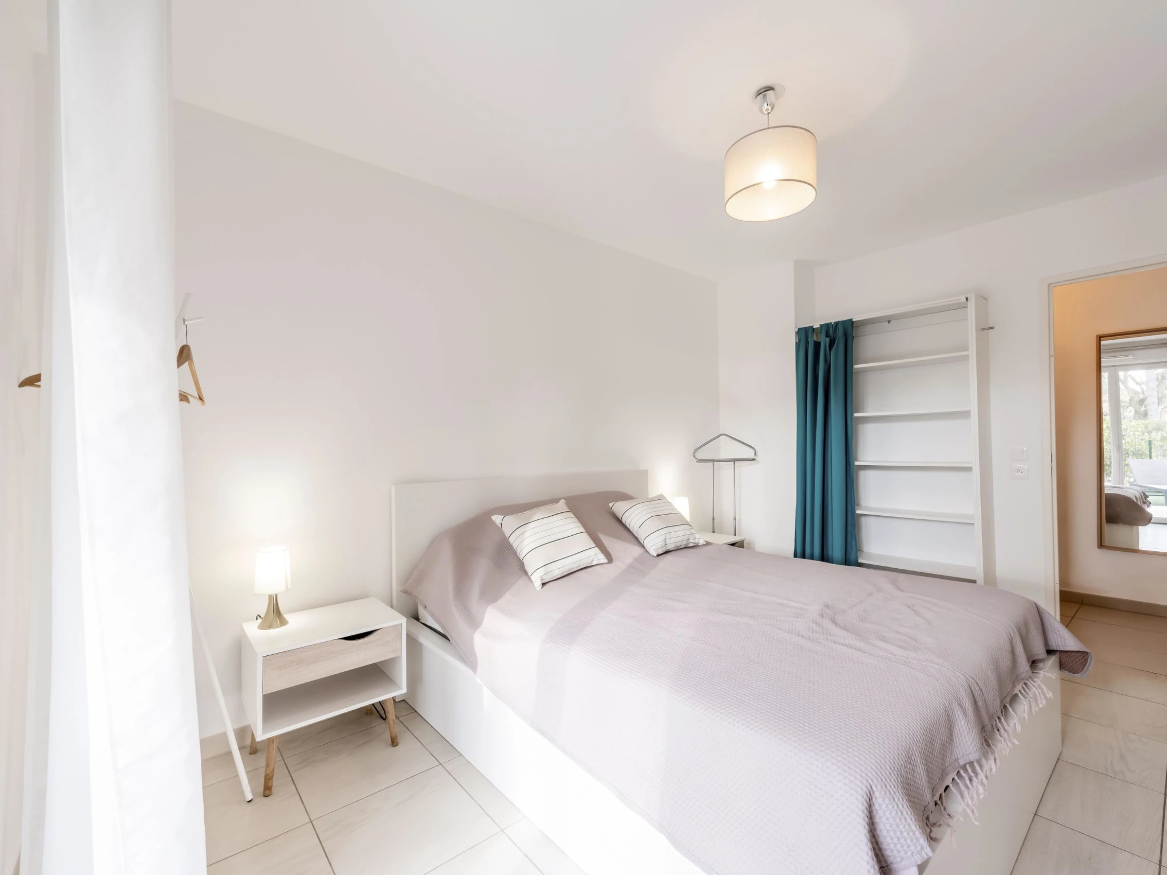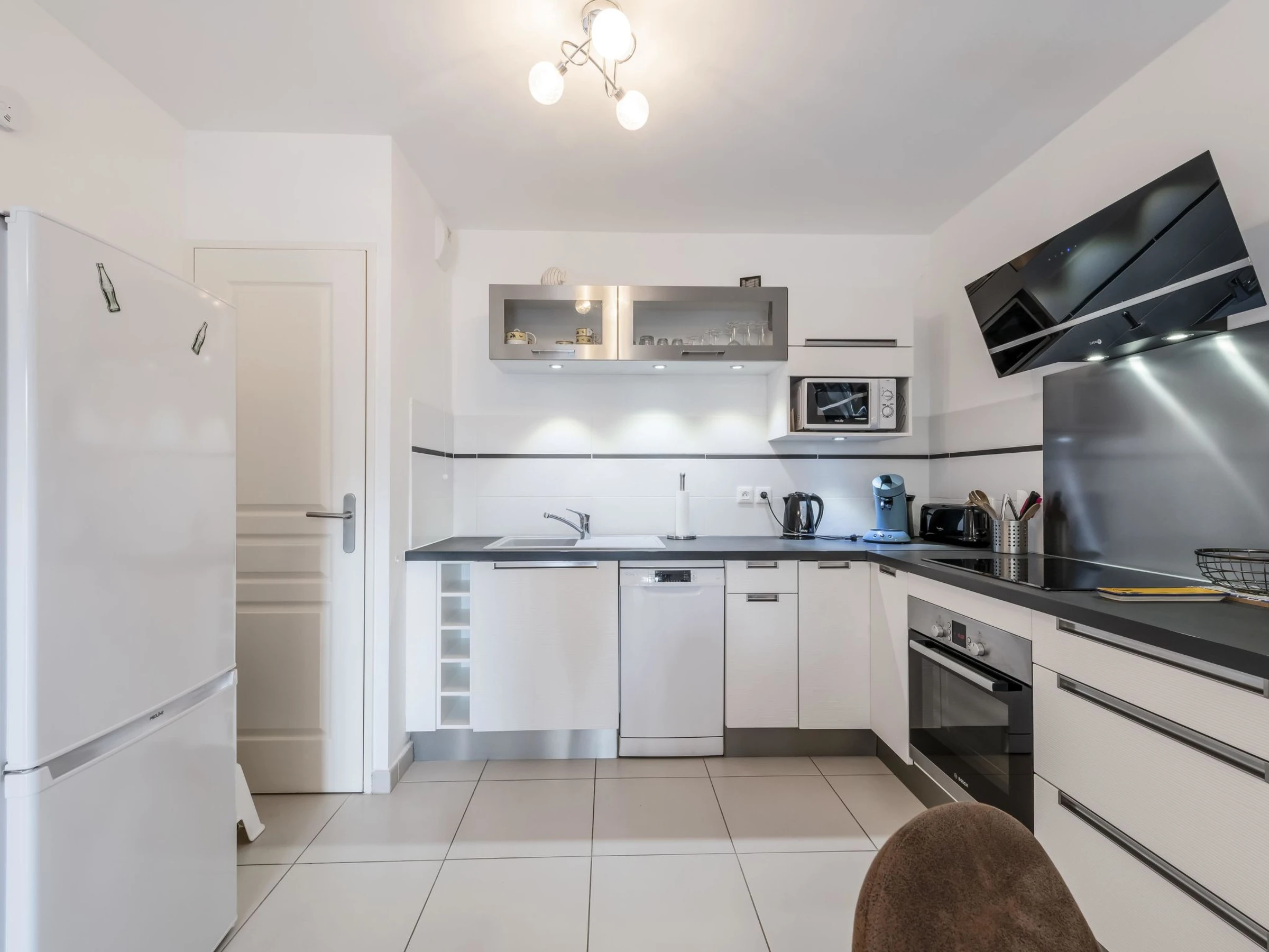 2-room apartment 47 m2, on the ground floor, south facing position. Comfortable and beautiful furnishings: living/dining room with 1 double sofabed (160 cm, length 200 cm), TV (flat screen), electric shutters. Exit to the terrace. 1 room with 1 double bed (160 cm, length 200 cm), electric shutters. Exit to the terrace. Open kitchen (oven, dishwasher, 3 ceramic glass hob hotplates, toaster, kettle, microwave, freezer, electric coffee machine, Capsules for coffee machine (Senseo) extra) with dining table. Shower/WC. Electric heating, air-conditioning, boiler (200 litres). Large terrace 15 m2, south facing position, patio 25 m2. Terrace furniture, electric barbecue, deck chairs (2). Beautiful view of the garden. Facilities: washing machine, iron, hair dryer. Internet (WiFi, free). Garage space n 265, height 190 cm, width 235 cm. Please note: TV only FR. Smoke alarm.