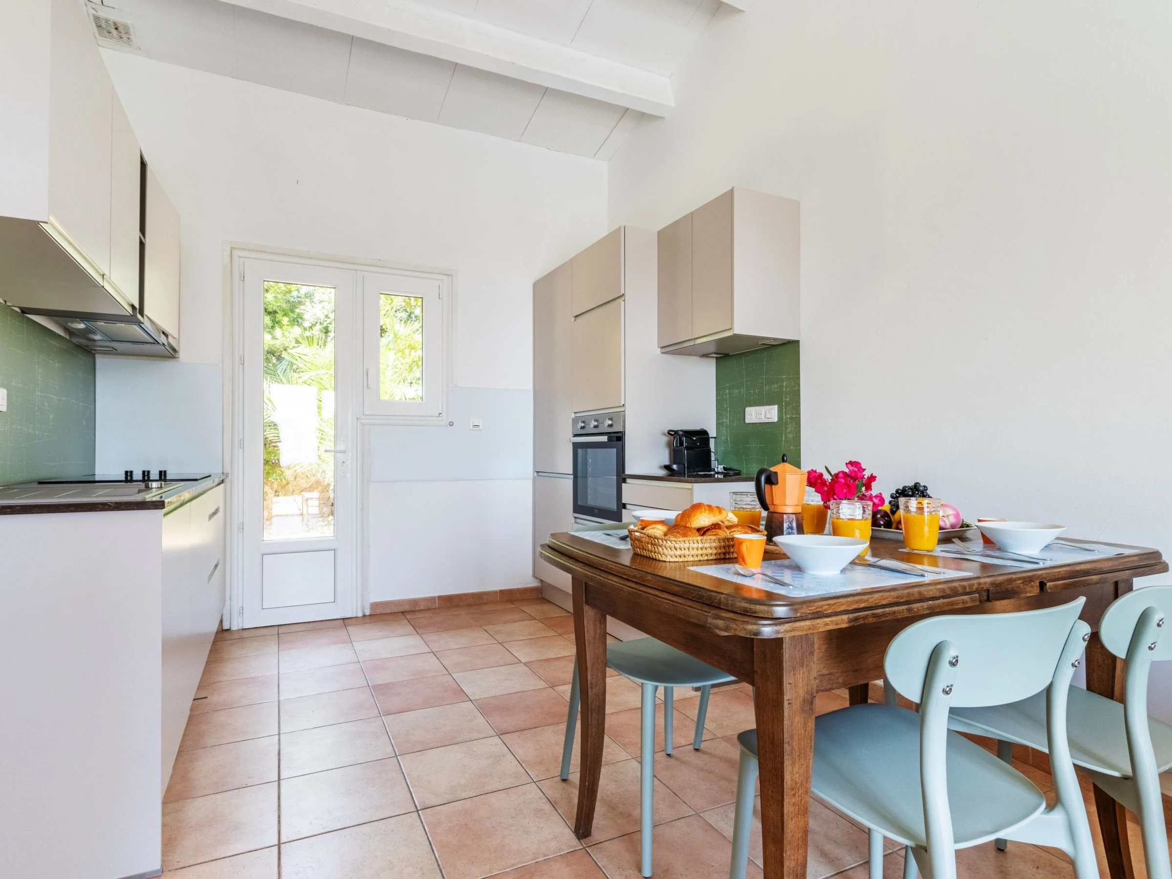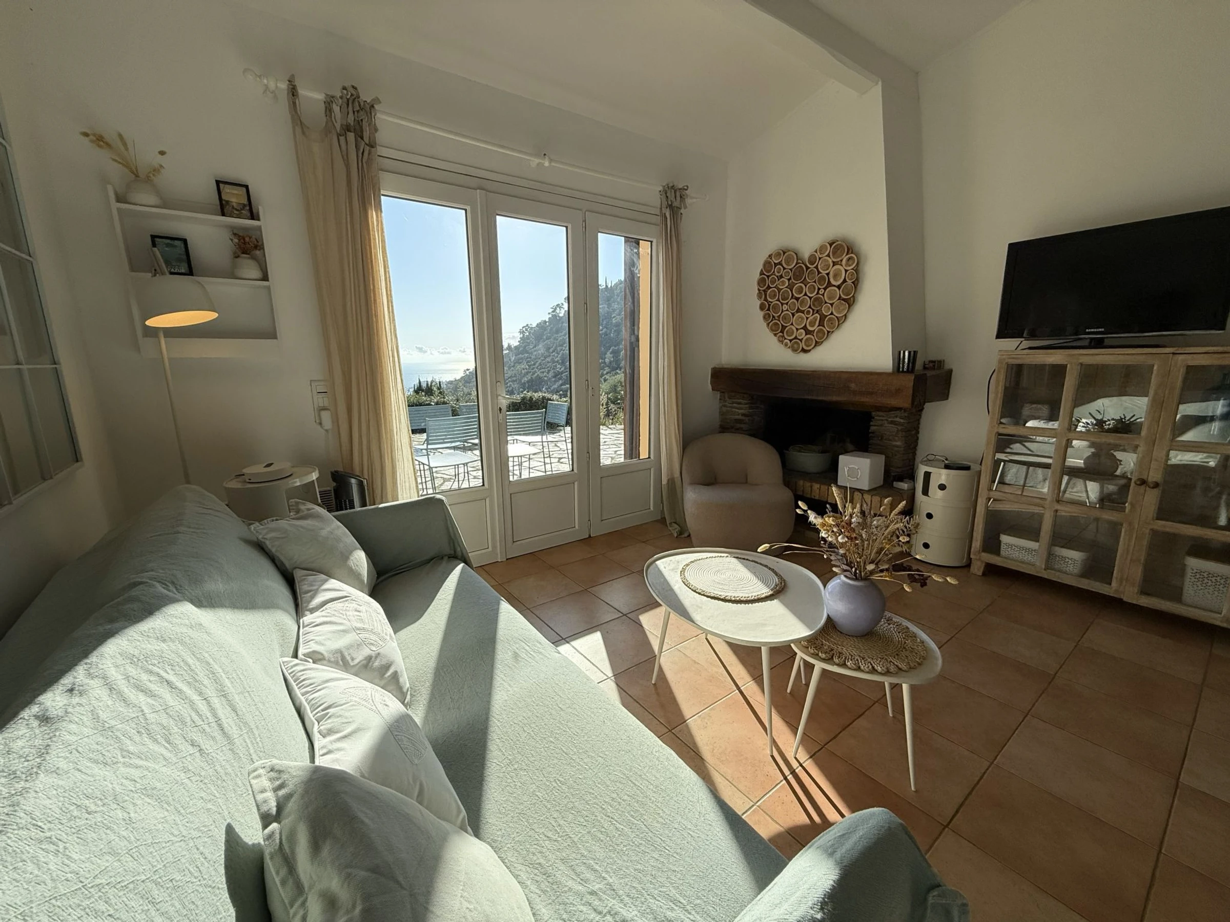 3-room terraced house 57 m2, south-east facing position. Practical and beautiful furnishings: living/dining room with open-hearth fireplace and TV. Exit to the terrace. 1 room with 1 double bed (2 x 90 cm, length 200 cm). Exit to the garden. 1 room with 1 bed (90 cm, length 190 cm), 1 double bed (2 x 90 cm, length 190 cm). Exit to the terrace. Open kitchen (4 hot plates, oven, dishwasher, toaster, kettle, microwave, electric coffee machine, Capsules for coffee machine (Nespresso) extra). Shower/WC, sep. WC. Electric heating. Large terrace 60 m2, patio 13 m2. Terrace furniture, deck chairs (2). Panoramic view of the sea and the countryside. Facilities: washing machine, iron, hair dryer. Internet (WiFi, free). Parking (2 cars) at the house. Please note: non-smoking house. Maximum 1 pet/ dog allowed. Smoke alarm. The house is terraced on one side only.