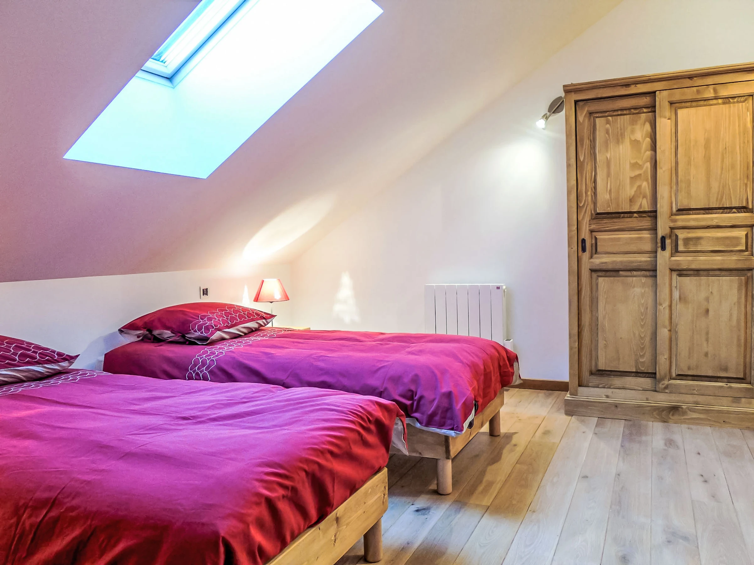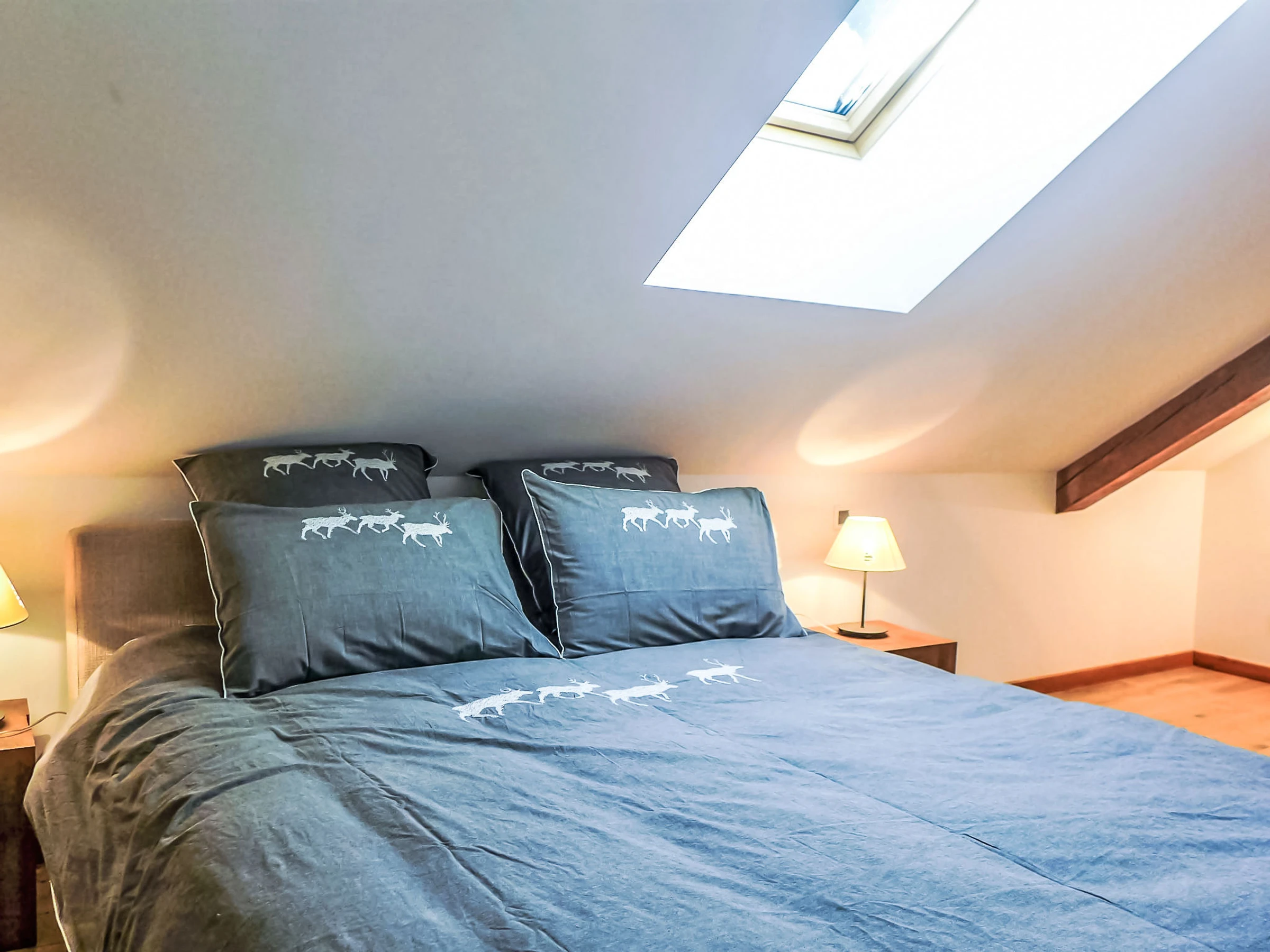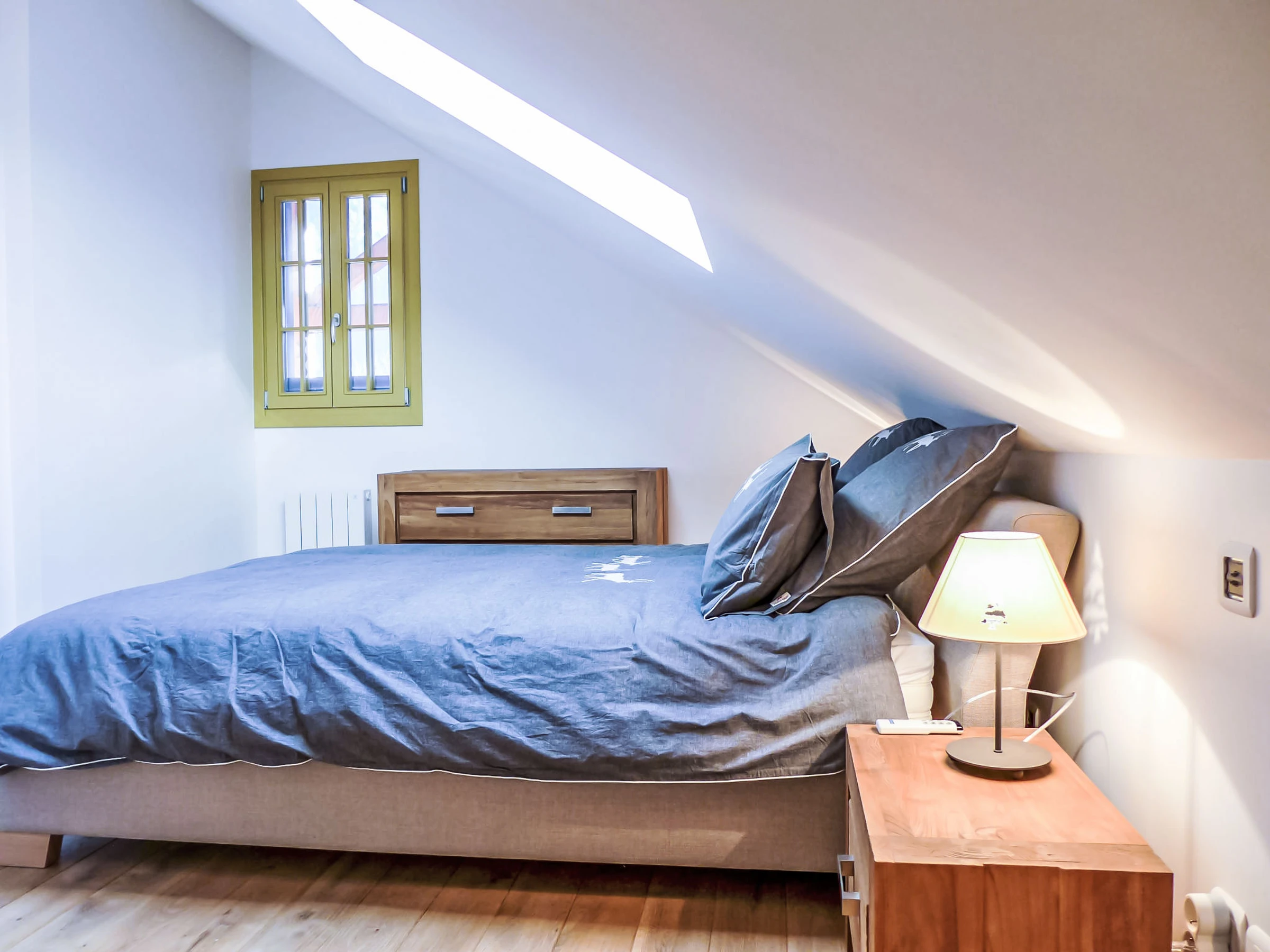 3-room penthouse 55 m2 on 2nd floor. With sloping ceilings, modern furnishings: living room with TV. 1 room with rooflight with 1 french bed (160 cm, length 200 cm). 1 room with rooflight with 2 beds (90 cm, length 190 cm). Dining room with rooflight. Open kitchen (oven, dishwasher, 2 ceramic glass hob hotplates, kettle, microwave, electric coffee machine, Capsules for coffee machine (Nespresso) extra). Bathroom, sep. WC, hydro massage bath. Electric heating. Partial view of the mountains. Facilities: washing machine. Internet (WiFi, free). Parking space n 18 et 19. Please note: non-smoking house. TV only FR. Smoke alarm. Entrance with 15 steps to access the apartment.