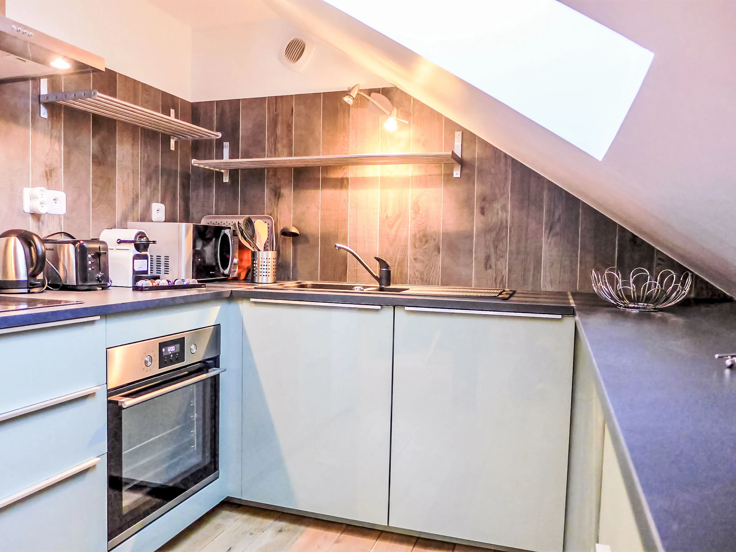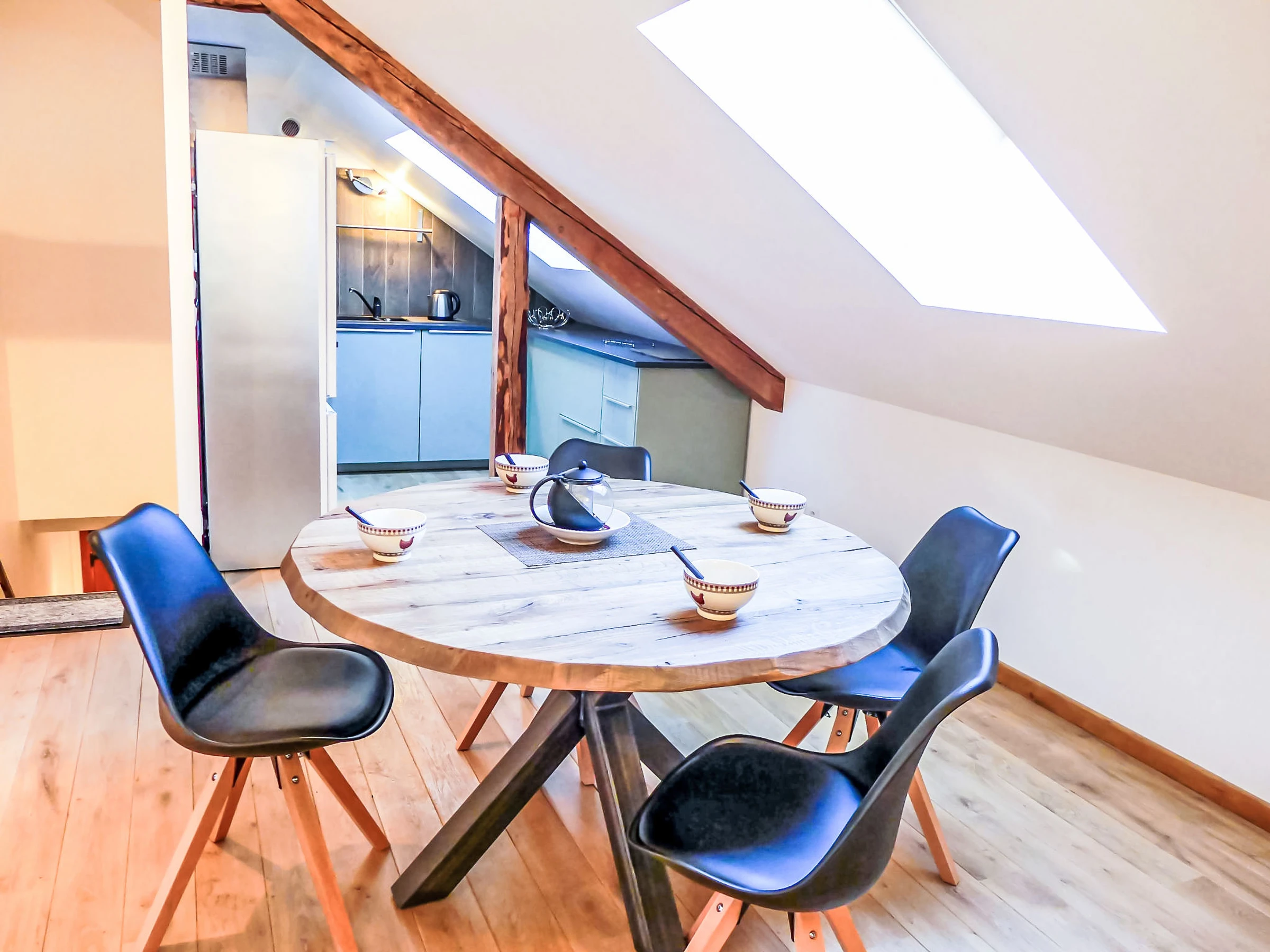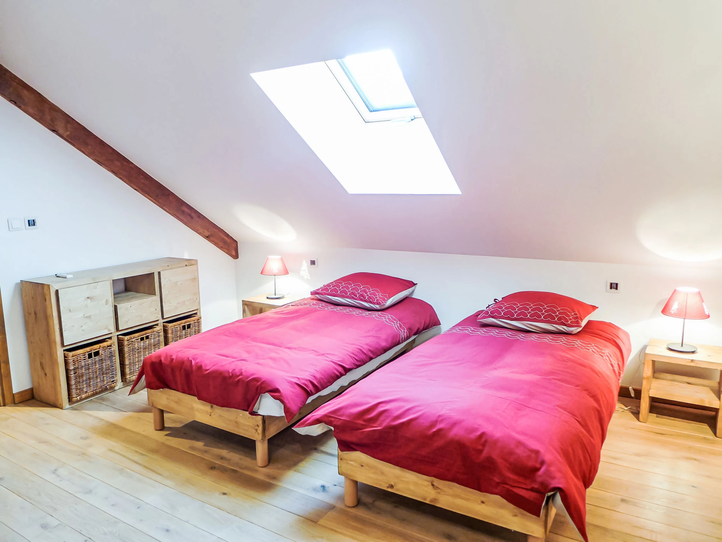 3-room penthouse 55 m2 on 2nd floor. With sloping ceilings, modern furnishings: living room with TV. 1 room with rooflight with 1 french bed (160 cm, length 200 cm). 1 room with rooflight with 2 beds (90 cm, length 190 cm). Dining room with rooflight. Open kitchen (oven, dishwasher, 2 ceramic glass hob hotplates, kettle, microwave, electric coffee machine, Capsules for coffee machine (Nespresso) extra). Bathroom, sep. WC, hydro massage bath. Electric heating. Partial view of the mountains. Facilities: washing machine. Internet (WiFi, free). Parking space n 18 et 19. Please note: non-smoking house. TV only FR. Smoke alarm. Entrance with 15 steps to access the apartment.